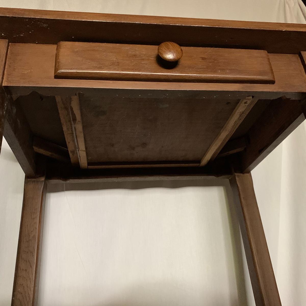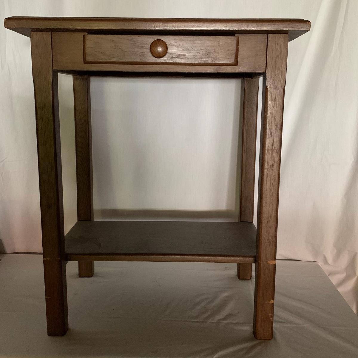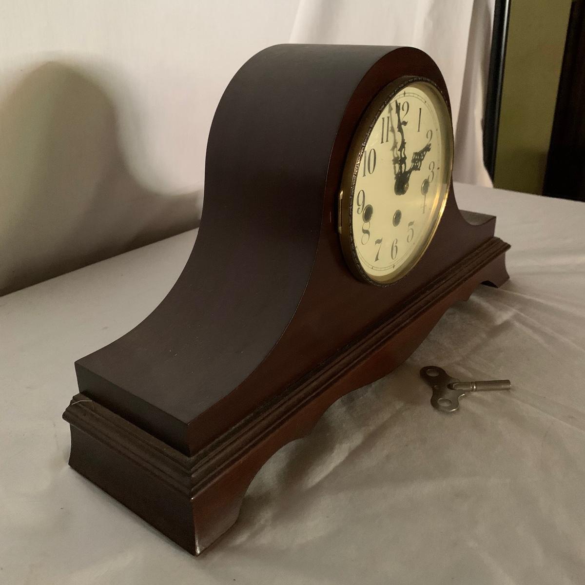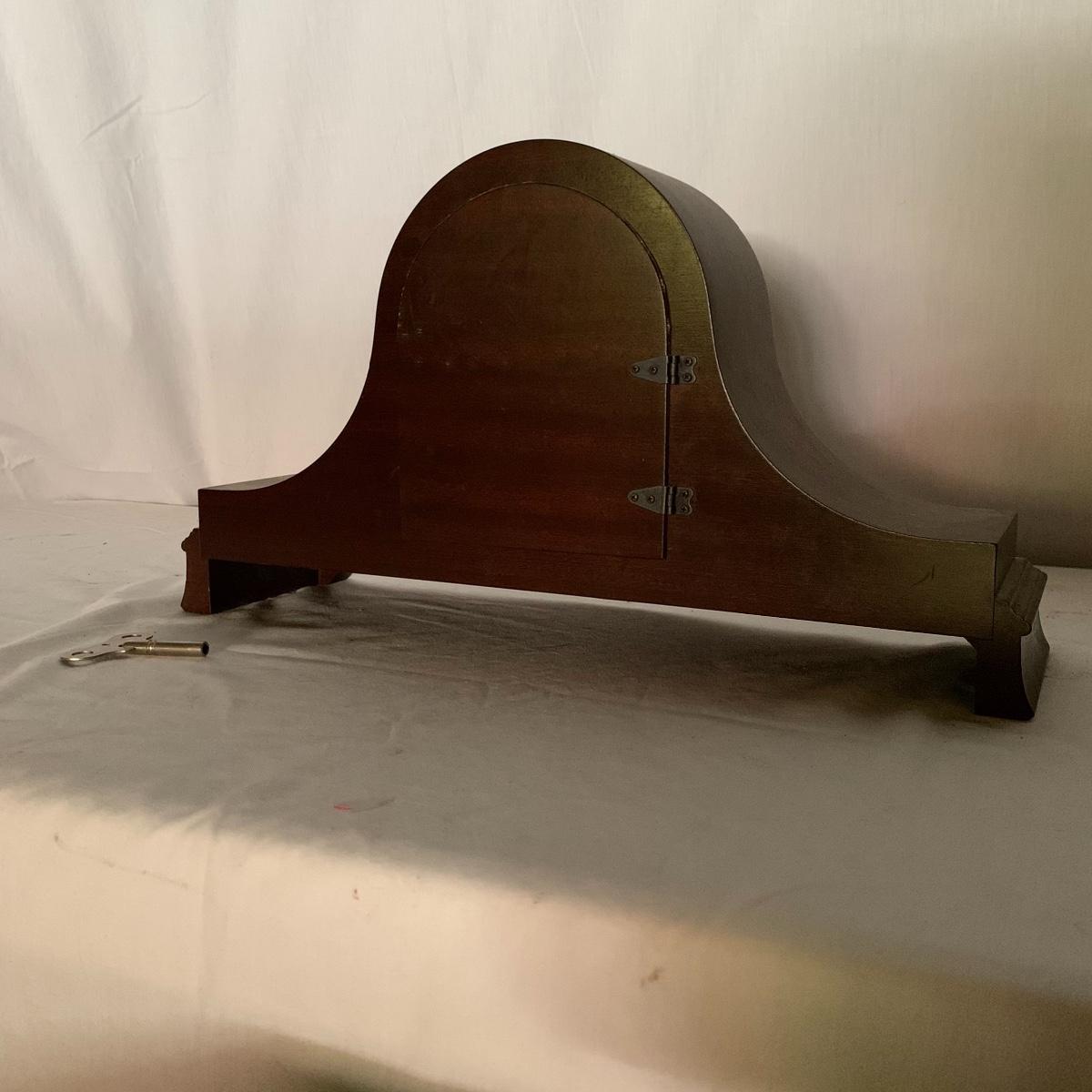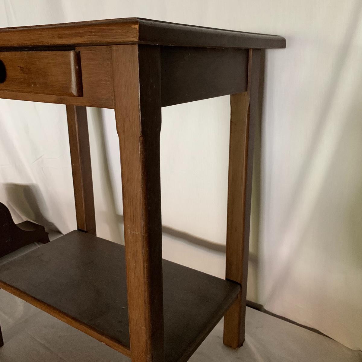 This is a lovely mantle clock and side table. The mantle clock is made of wood. It has a key to wind it. It winds and ticks. A brand name cannot be seen, but it does state that it was made in Germany. It measures 18” x 5” x 10”. The side table is also made from wood. It has one small drawer and a shelf. It shows some wear, but is in very good condition. It measures 24” x 18.5” x 28.25”. Local pickup only.