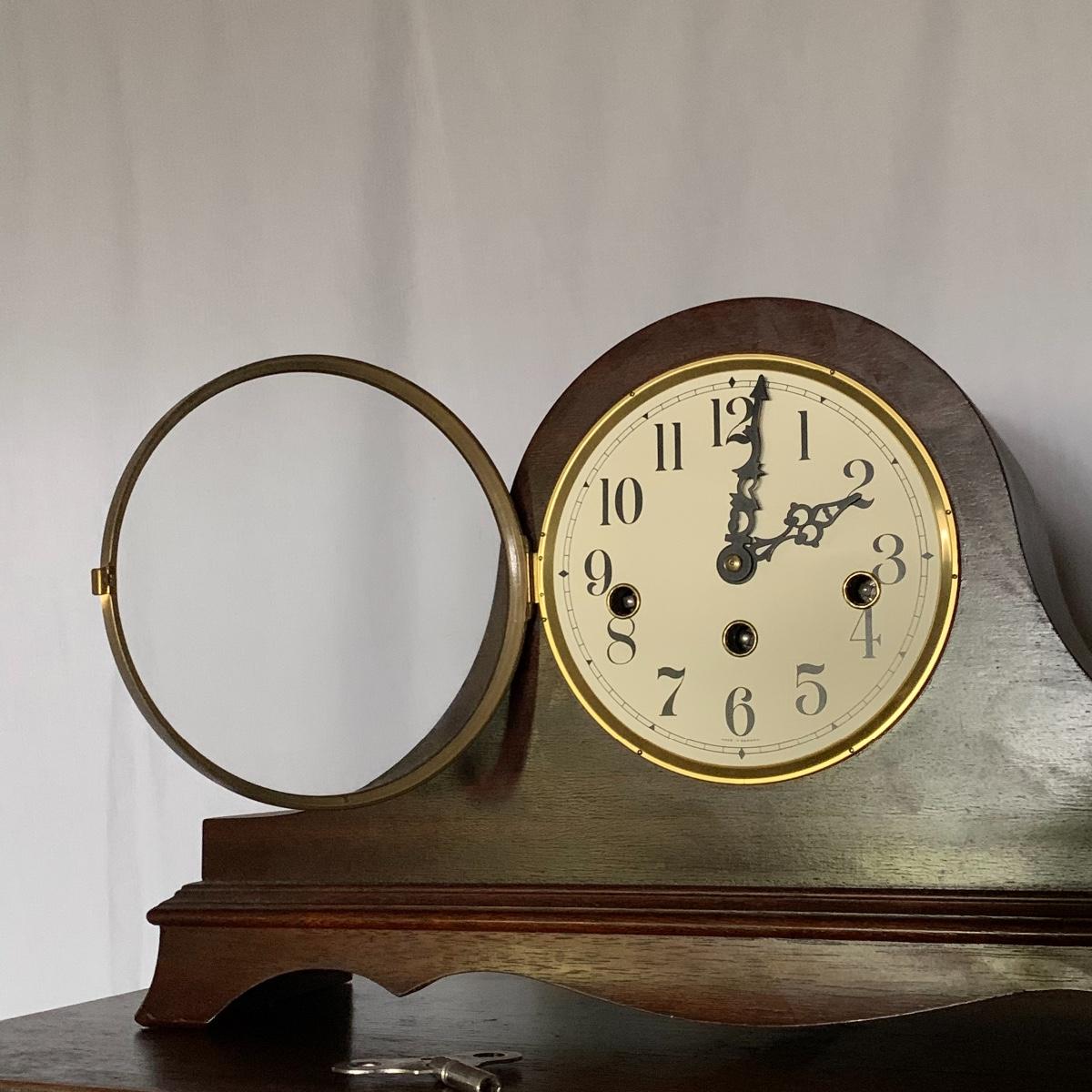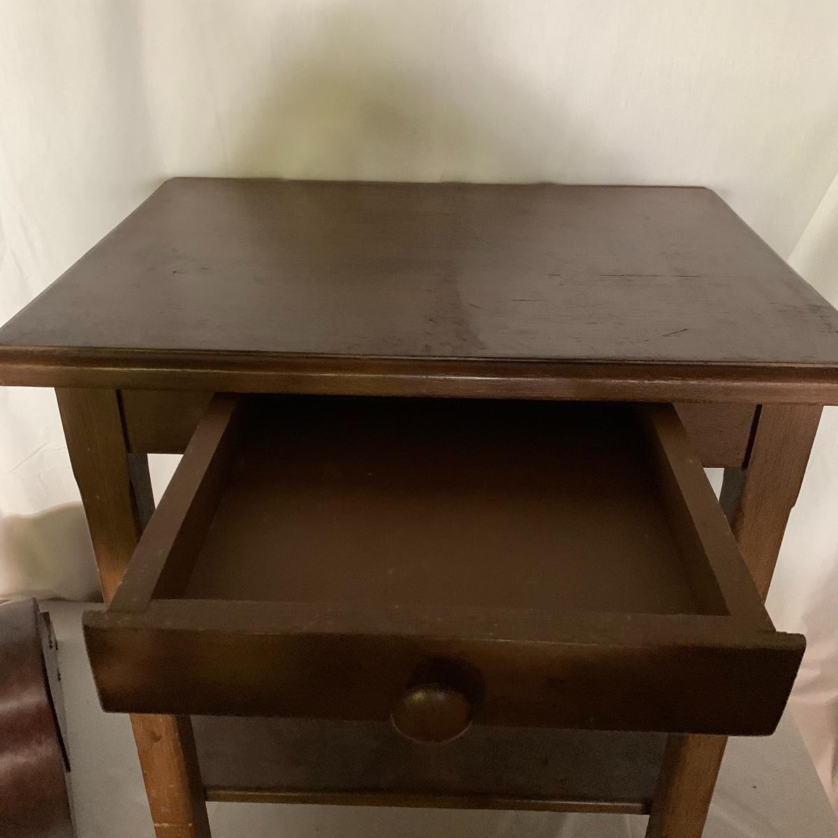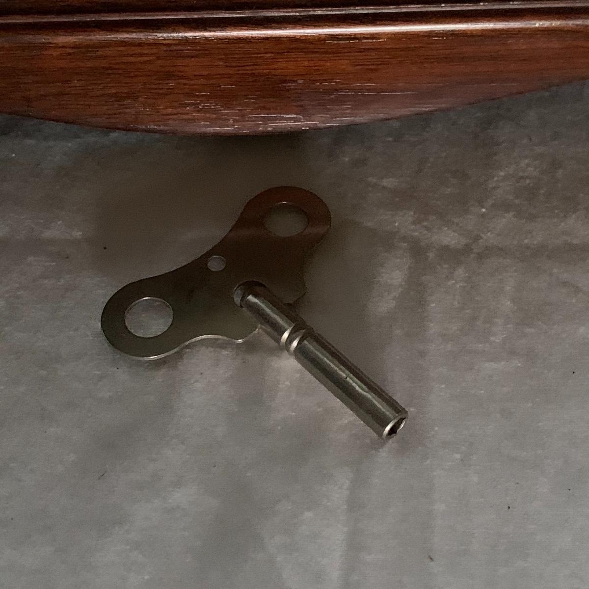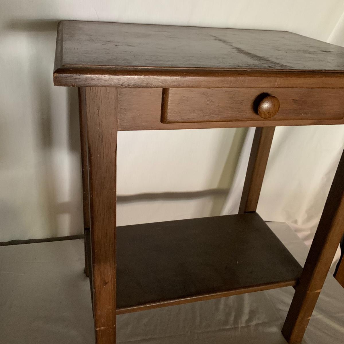 This is a lovely mantle clock and side table. The mantle clock is made of wood. It has a key to wind it. It winds and ticks. A brand name cannot be seen, but it does state that it was made in Germany. It measures 18” x 5” x 10”. The side table is also made from wood. It has one small drawer and a shelf. It shows some wear, but is in very good condition. It measures 24” x 18.5” x 28.25”. Local pickup only.