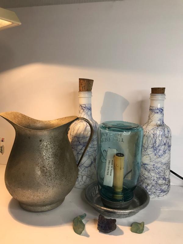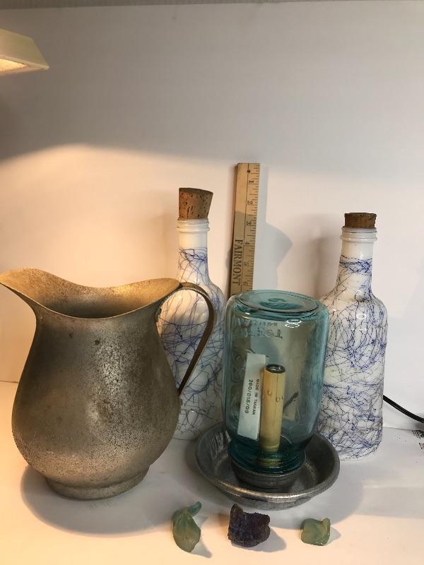 Mason Jar Light electric, decorative bottles, and a pitcher full of glass broken pieces antique. Please see all pictures for content of the lot, condition of the lot, and measurements if taken. Pictures are the best representation of the items listed and items are untested unless indicated in description. Thank you for looking and have fun bidding!