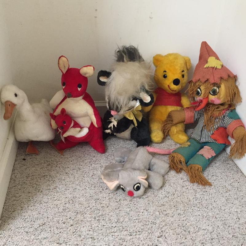 Assortment of collectible stuffed animals. Winnie the Pooh, skunk, scarecrow, duck and more. Pooh measures 14” Tall. Collection could use a cleaning and is intended more for a collector than a child. No shipping.