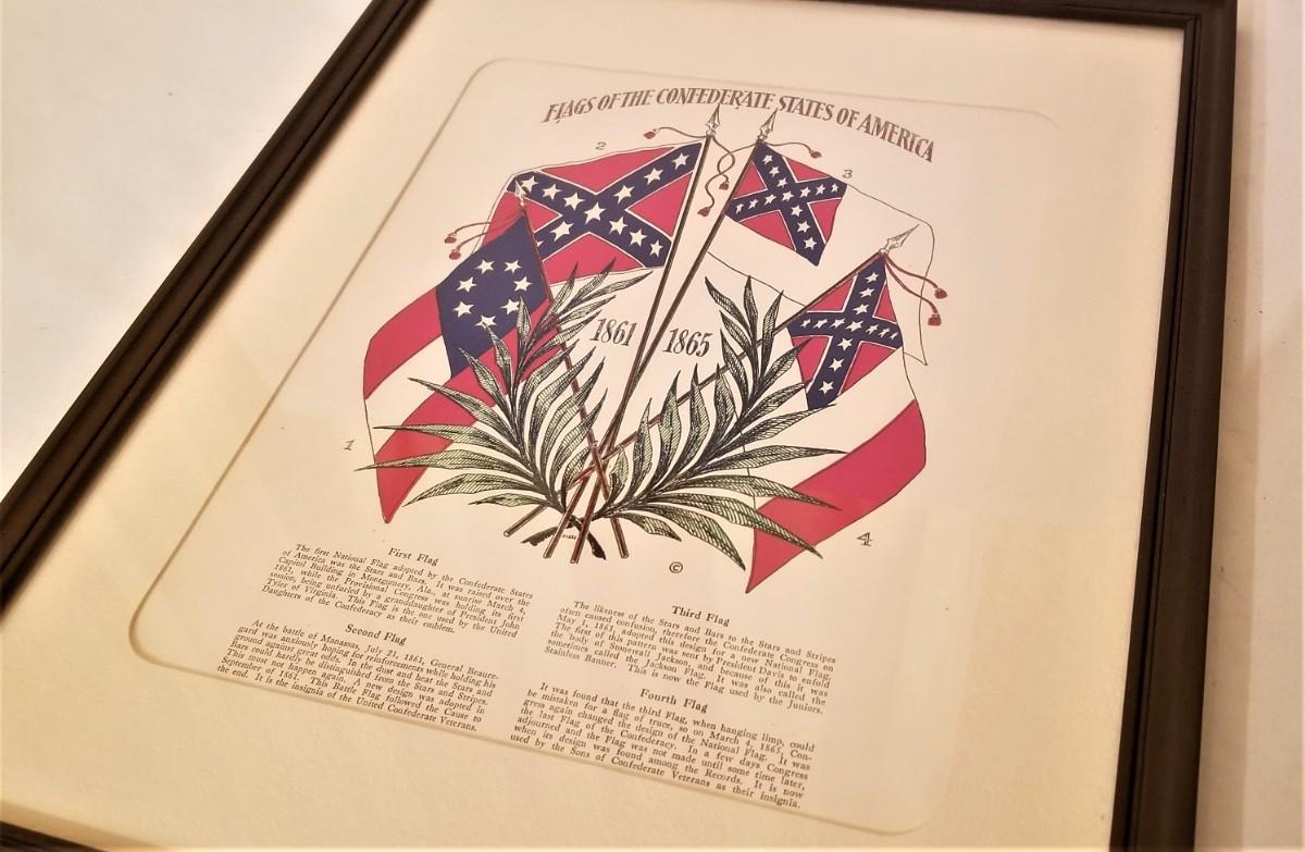 Handsome vintage print featuring the flags of the Confederate States of America - framed and matted. Measures 12" x 14.5". Good condition.