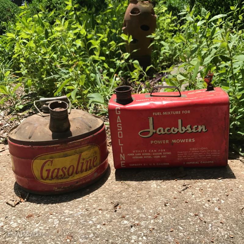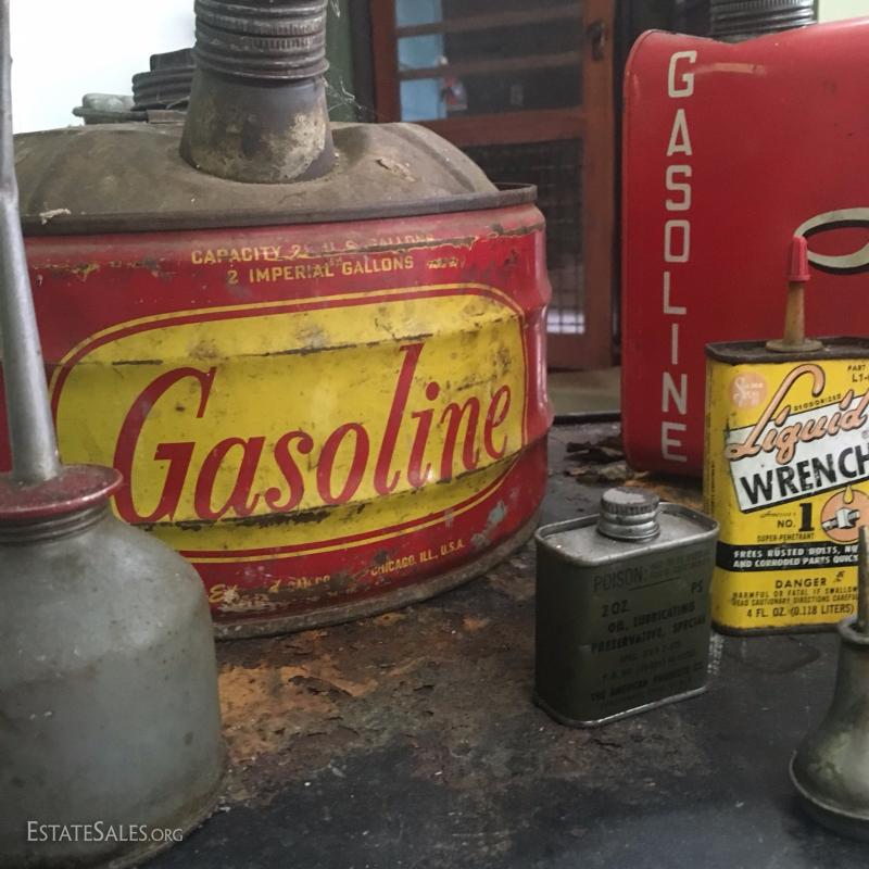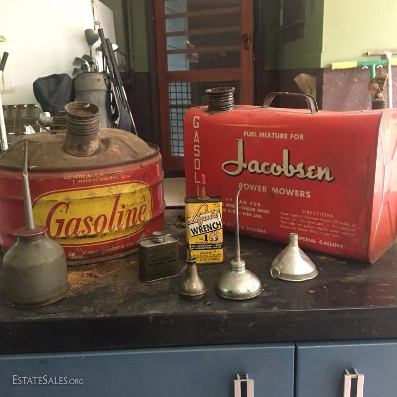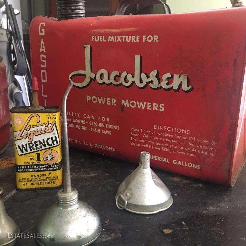 Red round oil gas can with handle 12"diameter from Edward Can Co in Chicago. Jacobson Gas Container 13"l x 8"w x 5.5" deep. Vintage Liquid Wrench oil dispenser. Other misc oil containers