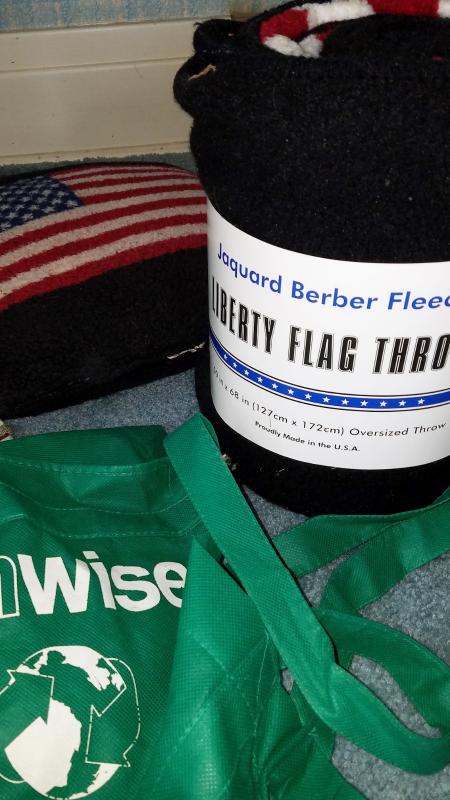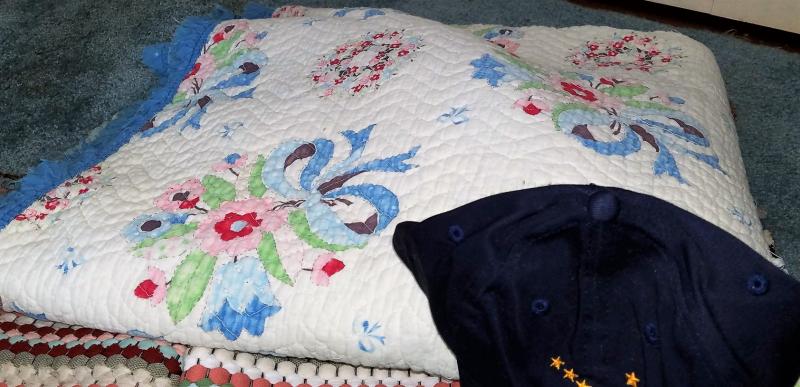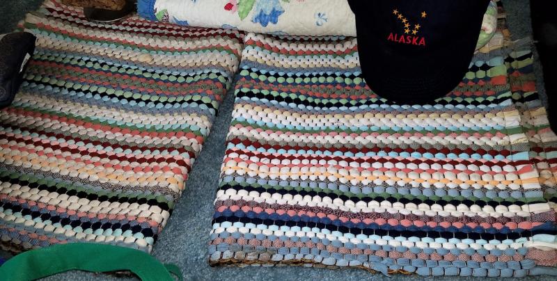 Throw rugs are hand woven nylon same size quilts is ribbon and flower OK with blue trim and white bass pink and green floral pattern. Flag throw and pillow and the napping throw rugs and the color of gray red blue green light pink yellow brown
