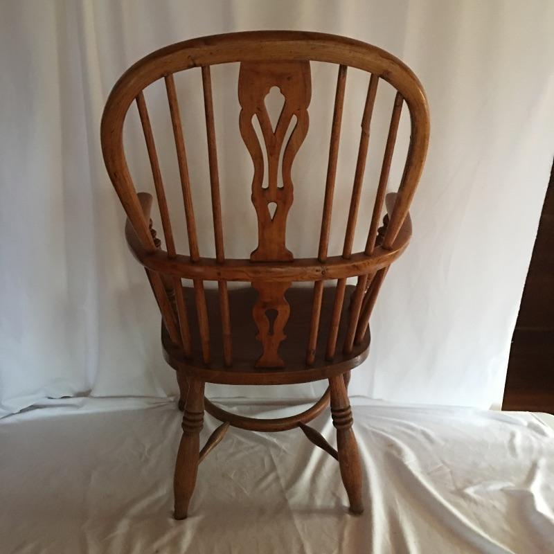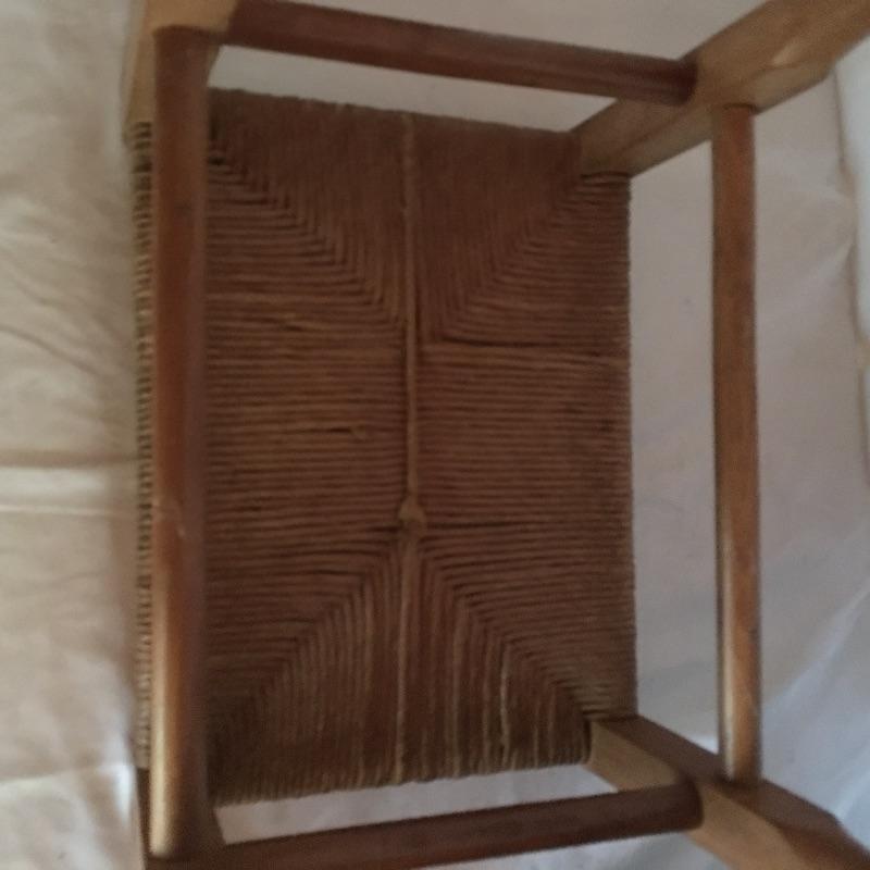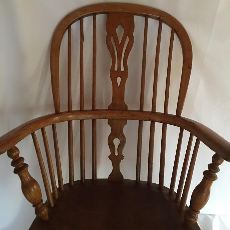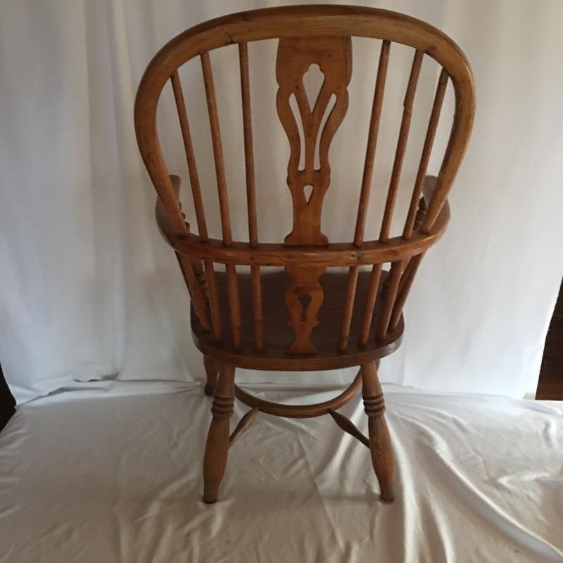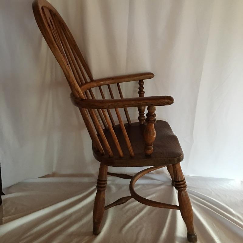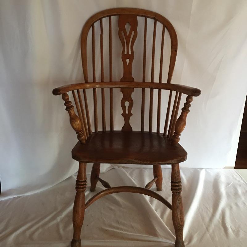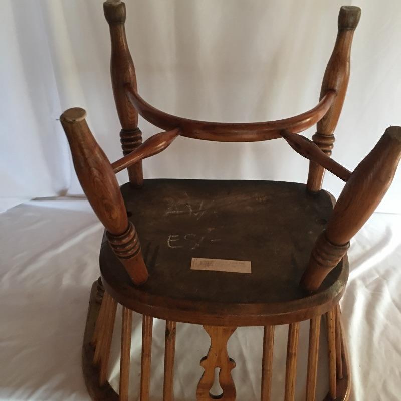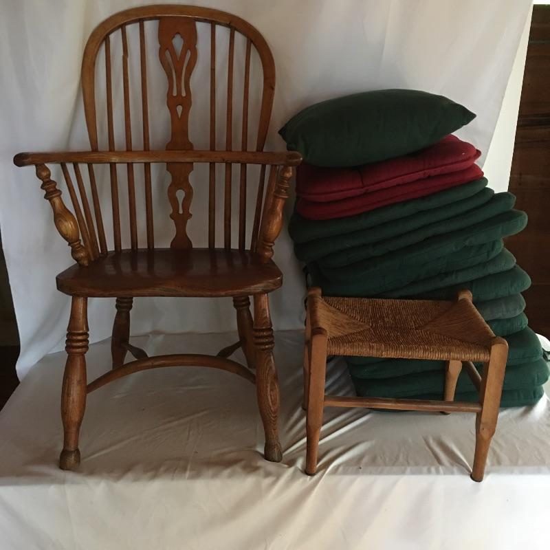They don’t make chairs like this anymore. This Windsor chair is in excellent shape with one broken spindle, see pictures. Also included is a woven stool and over ten seat cushions. On the bottom of chair the sticker says chair is made from yew and English oak, circa 1740, we cannot guarantee these facts, but it is a beautiful chair. Chair measures 18” x 22.5” x 37” with a seat height of 15.5”.