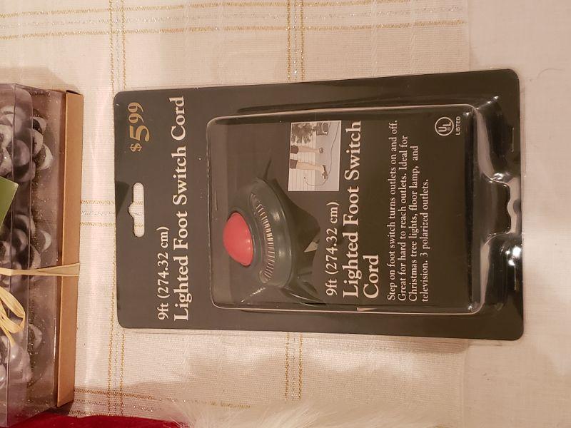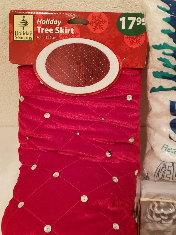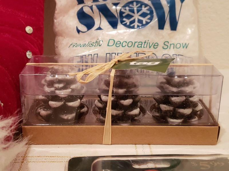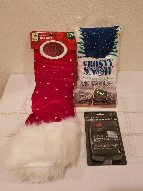 Lot 229: NEW Tree Skirt, Pinecone Candles, Foot Switch for Christmas Tree & Bag of Snow