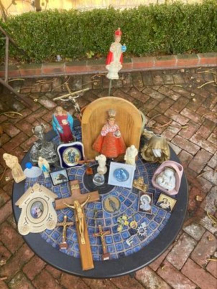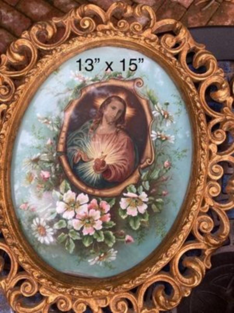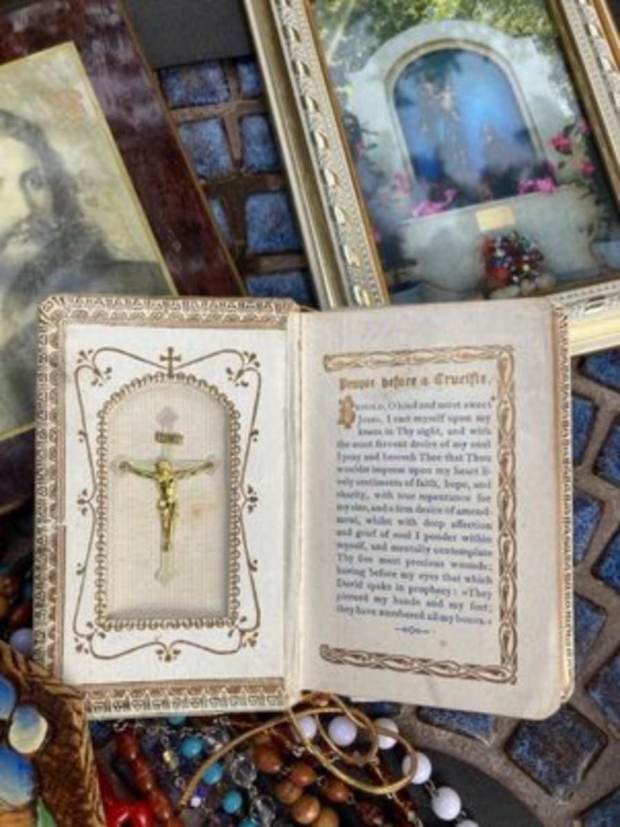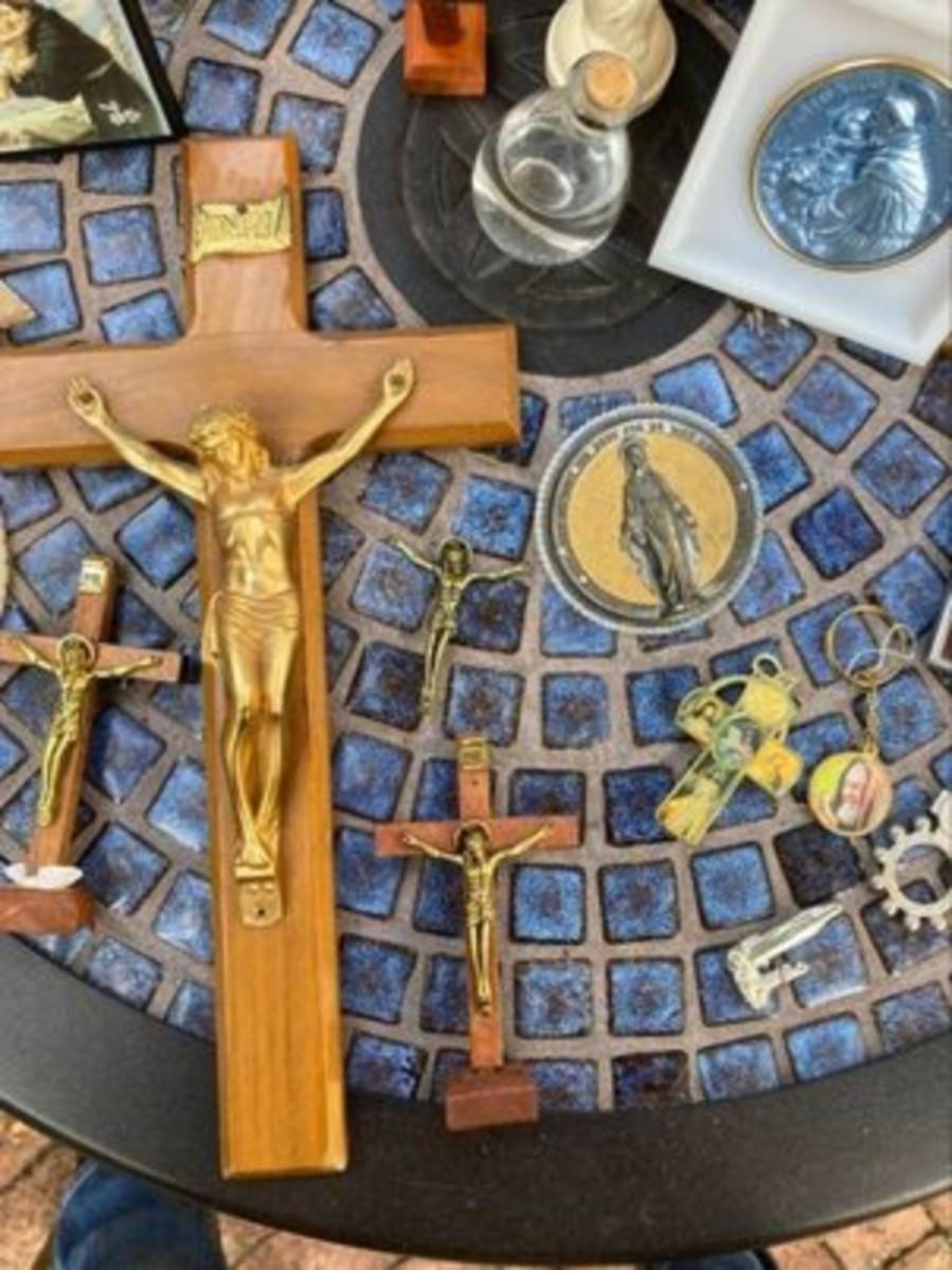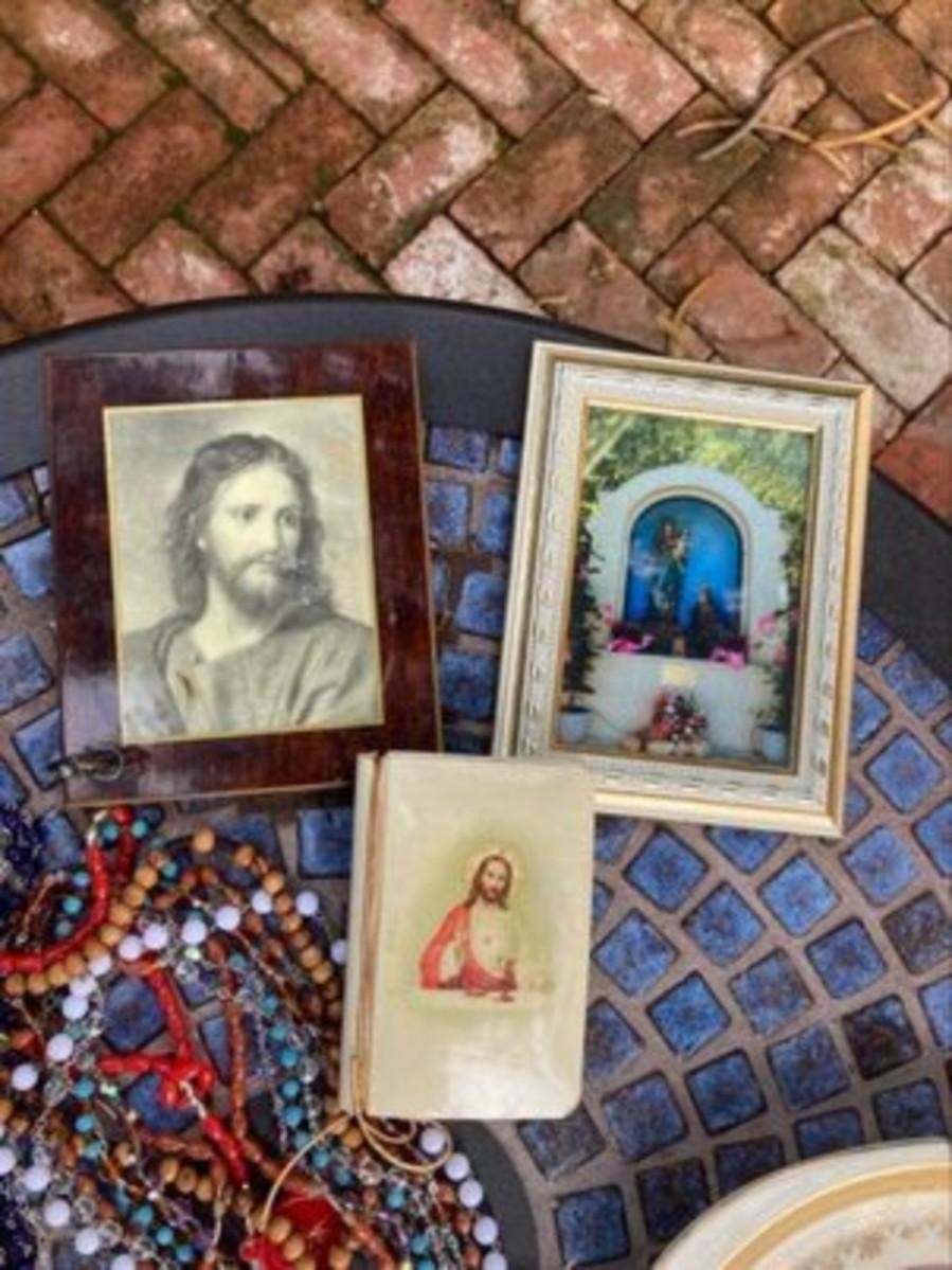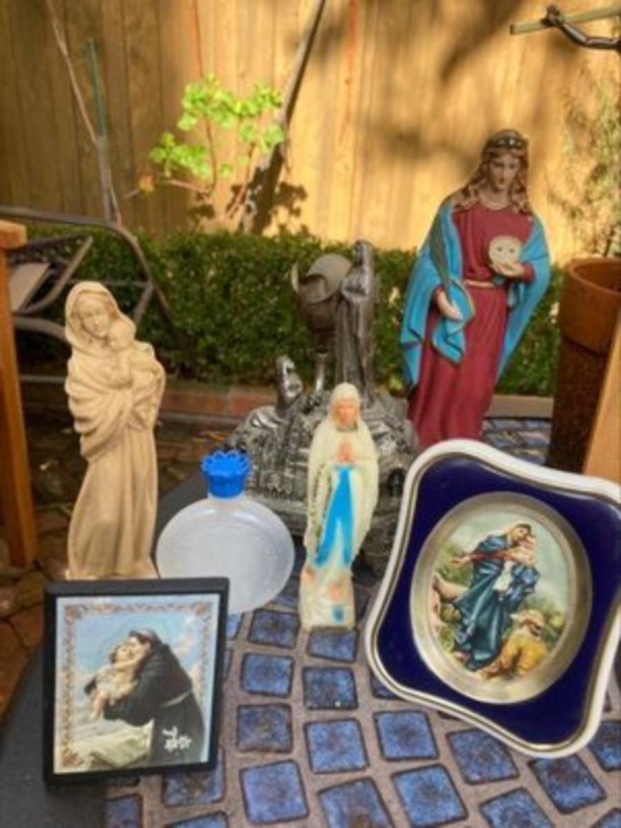 Crosses, statues framed icons, vases, Lourdes night light music box (untested), a collection of rosary beads. Framed art ranges from 13" x 15" to 5" x 7"