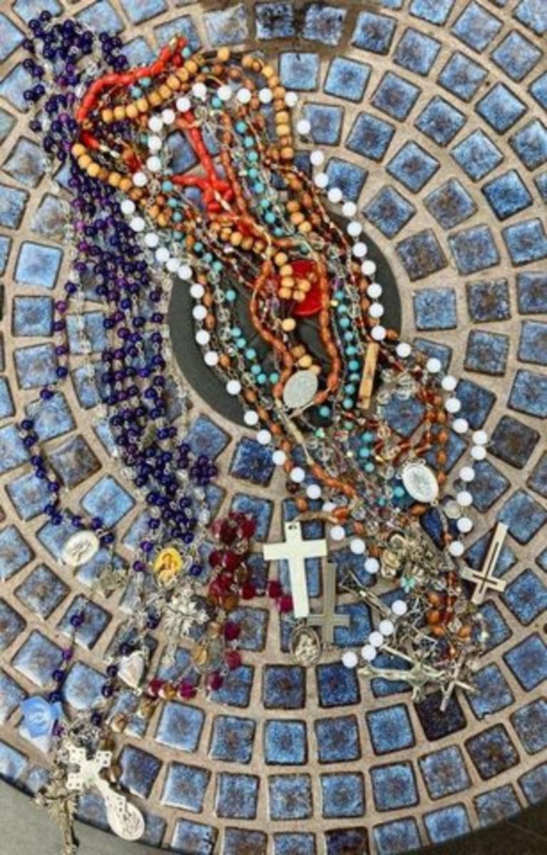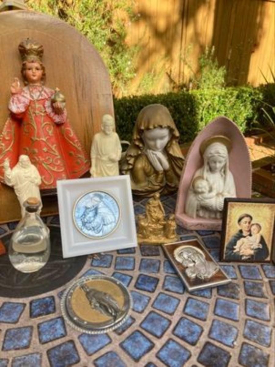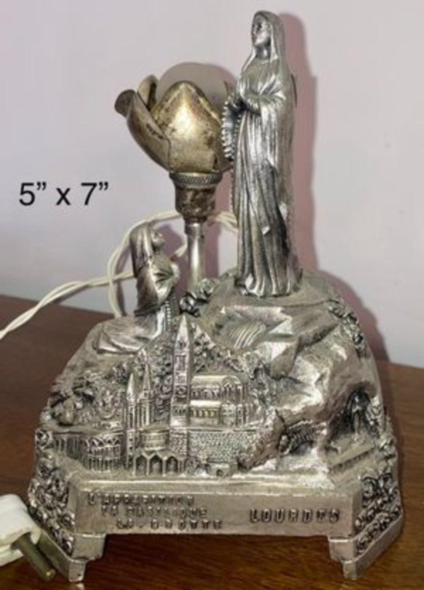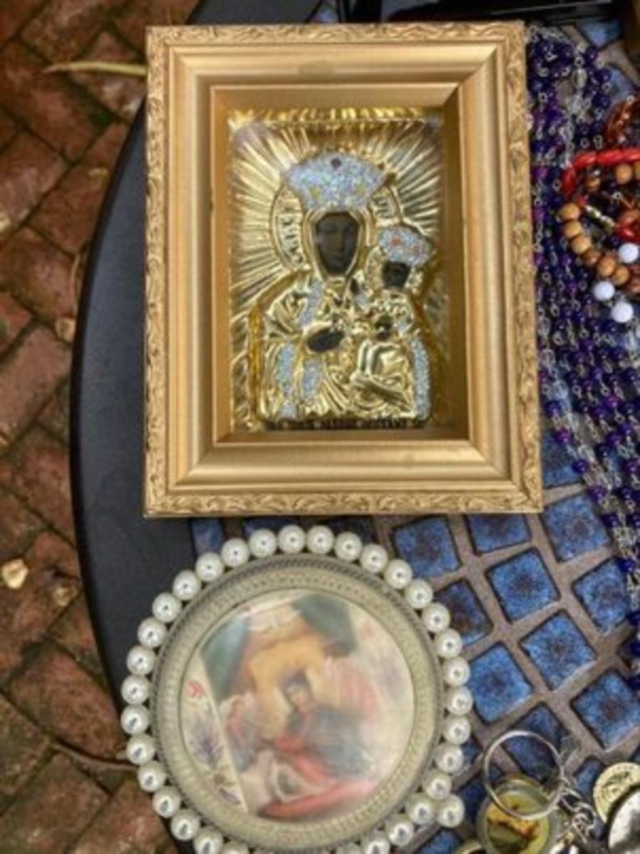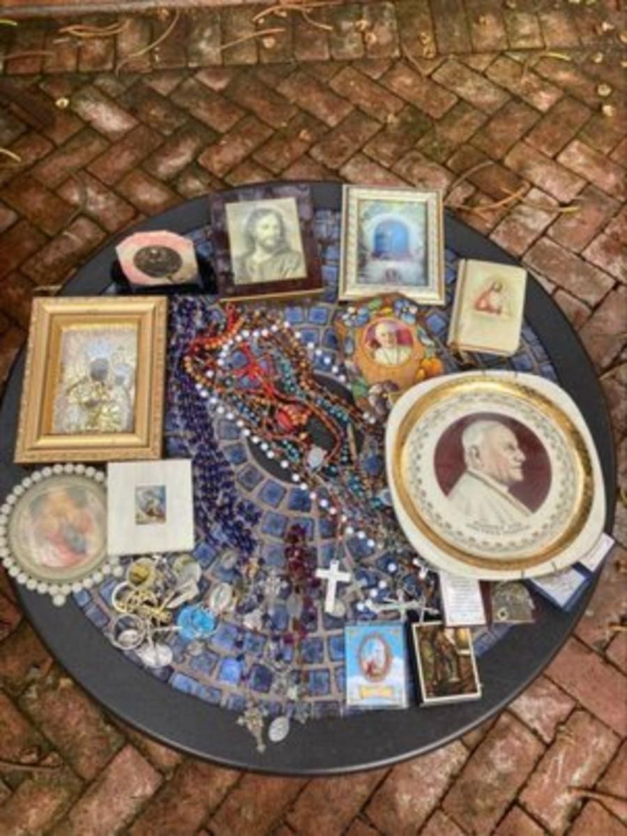 Crosses, statues framed icons, vases, Lourdes night light music box (untested), a collection of rosary beads. Framed art ranges from 13" x 15" to 5" x 7"
