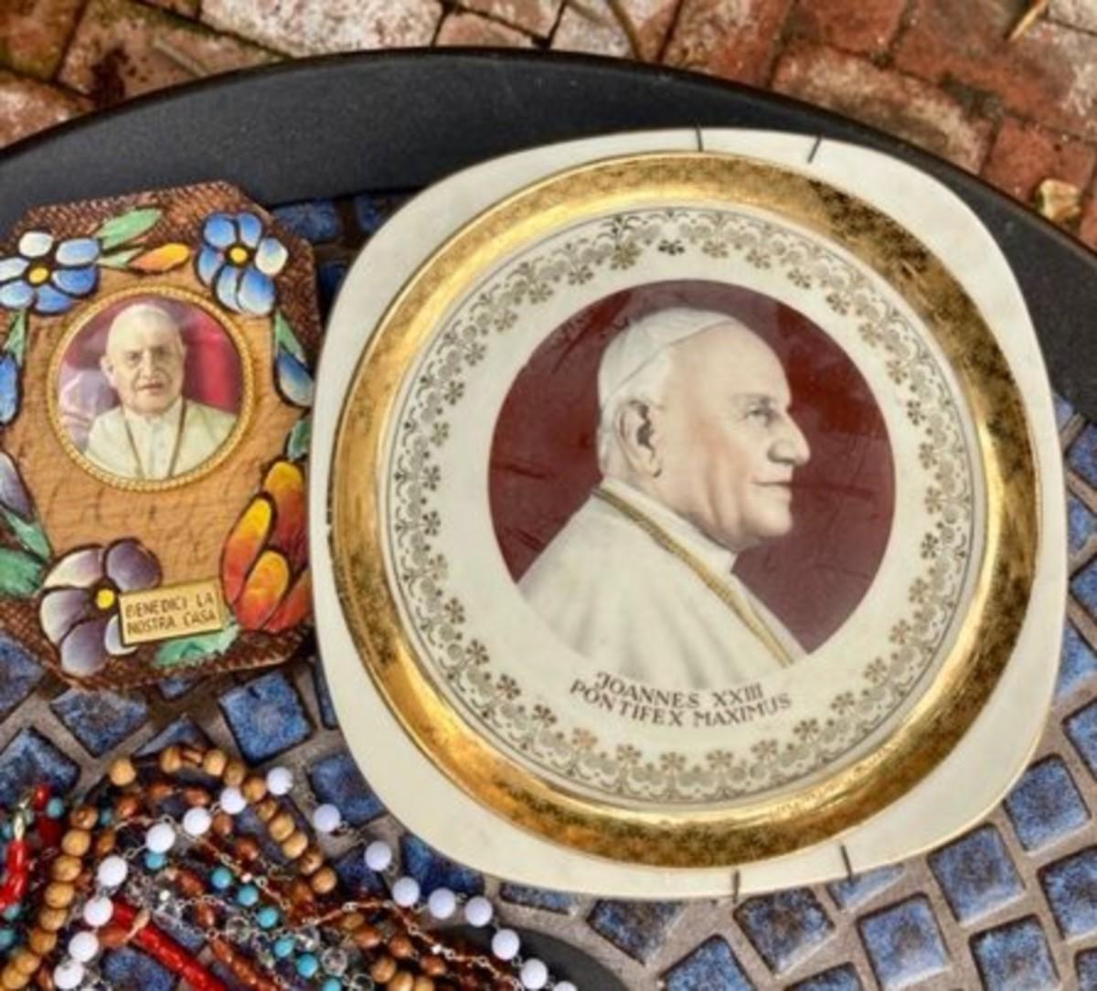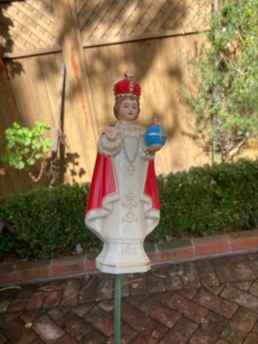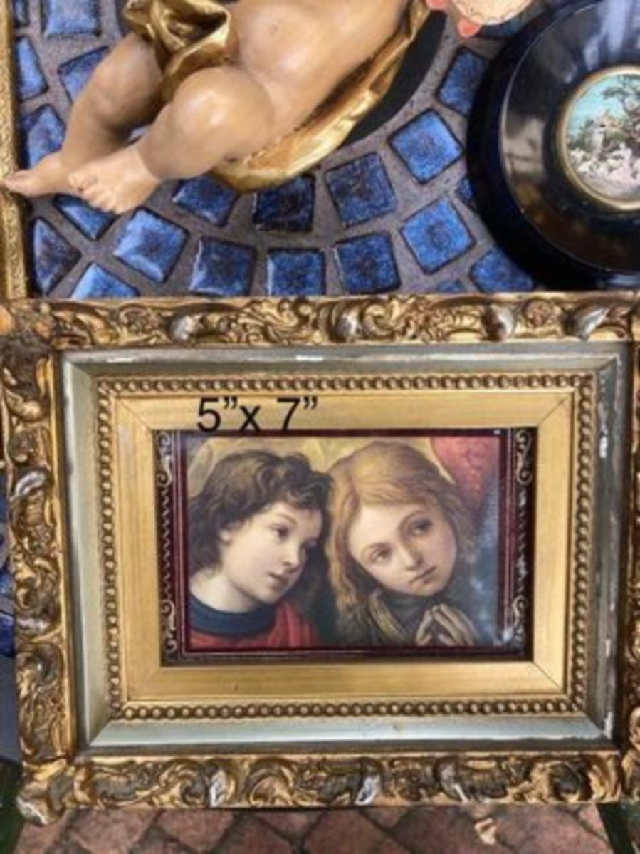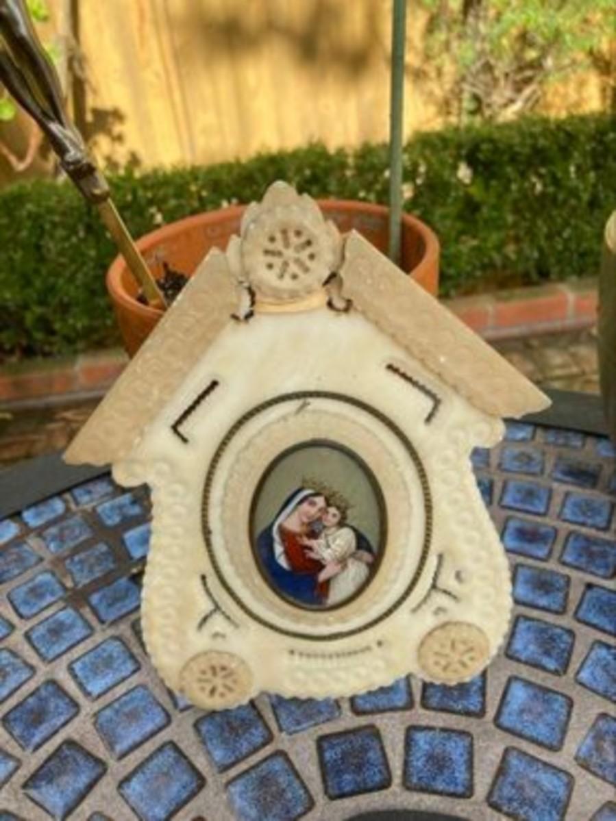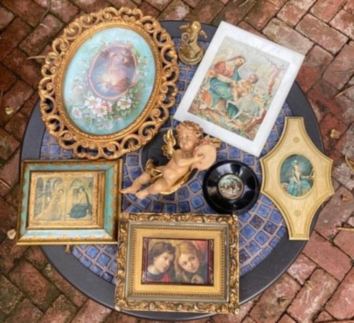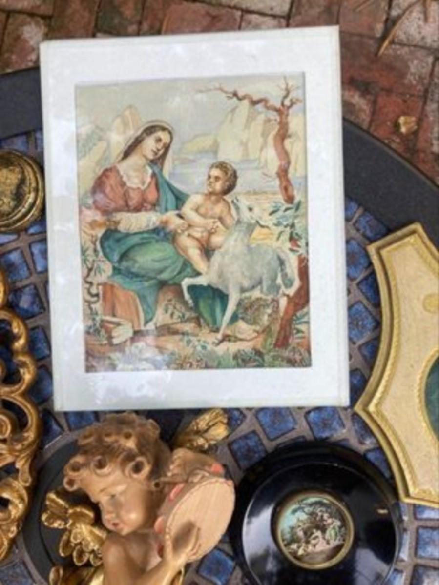 Crosses, statues framed icons, vases, Lourdes night light music box (untested), a collection of rosary beads. Framed art ranges from 13" x 15" to 5" x 7"