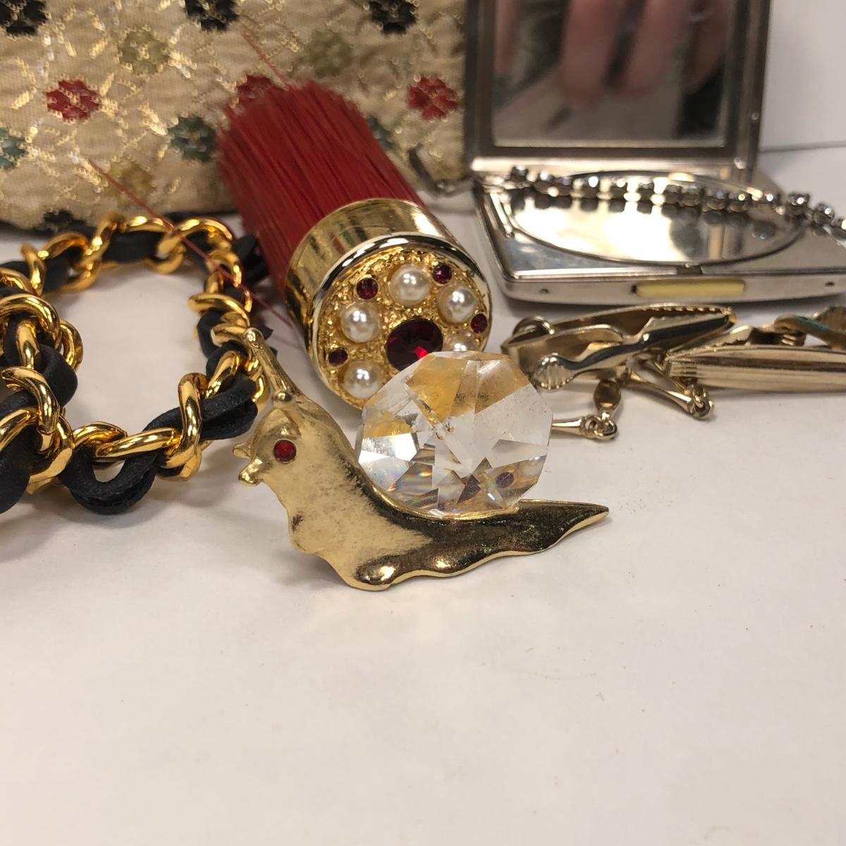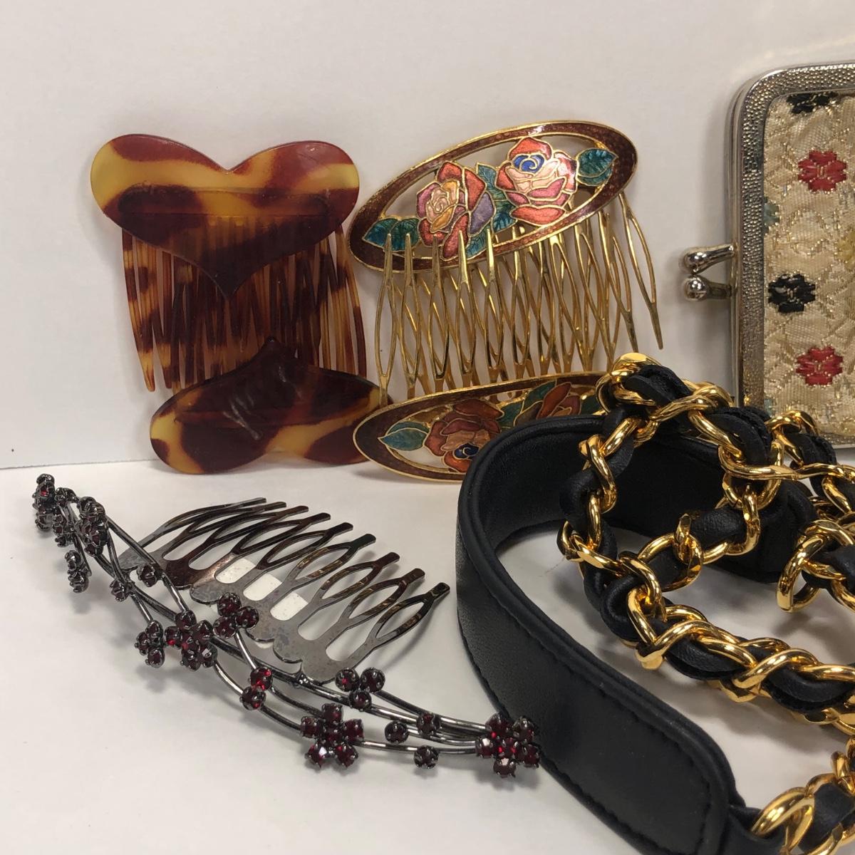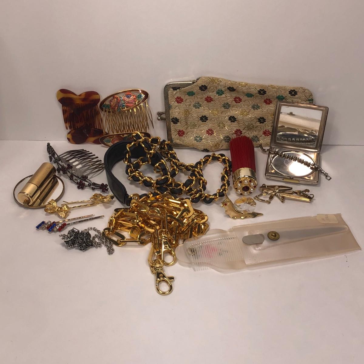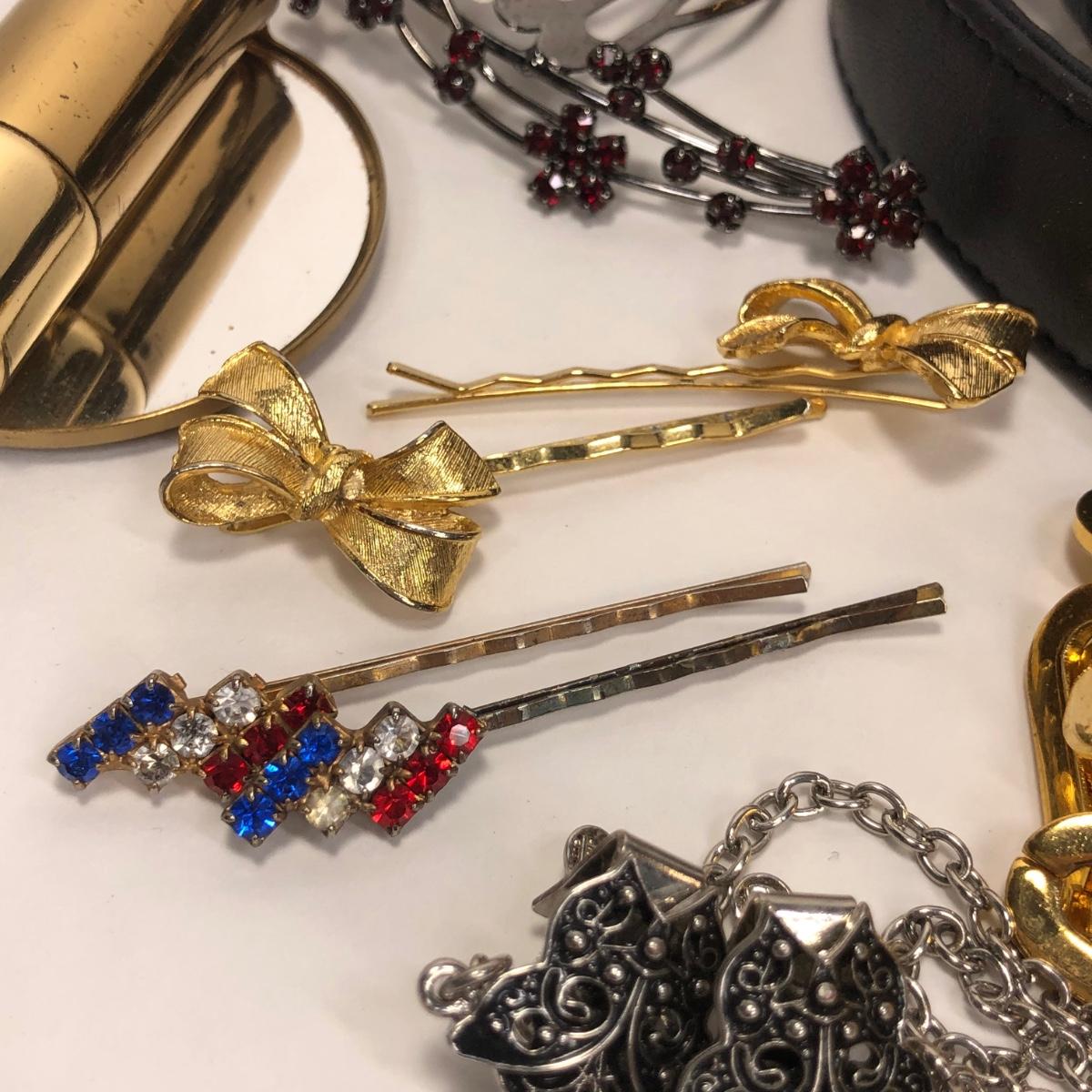 LOT 229: Vintage Ladies Collection - Sweater Clip, Las Vegas Lipstick Holder, Hand Painted Comb & File Case, Hair Accessories & More