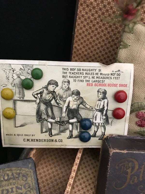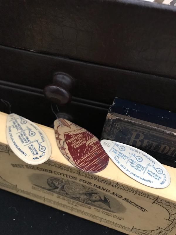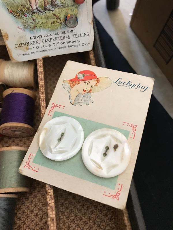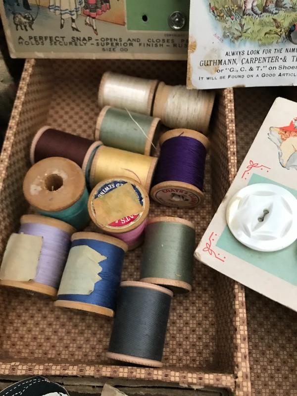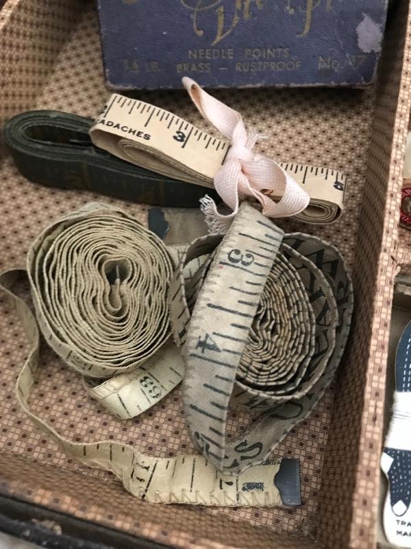 This unique lot includes old sewing boxes (one of which is from 1882), antique buttons, measuring tapes, needle holders, needle threaders, and more. Box with drawers is approx. 12” x 10” x 7”. See pics. Shipping available.