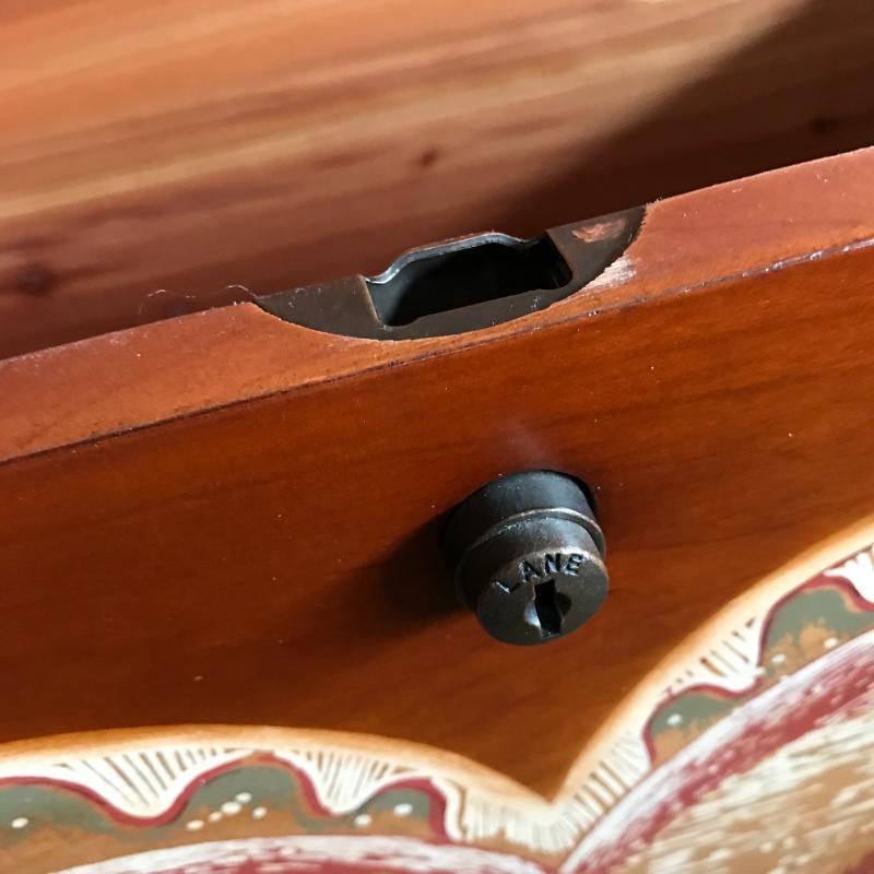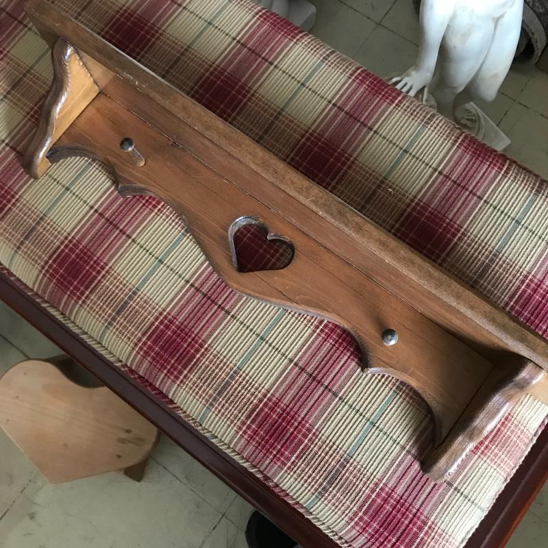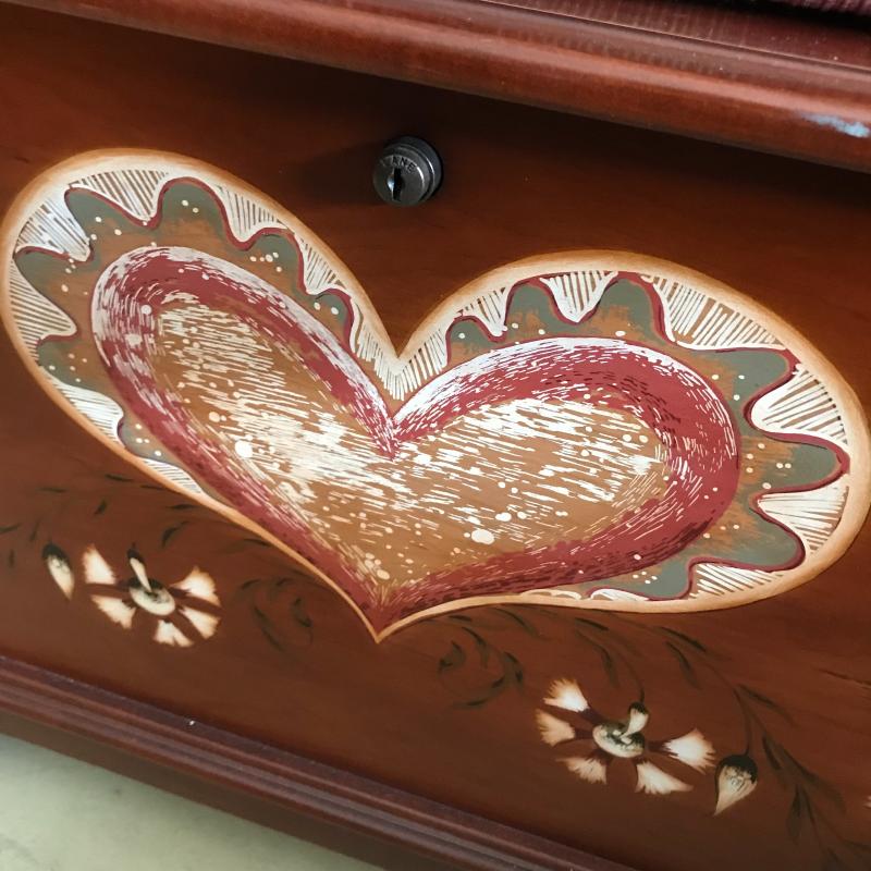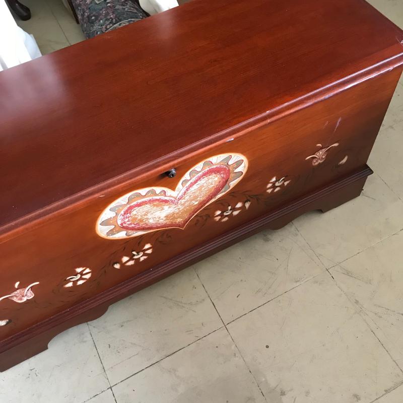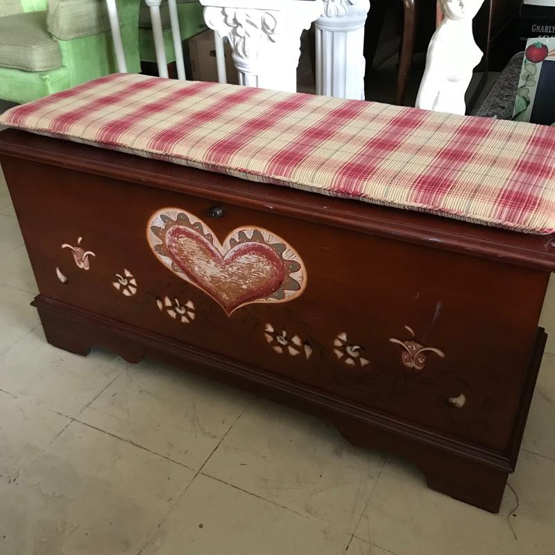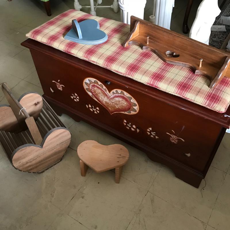 Lot includes Lane trunk with lock and key (approx. 42” x 15” x 21.5”), small heart-shaped stool, two shelves, and wooden heart shaped basket. See pics. No shipping available. Local pickup only in Maggie Valley, NC.