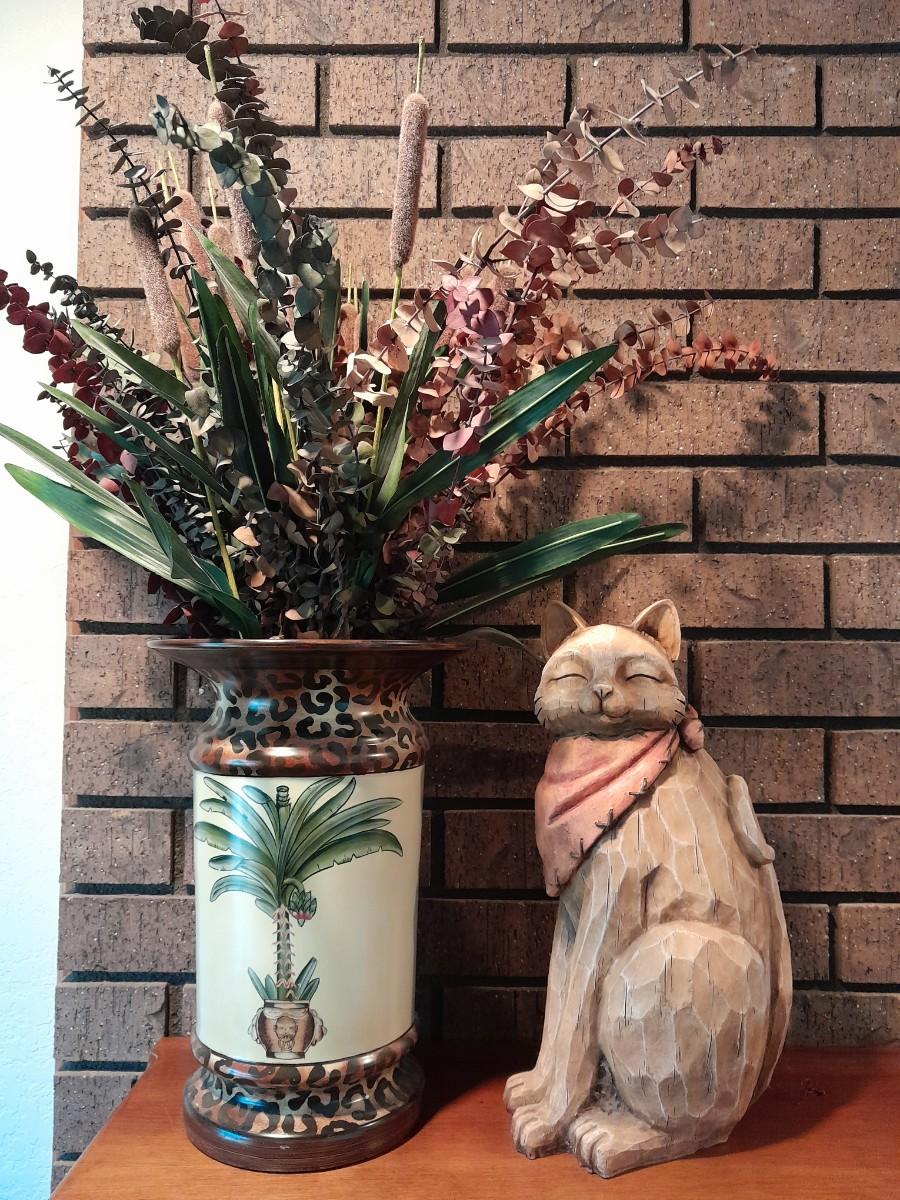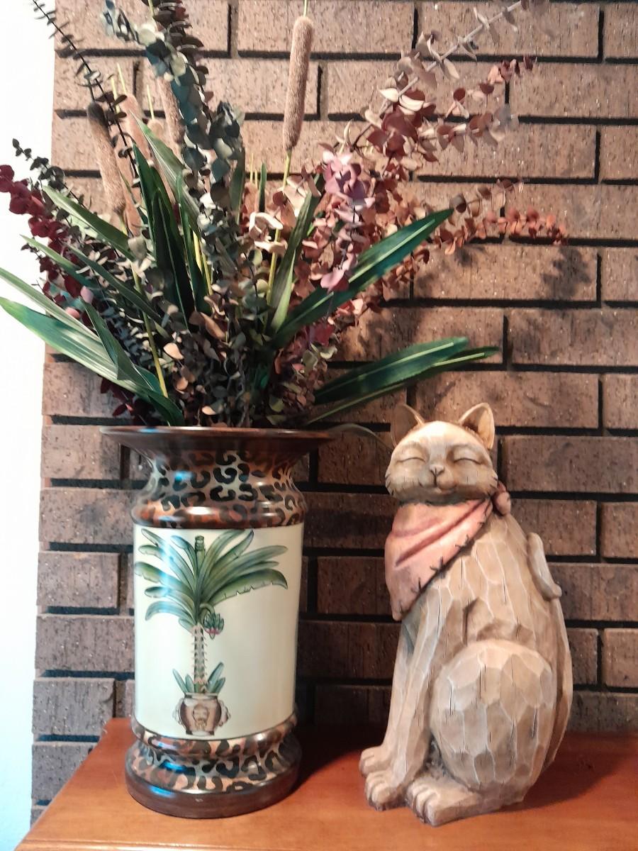 LOT 229 DECORATIVE VASE WITH FAUX FLOWERS AND A CAT STATUE
