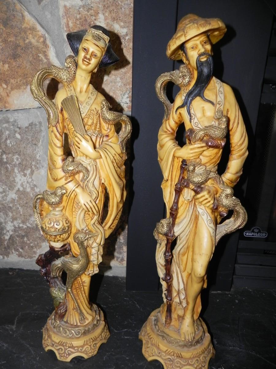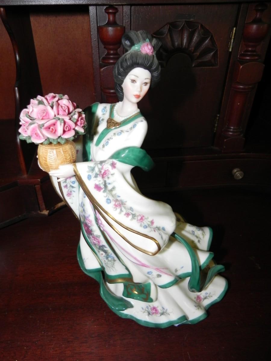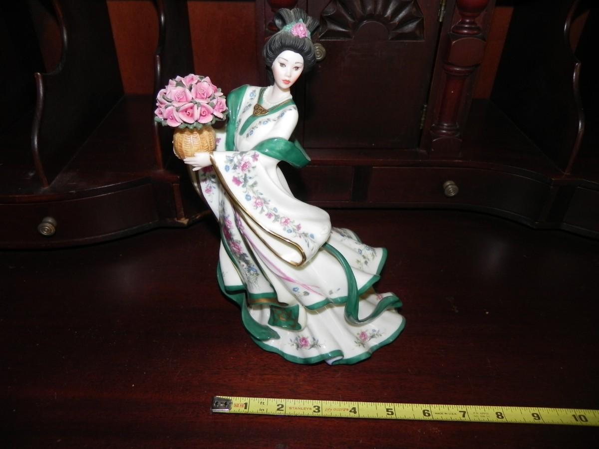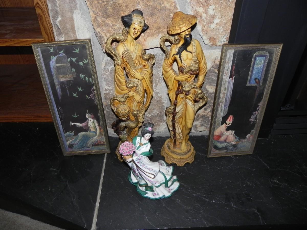 THE "ROSE PRINCESS" FIGURINE BY DANBURY MINT, 2 WOODEN HAND CARVED ASIAN FIGURINES MEASURING 19" TALL AND 2 ASIAN THEMED WALL ART