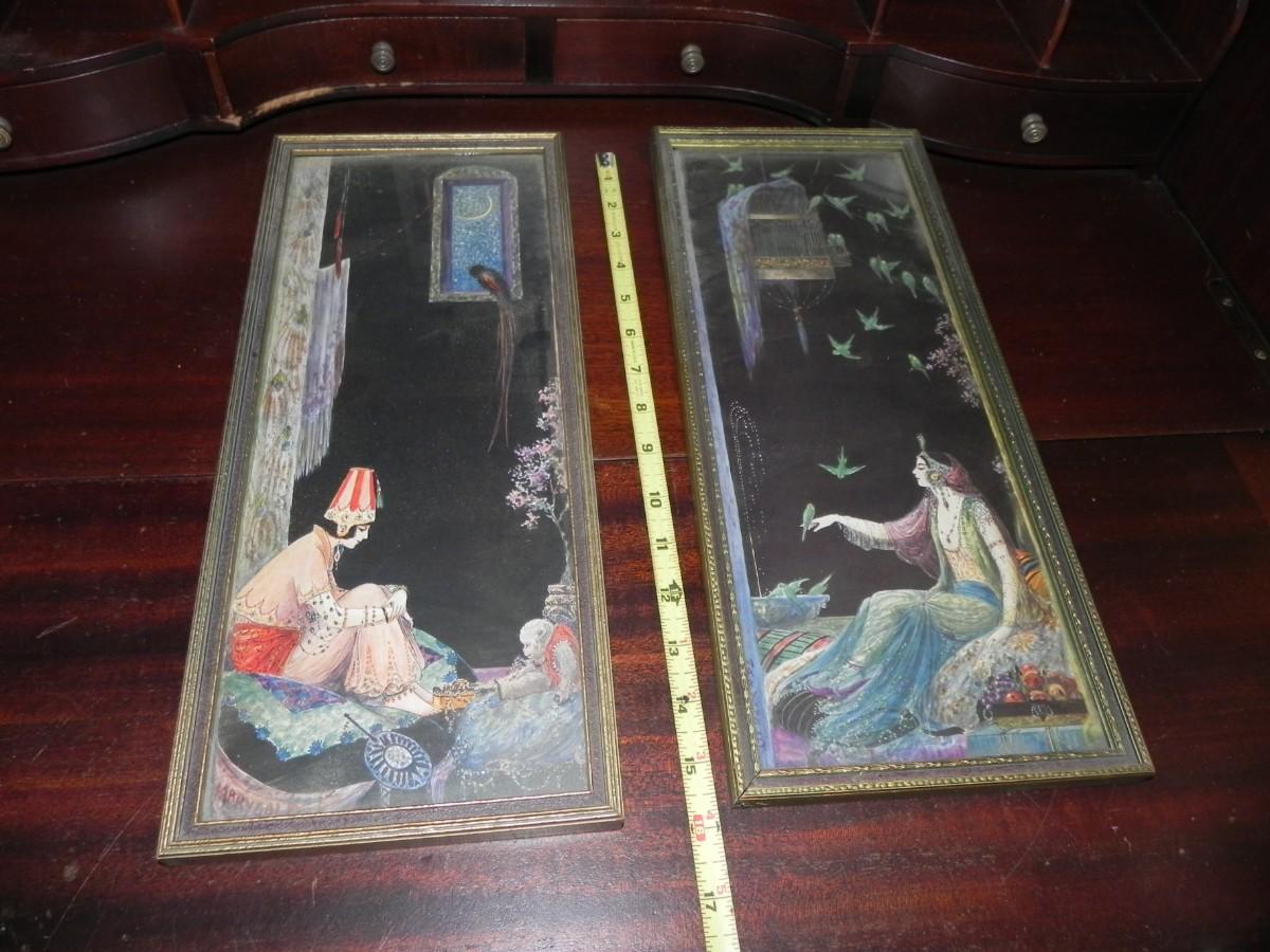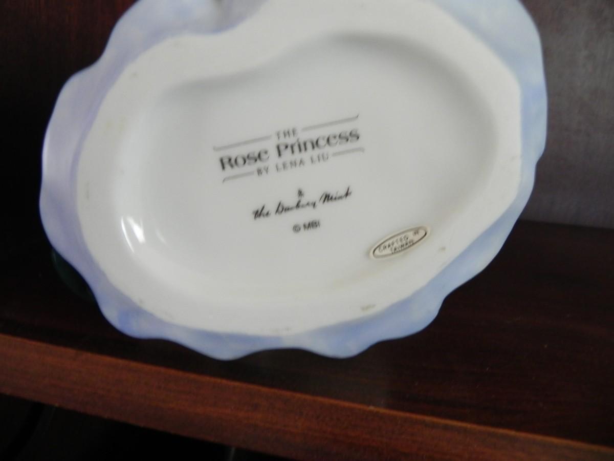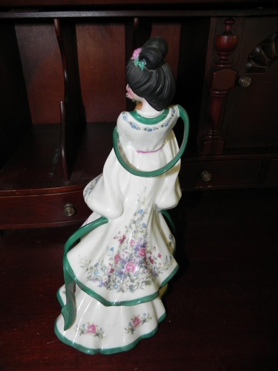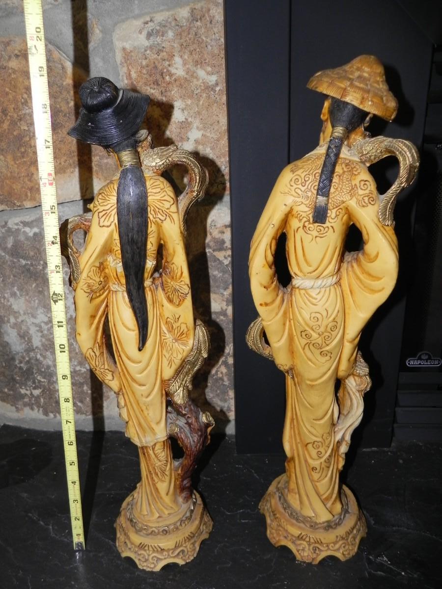 THE "ROSE PRINCESS" FIGURINE BY DANBURY MINT, 2 WOODEN HAND CARVED ASIAN FIGURINES MEASURING 19" TALL AND 2 ASIAN THEMED WALL ART
