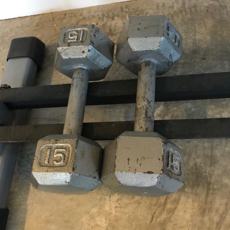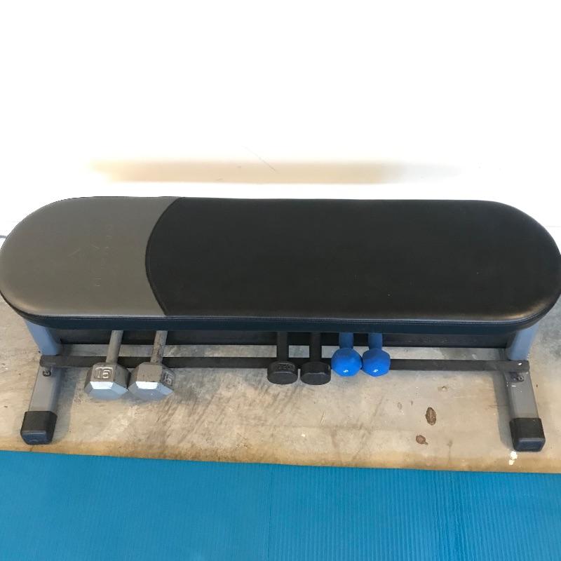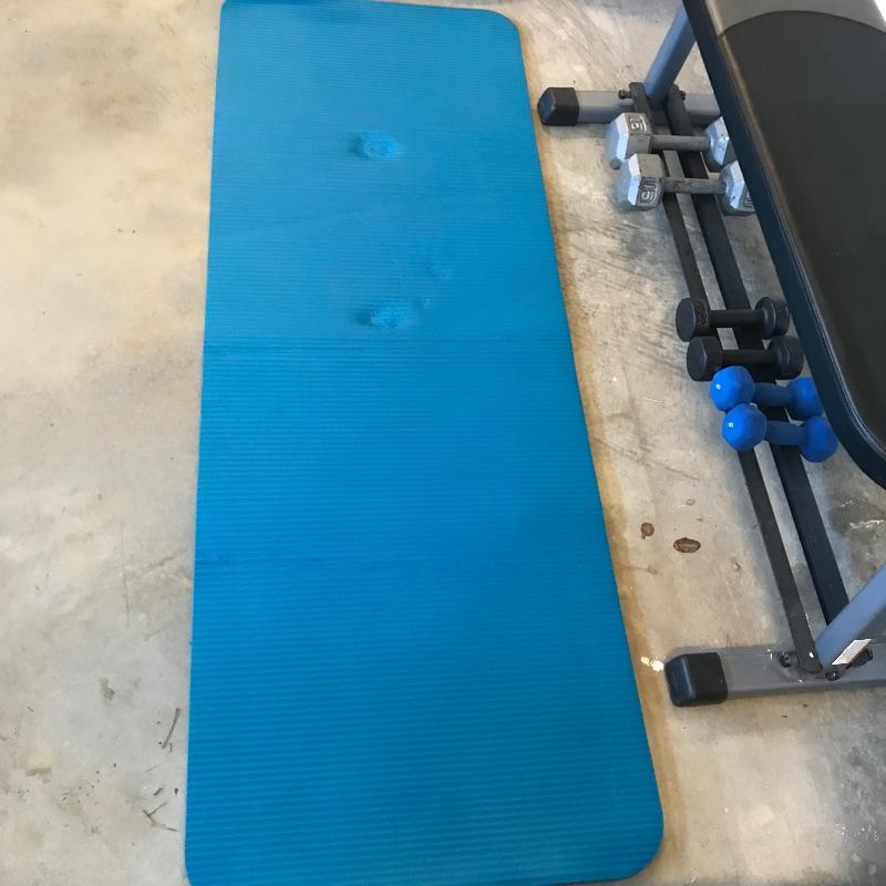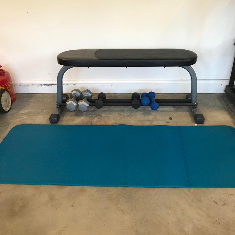 Tired of that busy gym? Here we are, just in time to keep New Year’s resolution! Fitness Gear weight bench complete with four 5lb and two 15lb weights. Bench is sturdy and in nice shape measuring 48” x 17” x 19.5”. Lot also includes a teal 1/2 inch thick foam mat measuring 67” x 24”. Here’s to keeping your goals in the comfort of your home! No shipping.