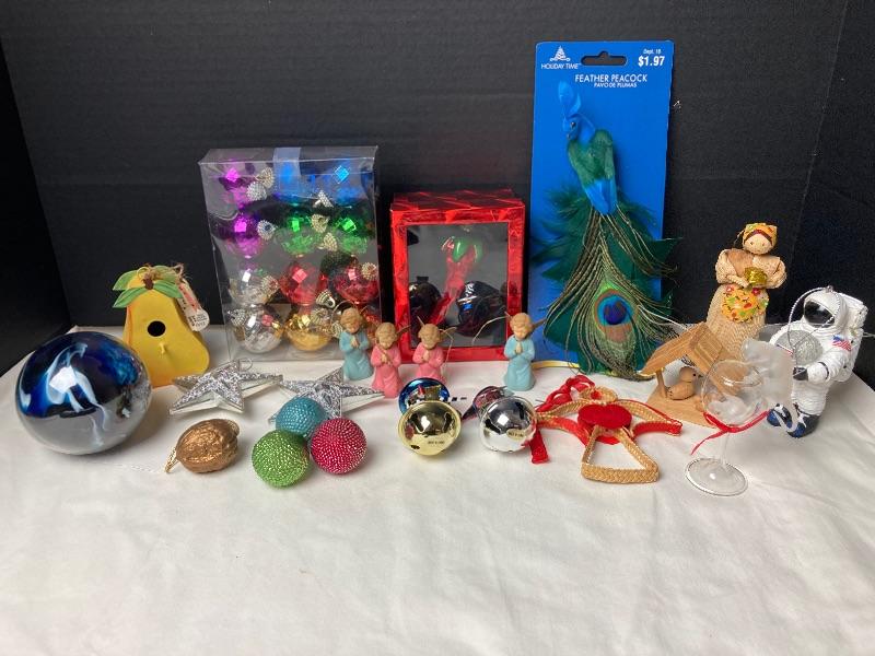 Lot of assorted holiday ornaments- Angels, Astronaut,Birdhouse,Peacock, Chili Pepper, Disco balls and more