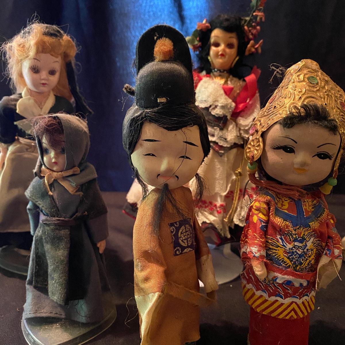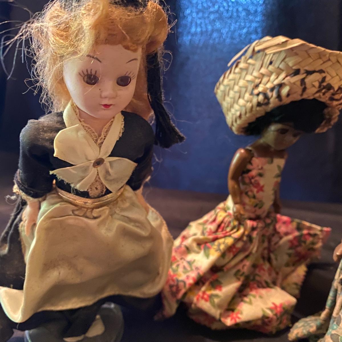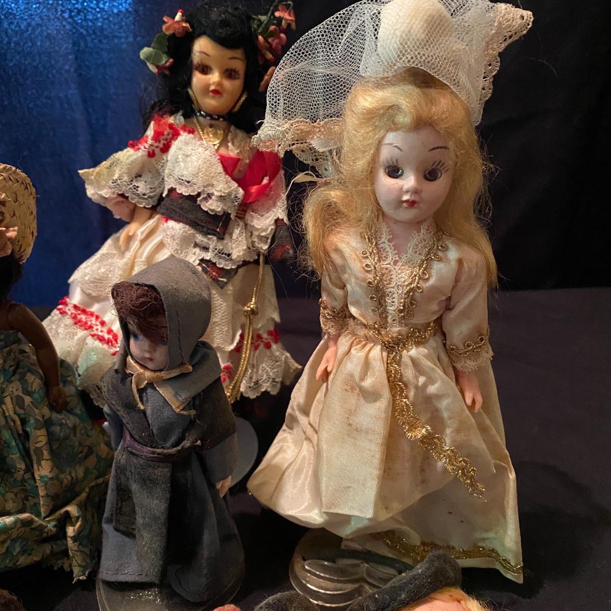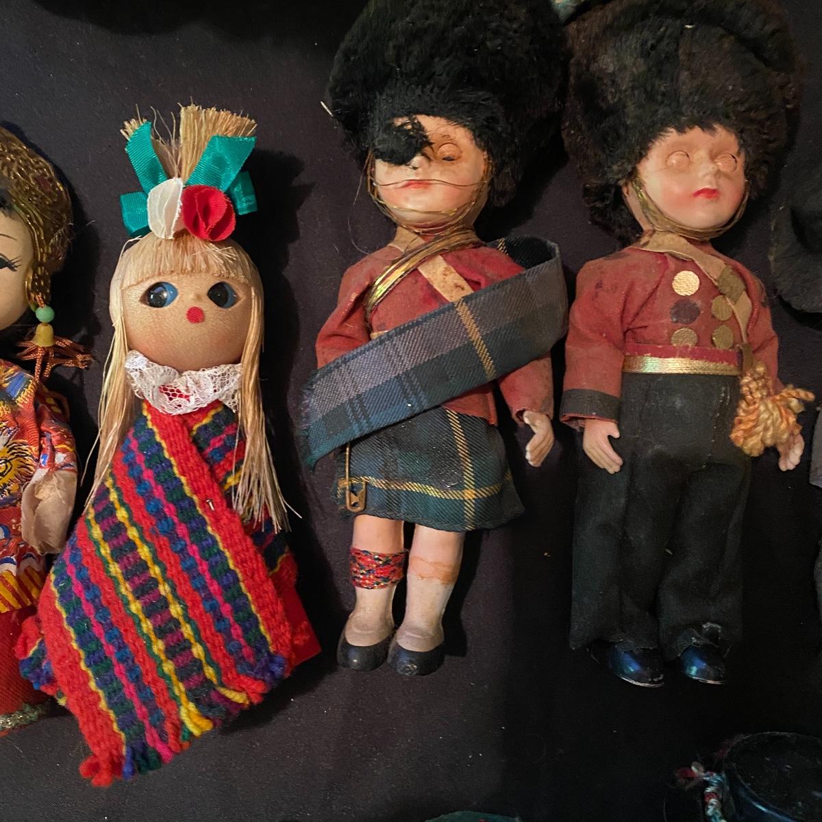 Great mix of dolls from all over the world. Likely collected while traveling. Includes Asian, Islands, Spanish, English, Dutch, and more. Some dolls eyes open and close. No doll markings that we could find. They are older and not in the best condition. Spanish doll in red and white is about 7.5” tall. Asian dolls are 6.5” tall. Shipping available