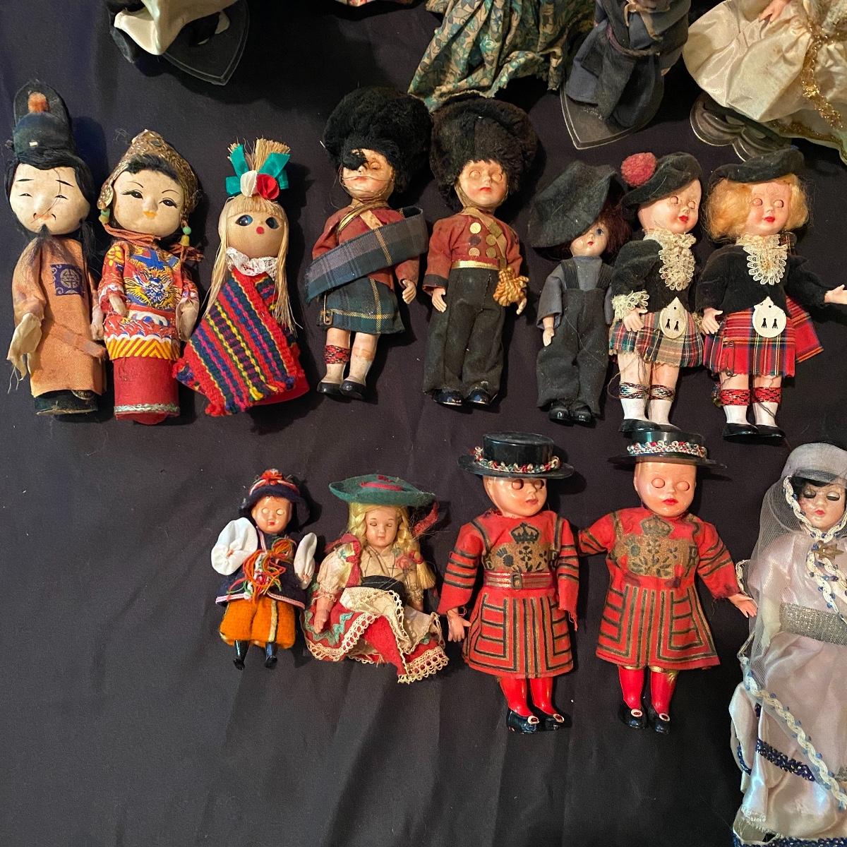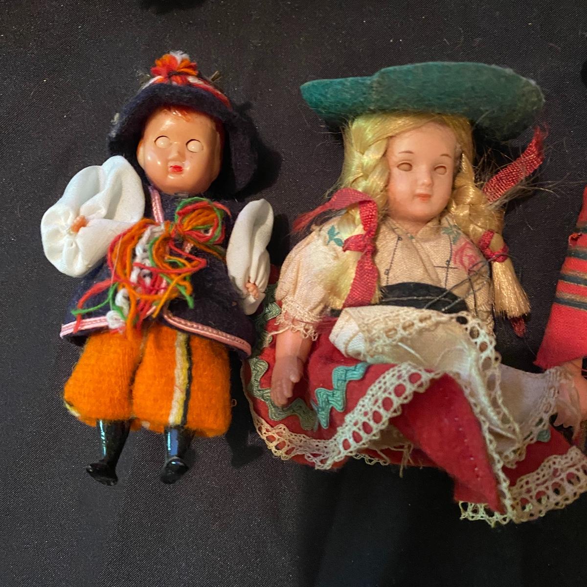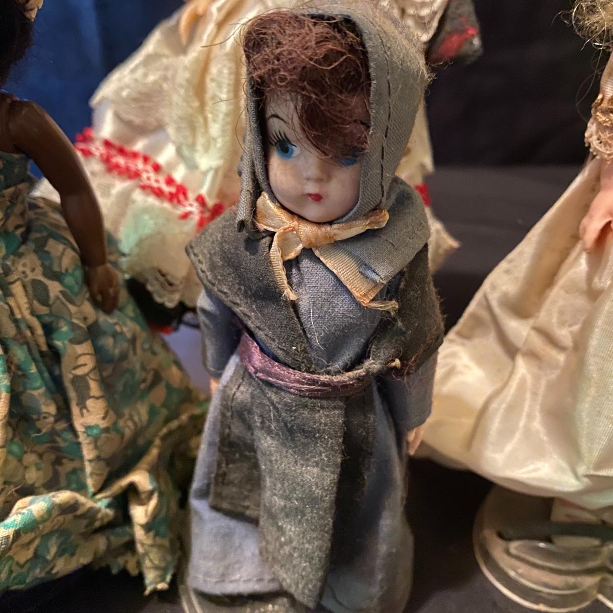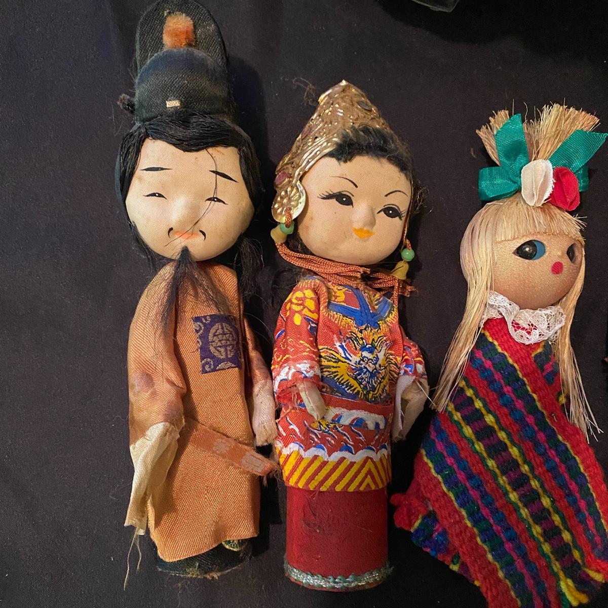 Great mix of dolls from all over the world. Likely collected while traveling. Includes Asian, Islands, Spanish, English, Dutch, and more. Some dolls eyes open and close. No doll markings that we could find. They are older and not in the best condition. Spanish doll in red and white is about 7.5” tall. Asian dolls are 6.5” tall. Shipping available
