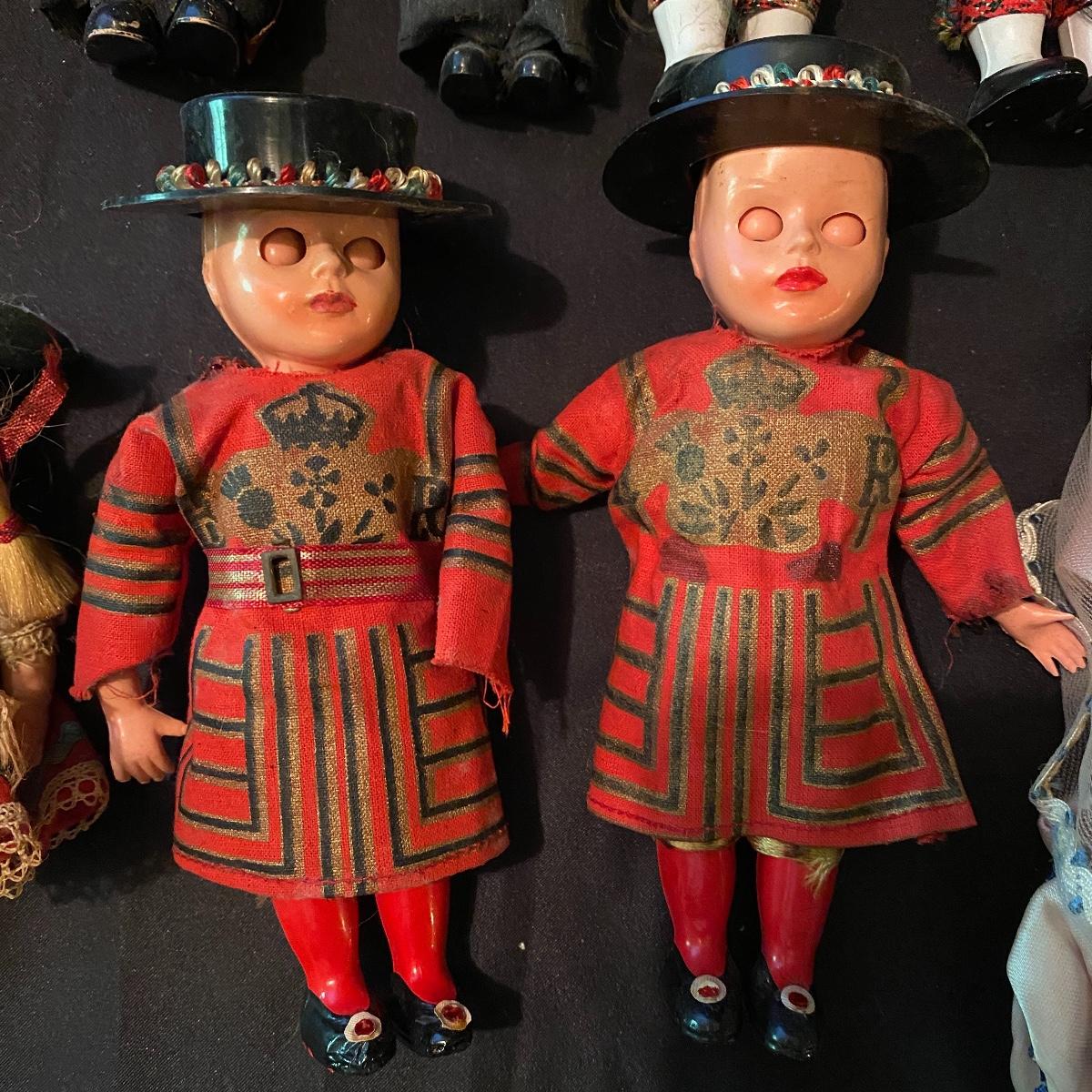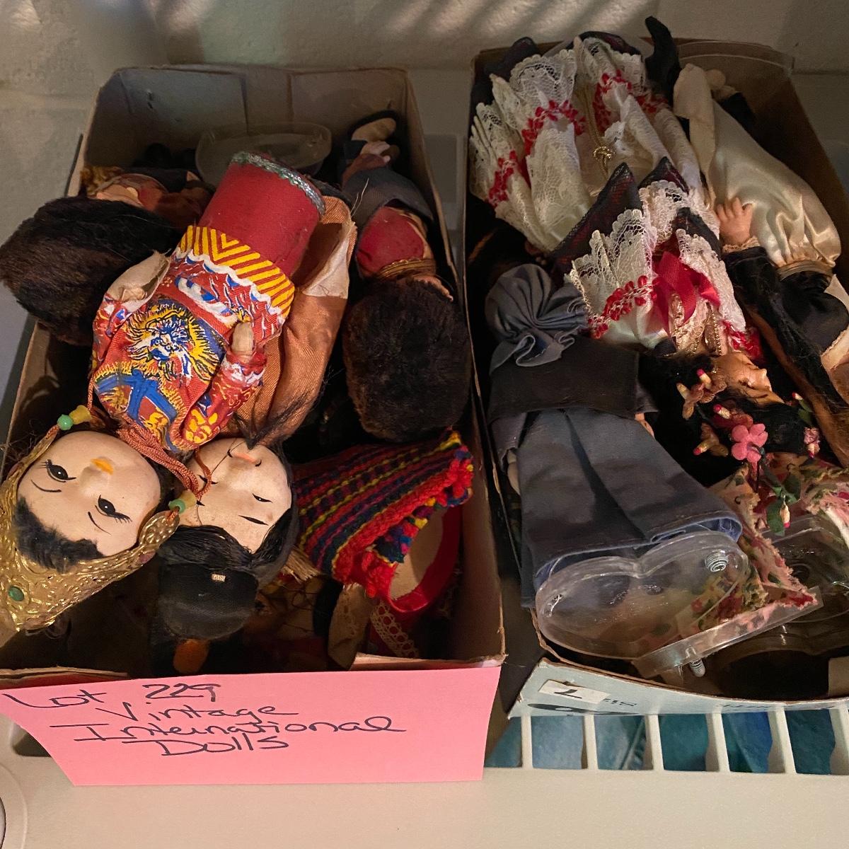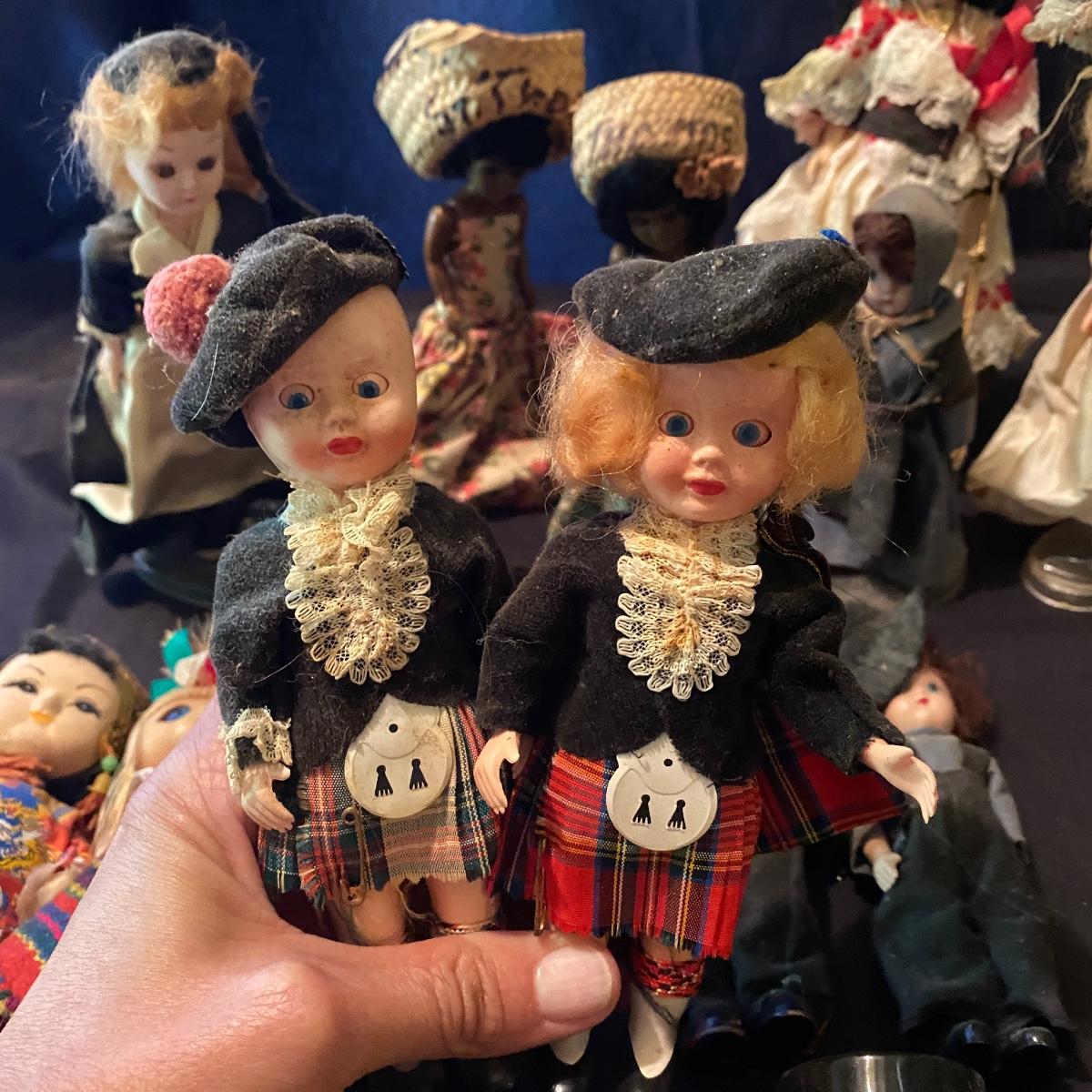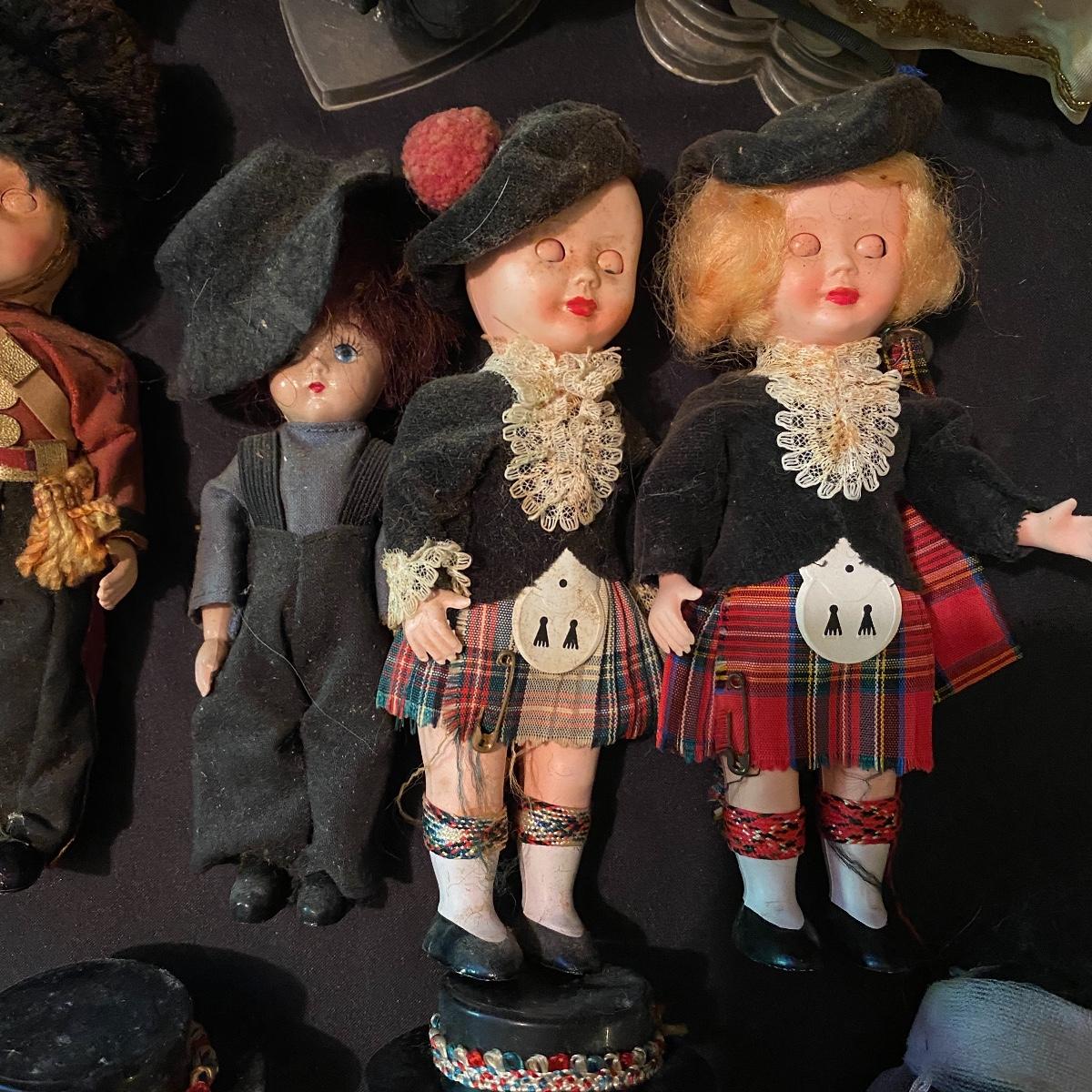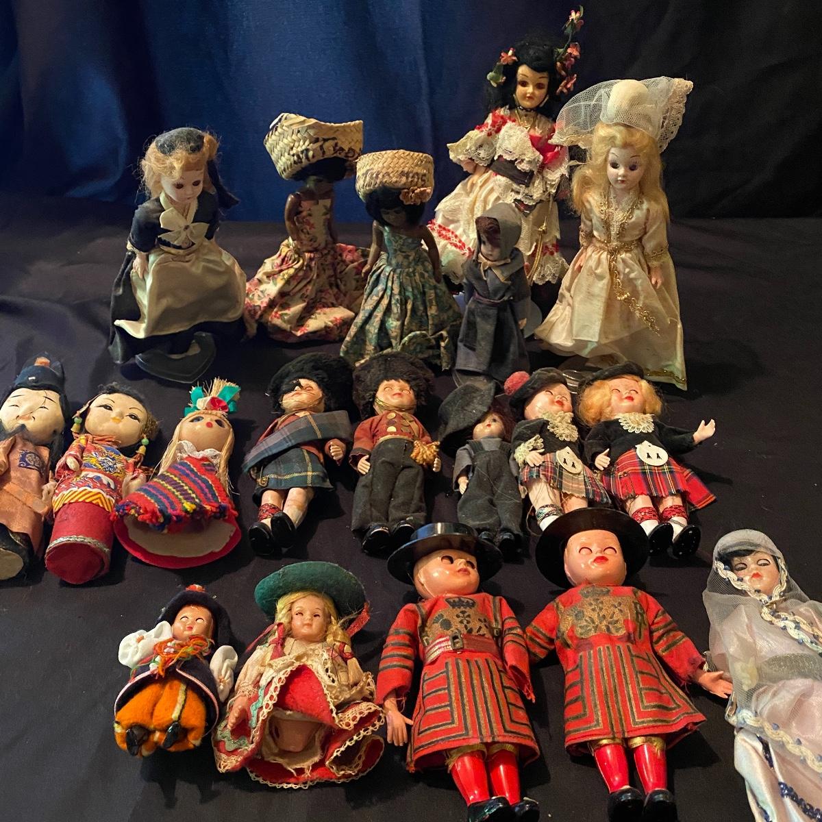 Great mix of dolls from all over the world. Likely collected while traveling. Includes Asian, Islands, Spanish, English, Dutch, and more. Some dolls eyes open and close. No doll markings that we could find. They are older and not in the best condition. Spanish doll in red and white is about 7.5” tall. Asian dolls are 6.5” tall. Shipping available
