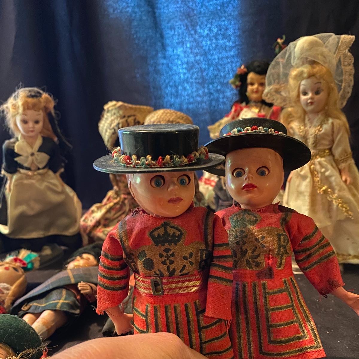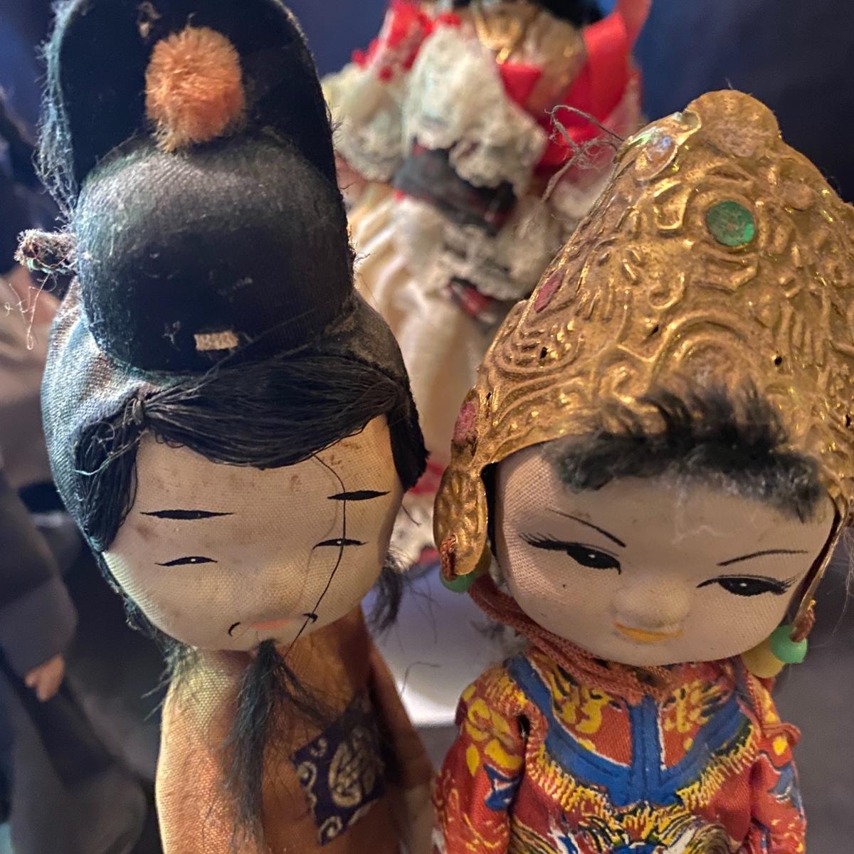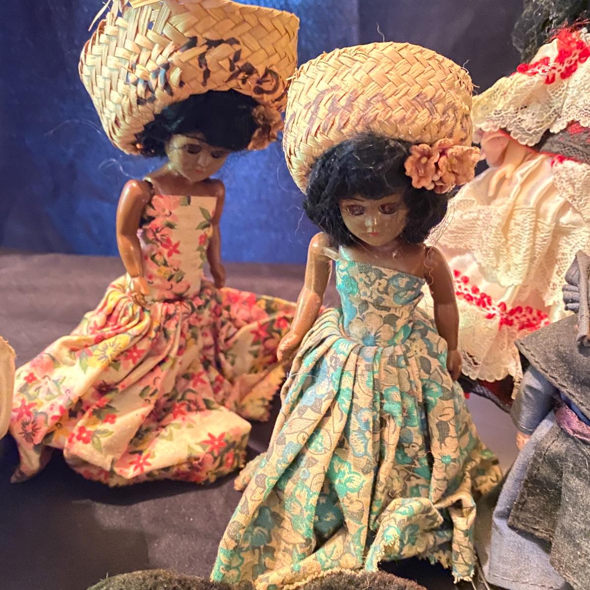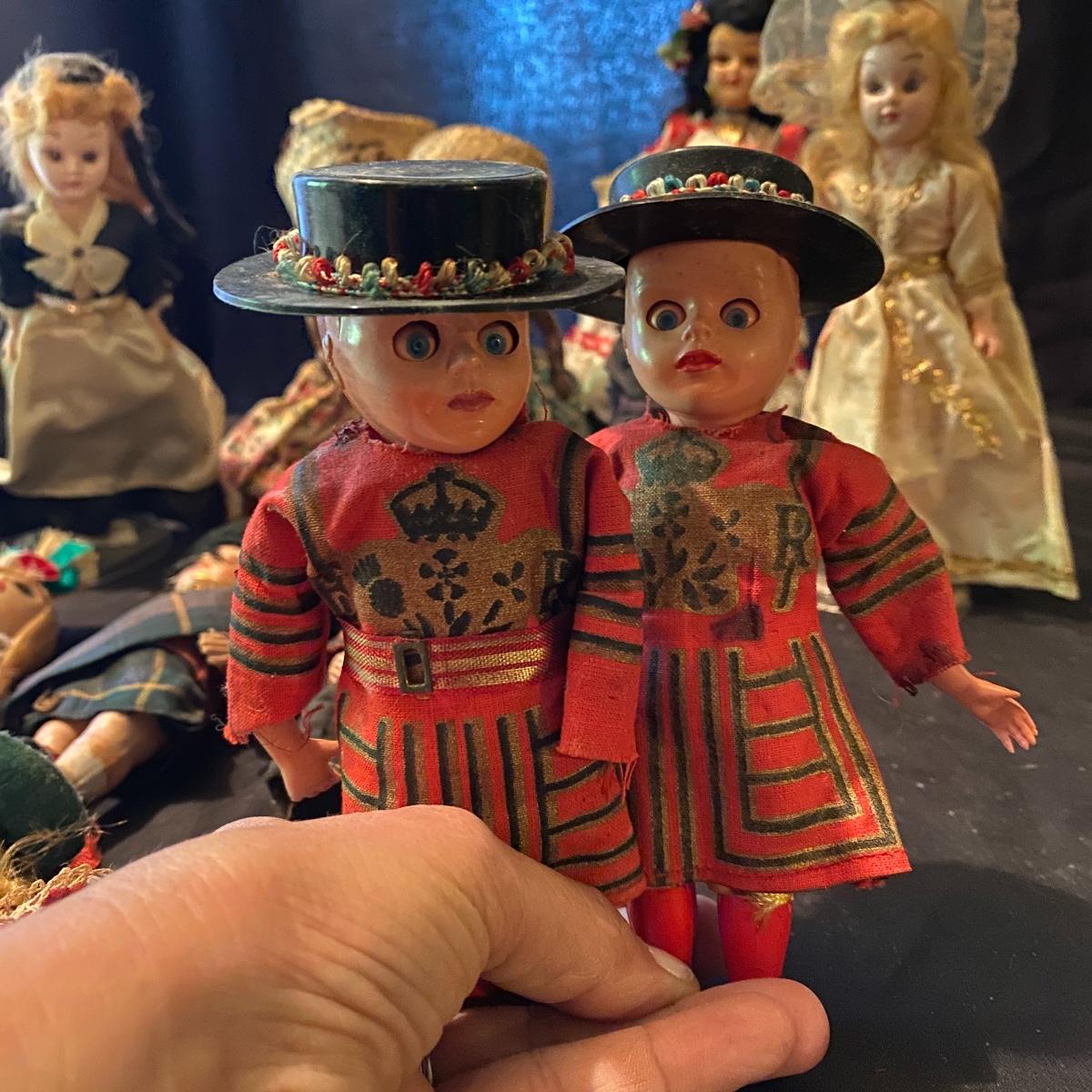 Great mix of dolls from all over the world. Likely collected while traveling. Includes Asian, Islands, Spanish, English, Dutch, and more. Some dolls eyes open and close. No doll markings that we could find. They are older and not in the best condition. Spanish doll in red and white is about 7.5” tall. Asian dolls are 6.5” tall. Shipping available