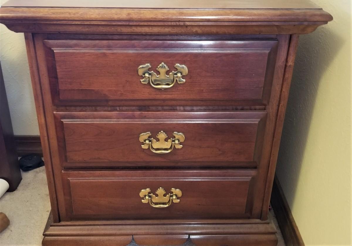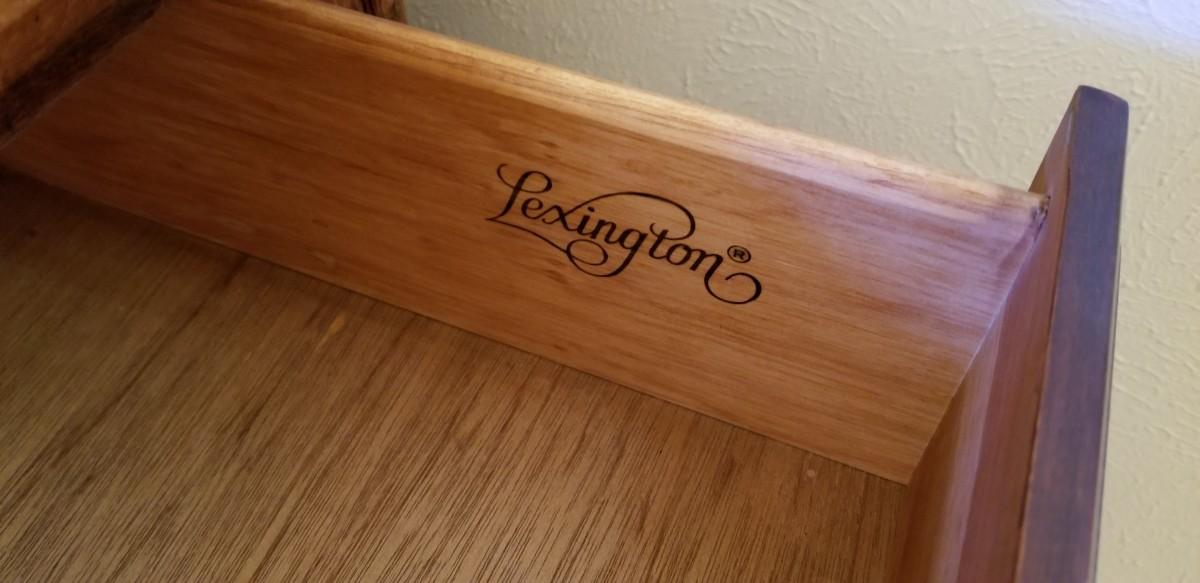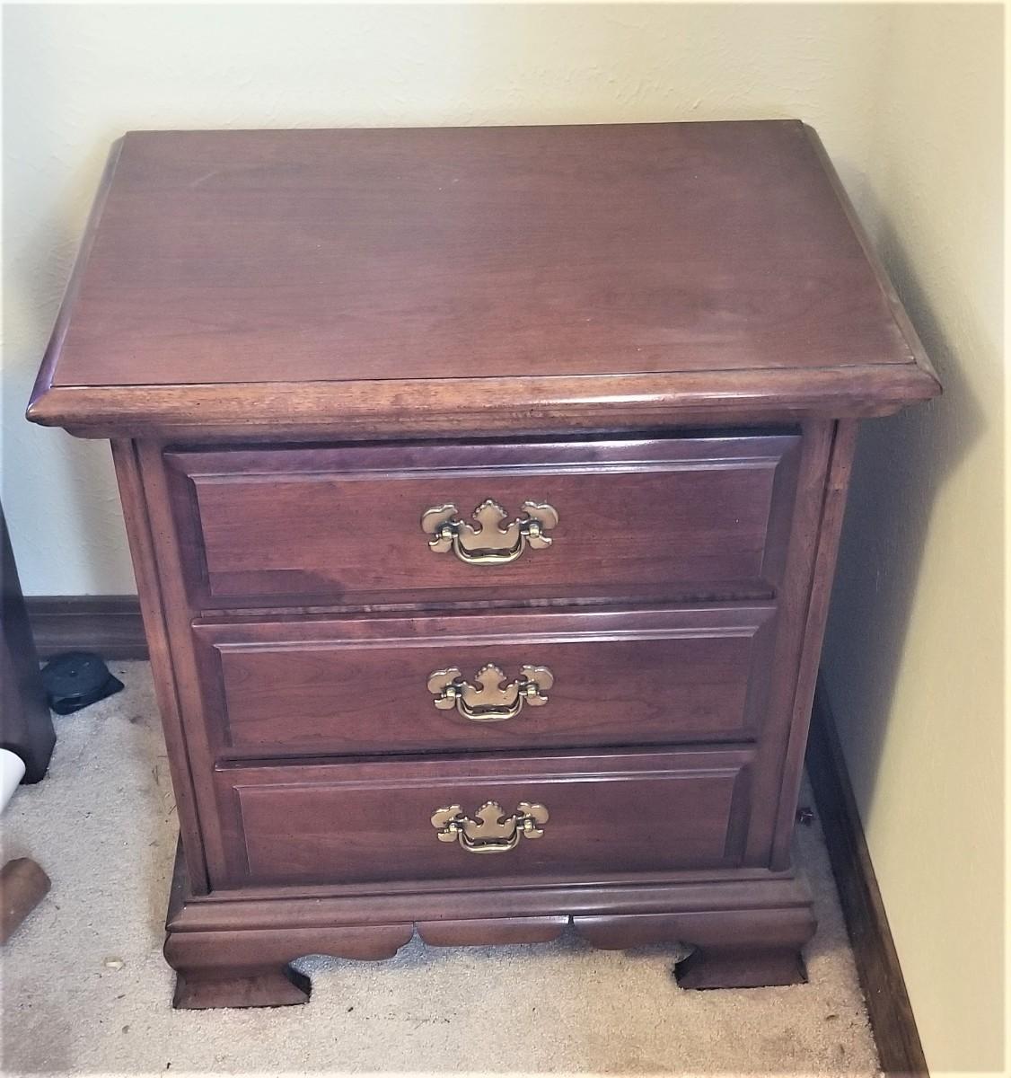 Classic Lexington 3 drawer nightstand in good used condition. 24" across, 17" deep, 26" tall. Brass handles.