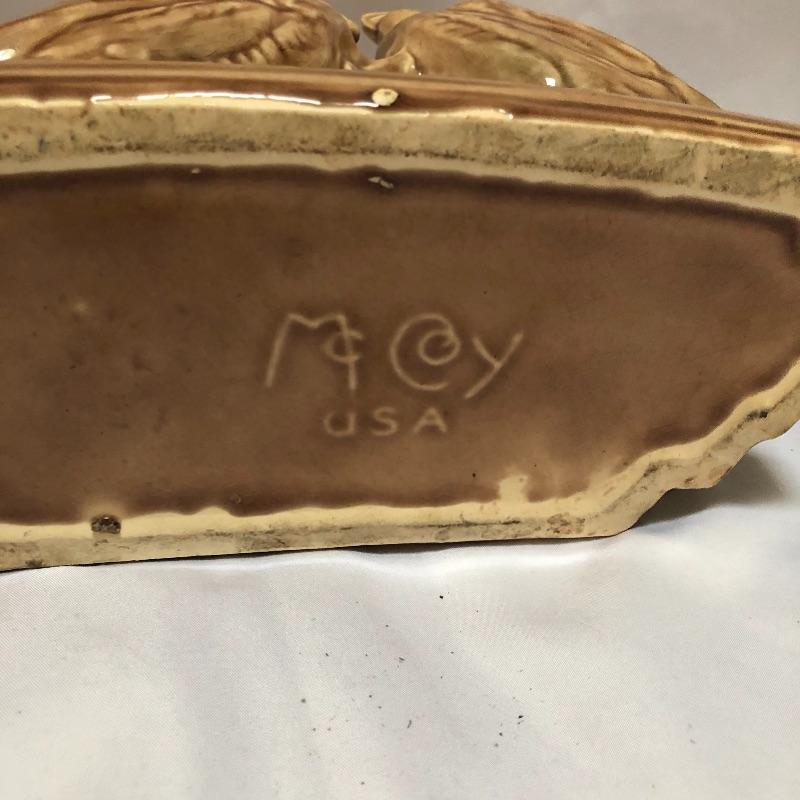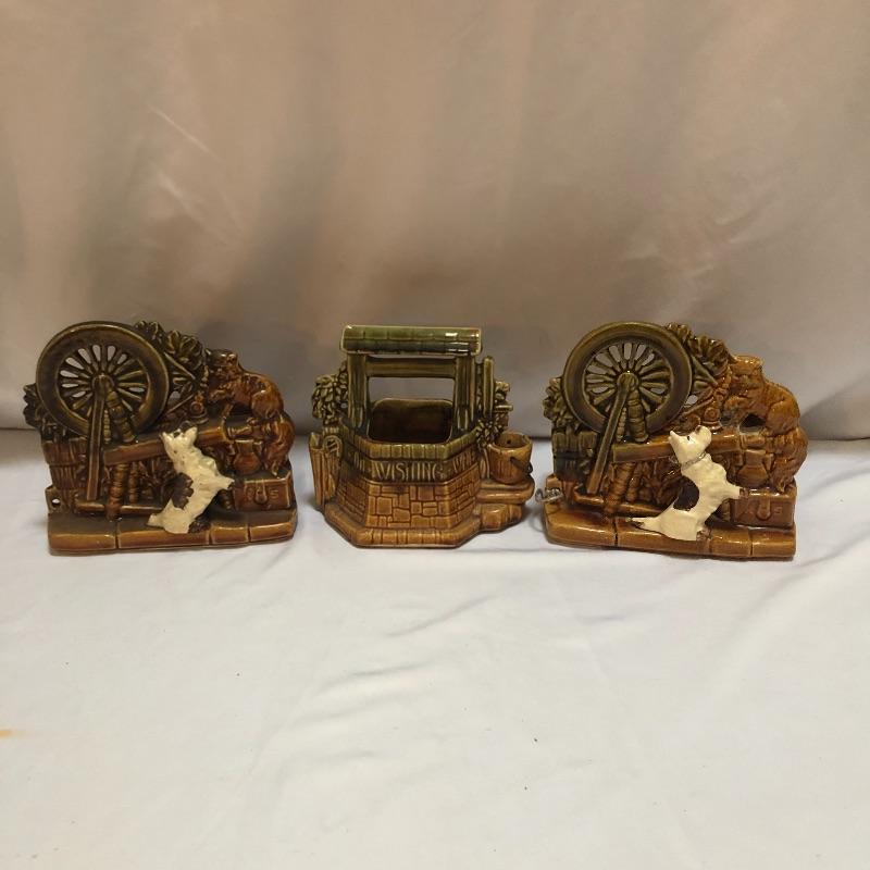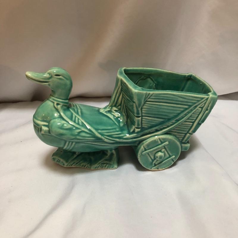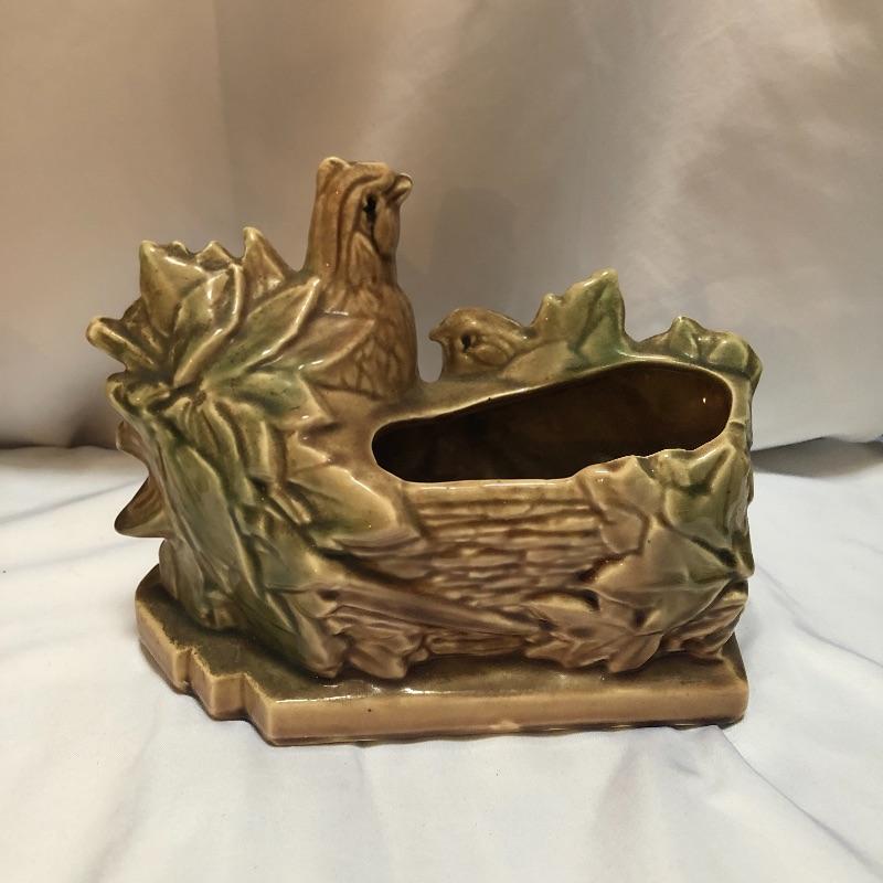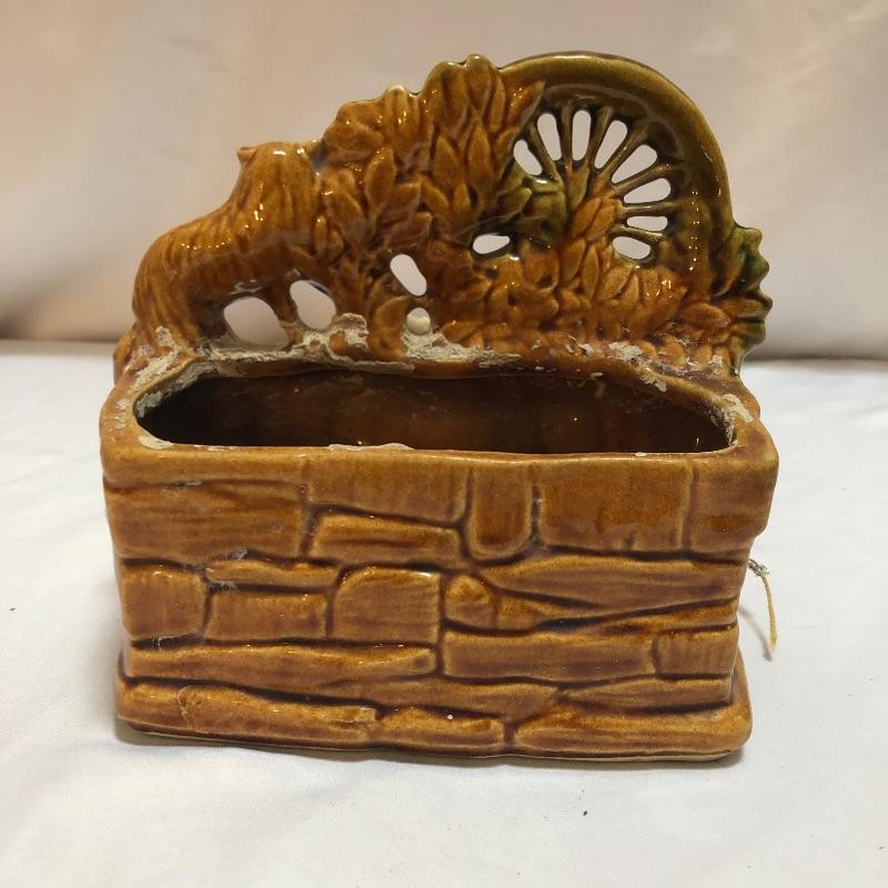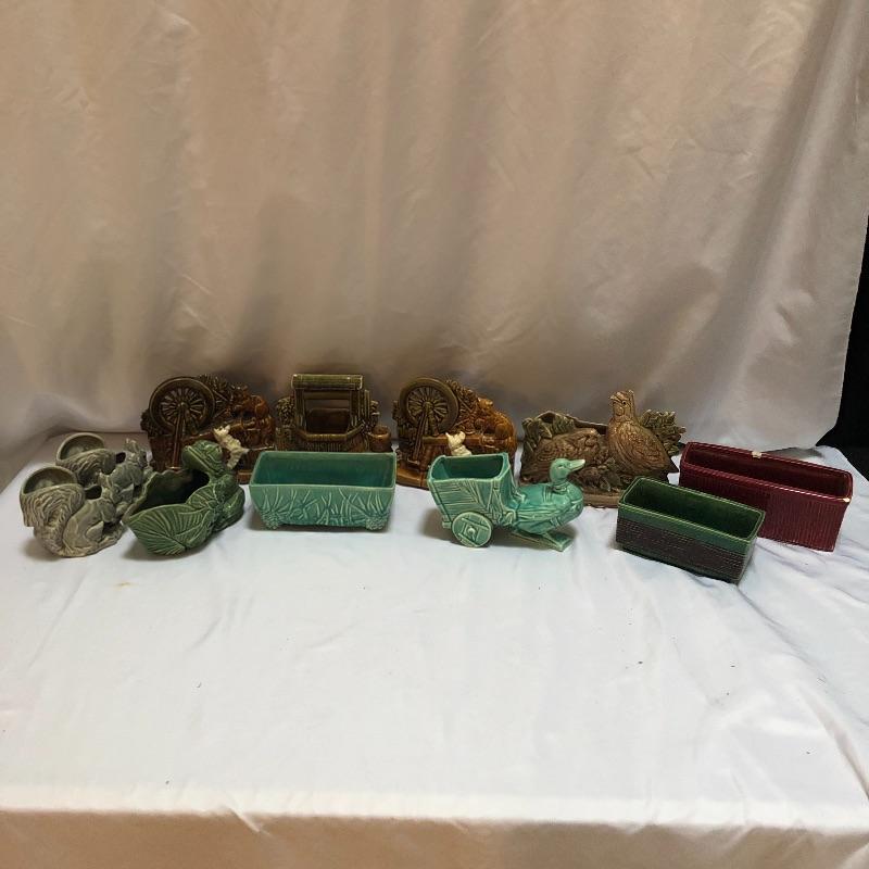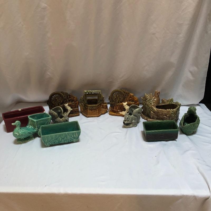 Spring is almost here! This eleven piece McCoy pottery decorative planter collection includes duck, frog, squirrels, spinning wheels, birds, wishing well and more. Largest piece measures 4.25” x 8.25” x 7”.