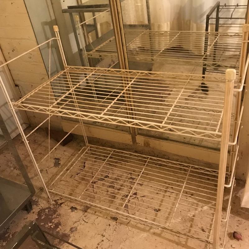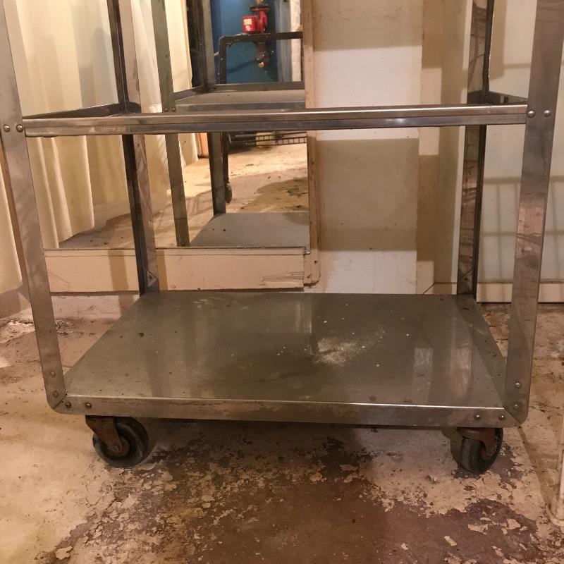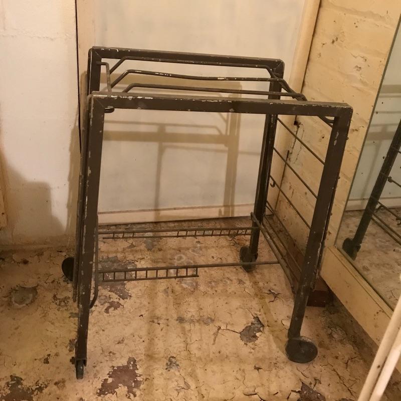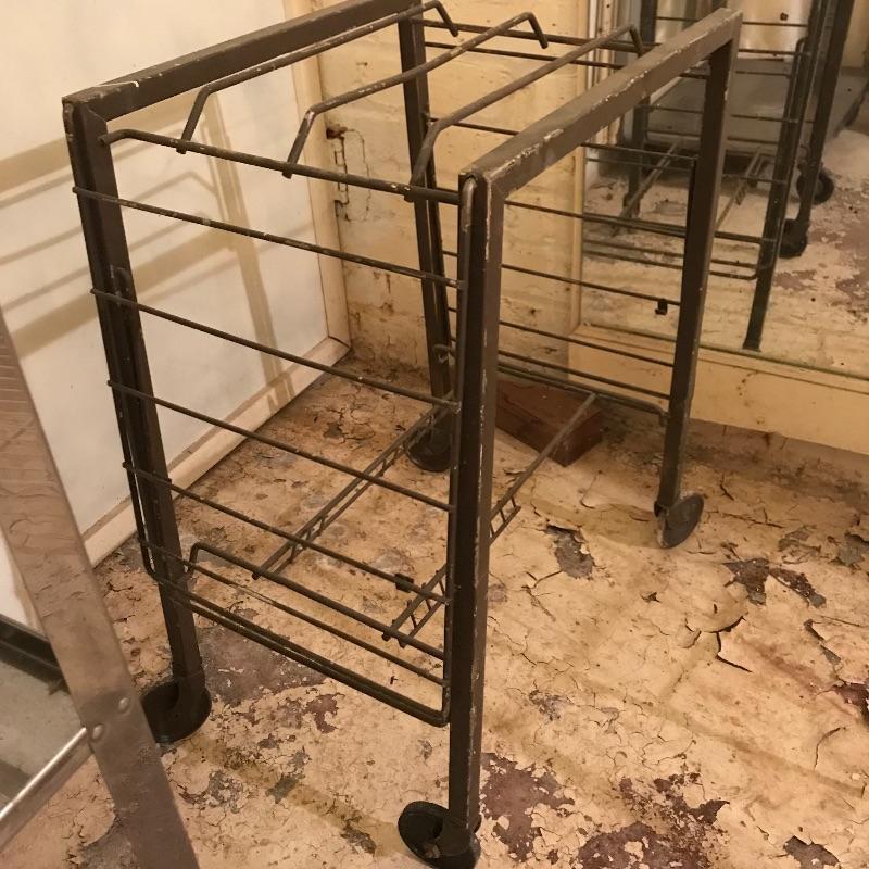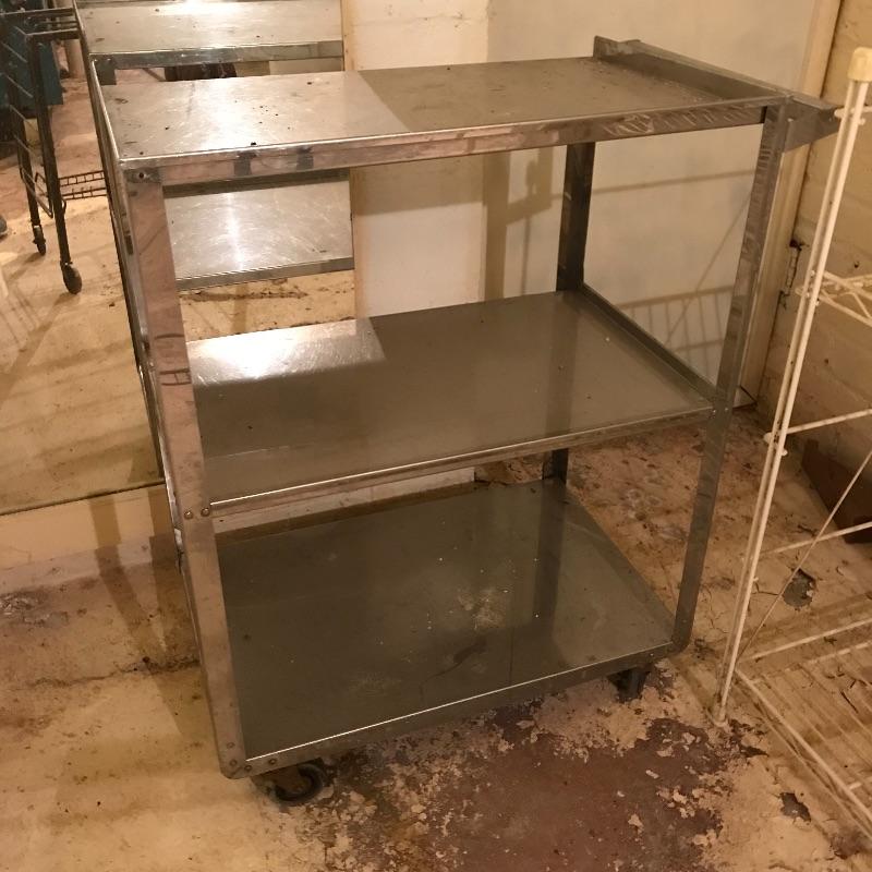 Stainless utility cart with easy loading on one side for all three shelves. Shelves themselves measure 24” x 15.75” and cart stands 31.5” high. Complete with push handle (adds another 2.5” to width) and wheels that roll smoothly! Cart is accompanied by a metal ivory two tiered shelf unit with racks to drape items on each side. The ivory rack measures 37” x 16.5” x 34”. Lastly, lot includes a smaller rolling rack with collapsing wings for more storage. This cart measures 16” x 13” x 24.25” with wings down. Width of rack with wings suspended is about 46.5”. Wheels are a little wobbly, but roll easily. All three items appear sturdy. No shipping.