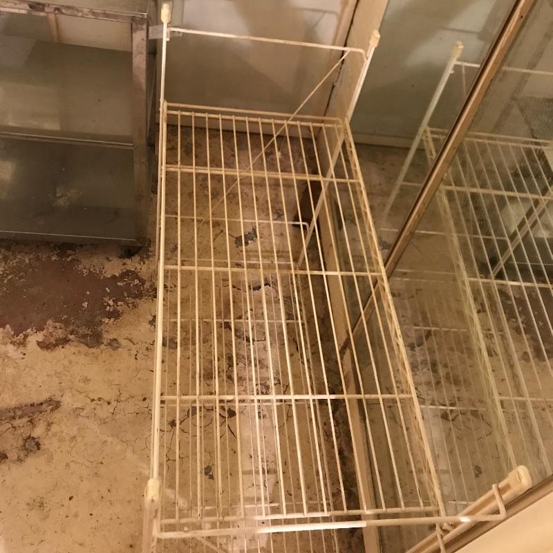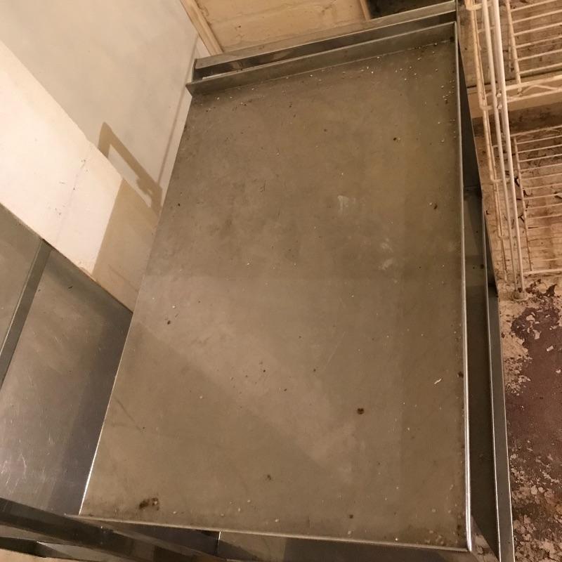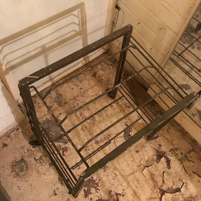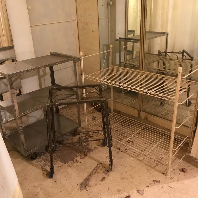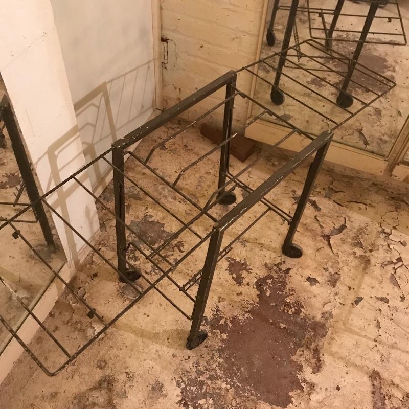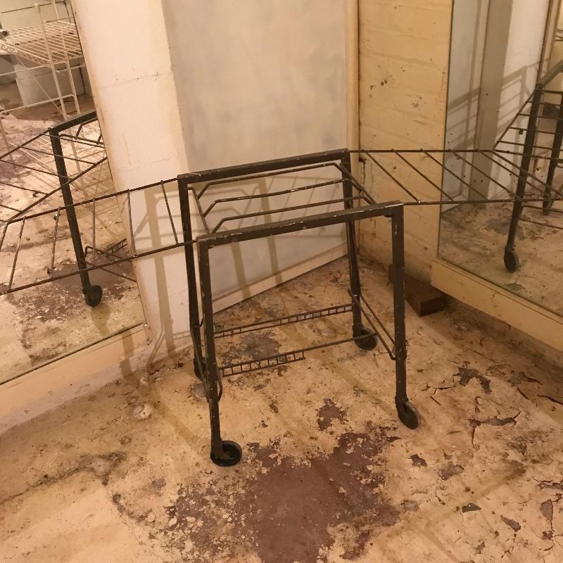 Stainless utility cart with easy loading on one side for all three shelves. Shelves themselves measure 24” x 15.75” and cart stands 31.5” high. Complete with push handle (adds another 2.5” to width) and wheels that roll smoothly! Cart is accompanied by a metal ivory two tiered shelf unit with racks to drape items on each side. The ivory rack measures 37” x 16.5” x 34”. Lastly, lot includes a smaller rolling rack with collapsing wings for more storage. This cart measures 16” x 13” x 24.25” with wings down. Width of rack with wings suspended is about 46.5”. Wheels are a little wobbly, but roll easily. All three items appear sturdy. No shipping.