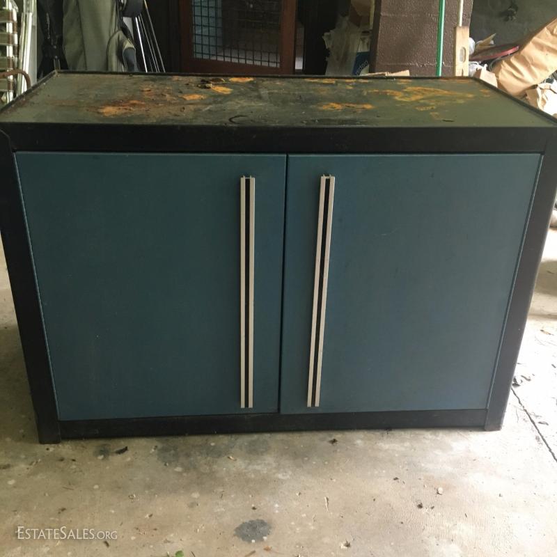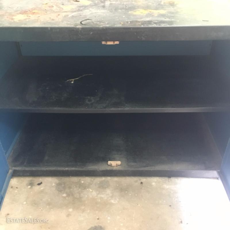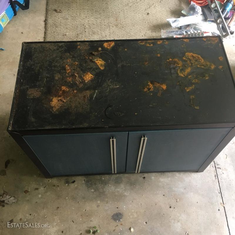 Retro Blue Metal Cabinet with two doors and shelves. Rusty top but otherwise in good condition. 36" l x 28"w x 24.5"h