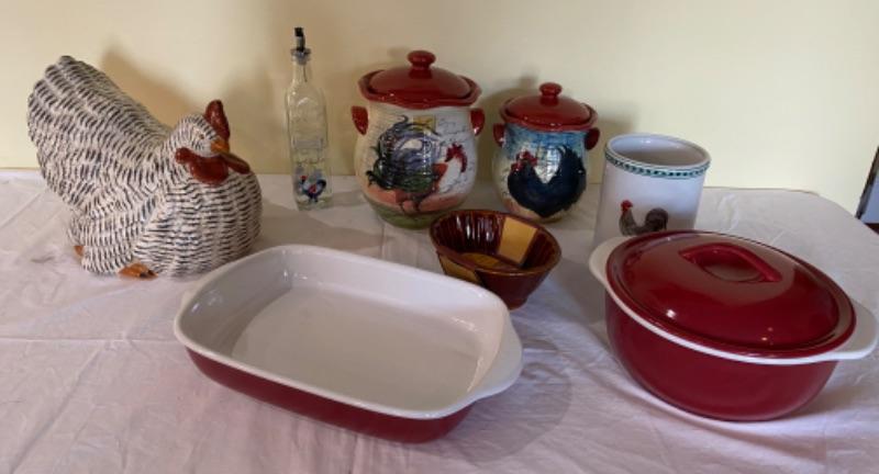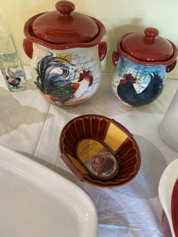 Lot of Rooster kitchen bakeware and canister set with decorative rooster and cranberry mold
