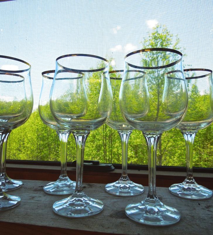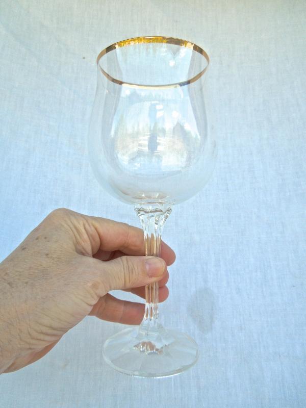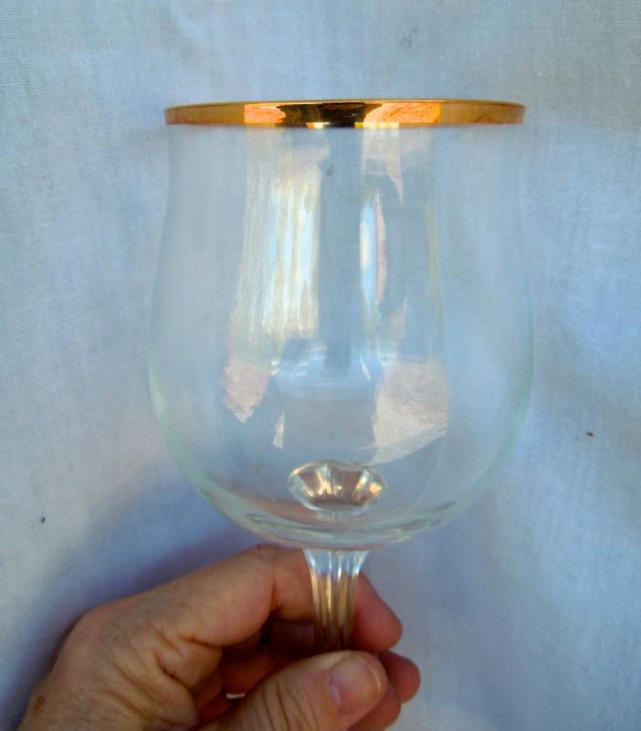 These are lovely antique wine glasses that hold 16 oz of wine. Noritake "Bradford" pattern. Cut glass stem with gold rim. All are in excellent condition without chips, cracks or wear to gold. Other pieces of the Nortake Bradford pattern are also being sold.