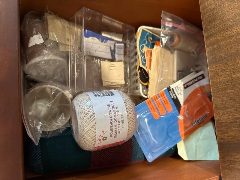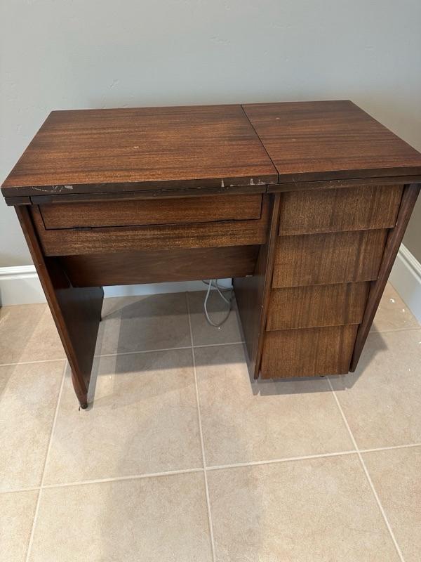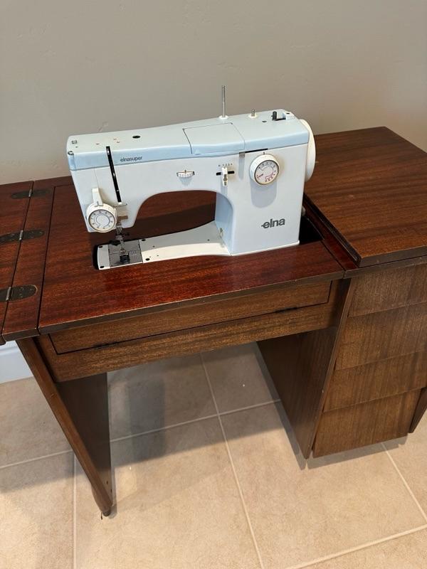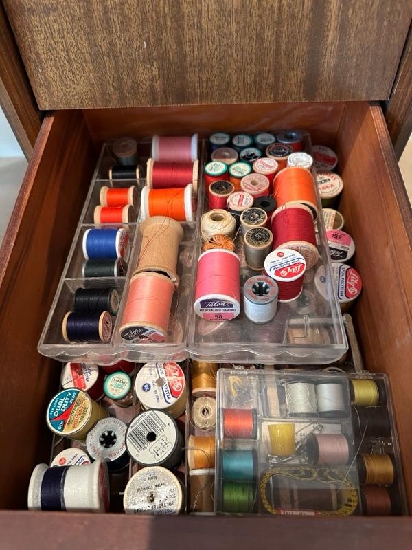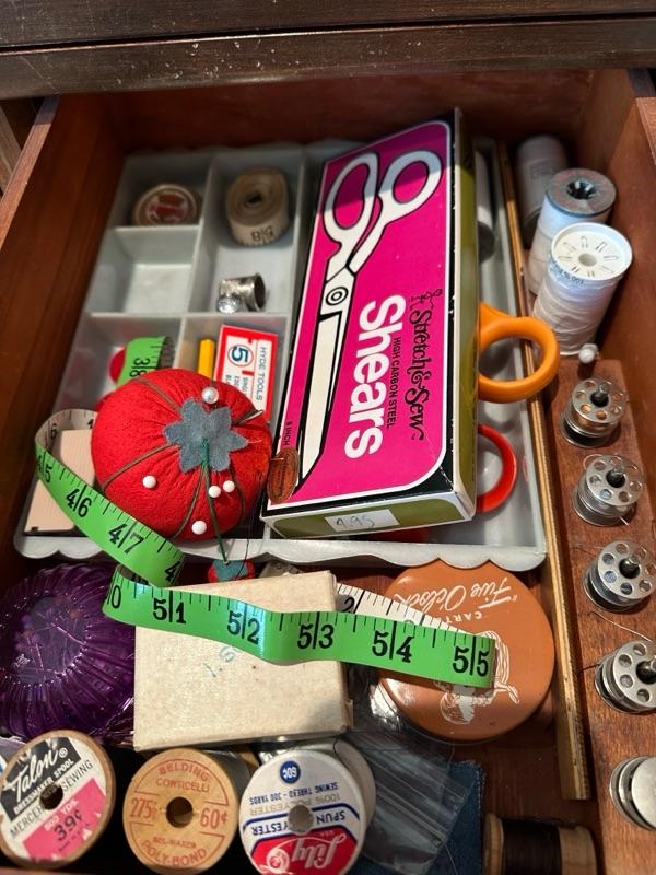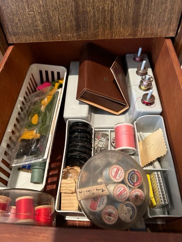 This lot also includes miscellaneous sewing items in the sewing tables drawers
