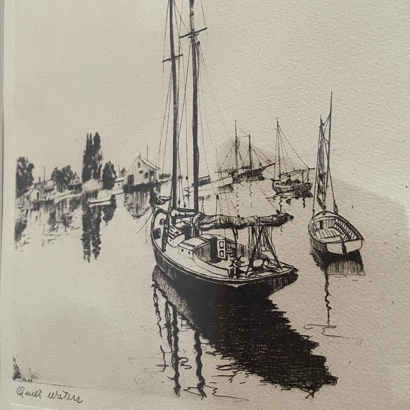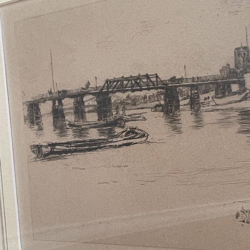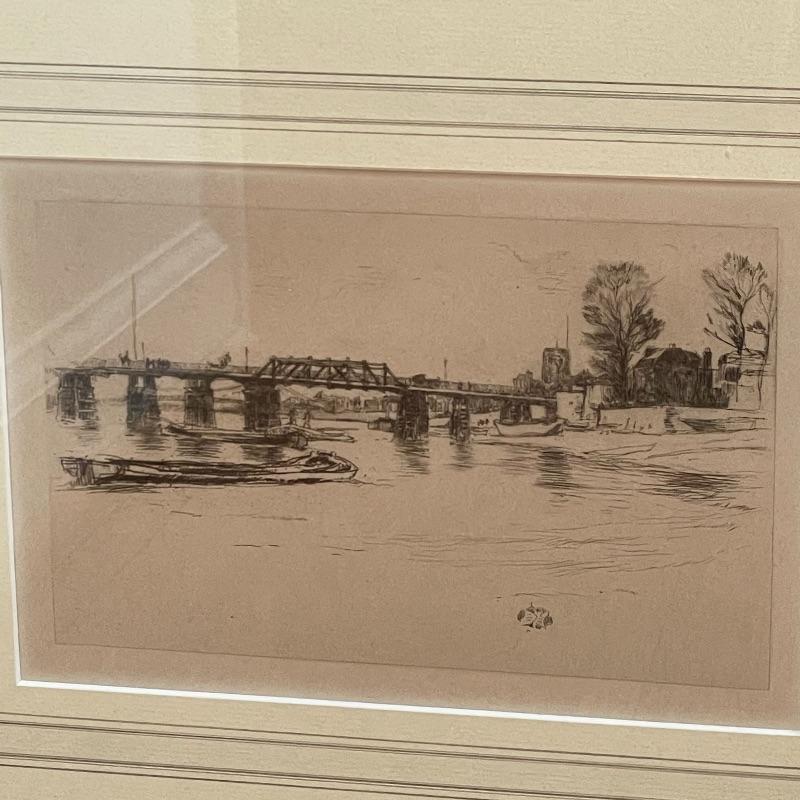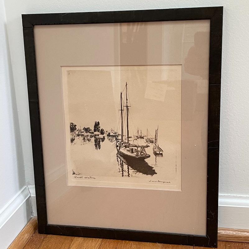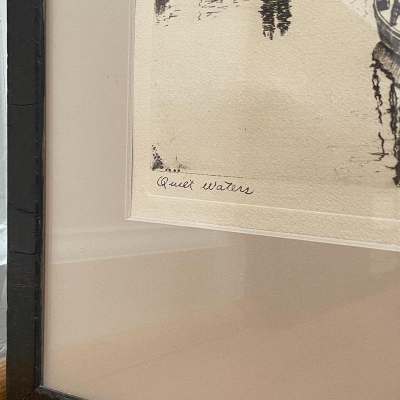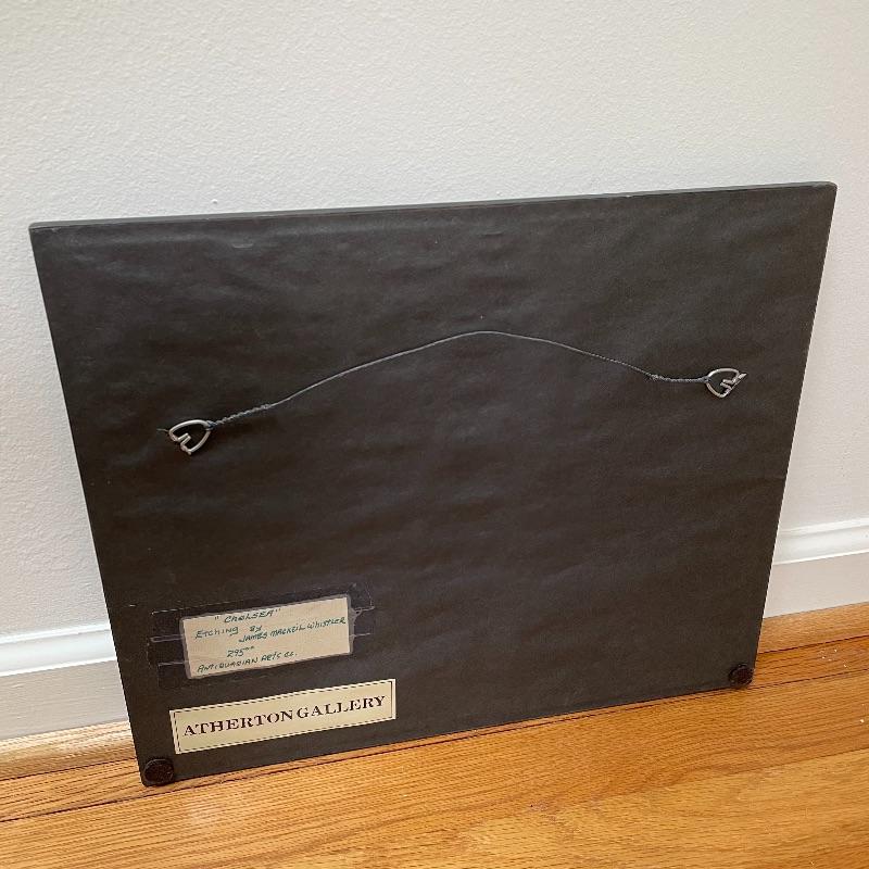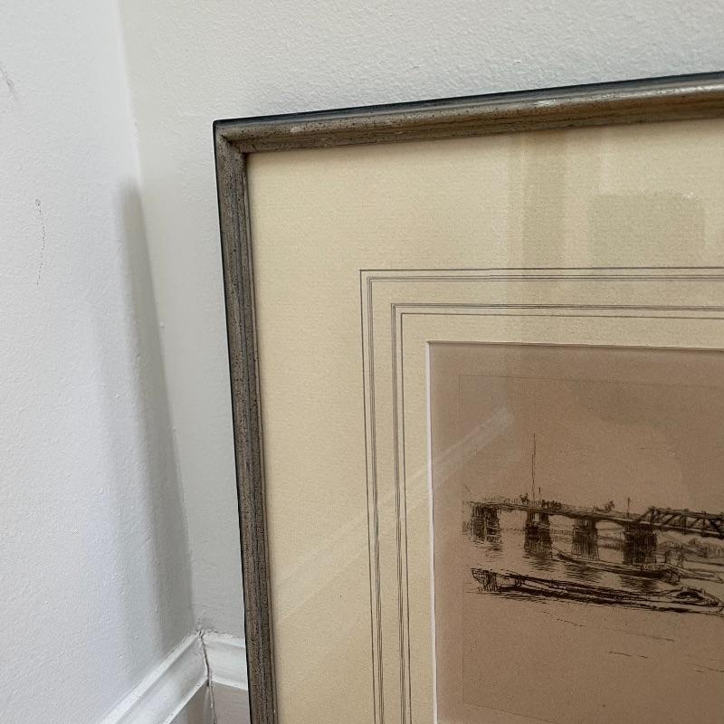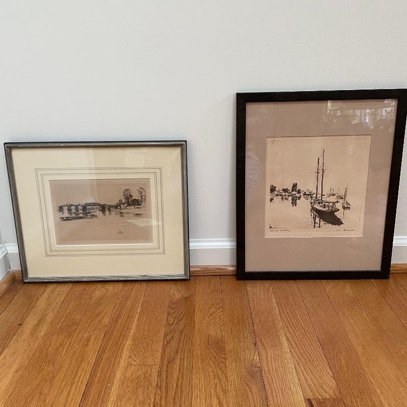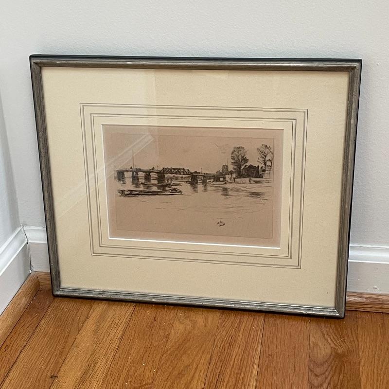 “Chelsea” by James MacNeil Whistler and “Quiet Waters” by Lionel Barrymore. Both stoic and stunning etchings. “Quiet Waters” appears to be signed in pencil and “Chelsea” has the JW Butterfly Whistler is known to use. Both sit in nice layered matting and wooden frames. These art would look great grouped together or they can each stand alone nicely. “Chelsea” art measures approximately 15.5” x 13”, “Quiet Waters” is a bit bigger at 14” x 16.75”. Shipping available. Please call UPS with dimensions at 828-252-6930 for a shipping quote prior to bidding.