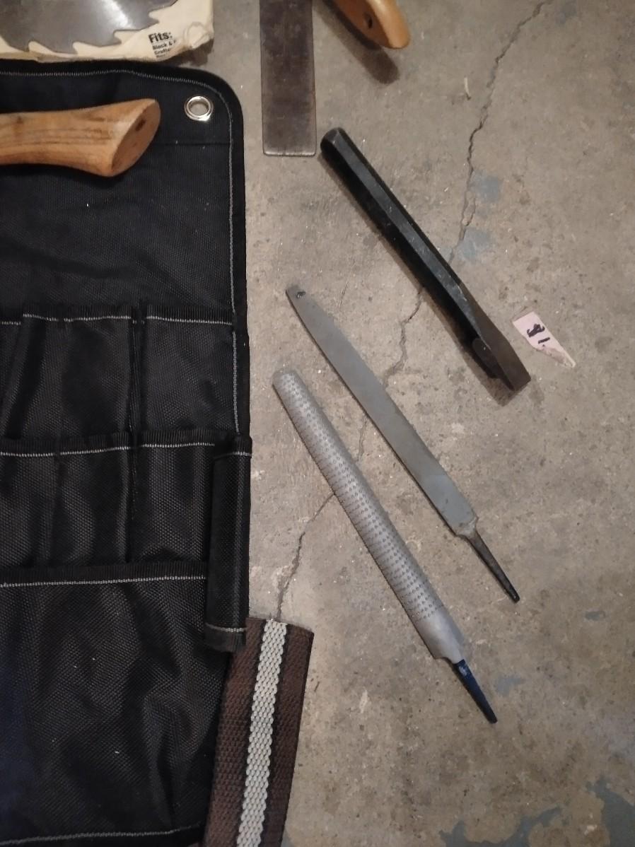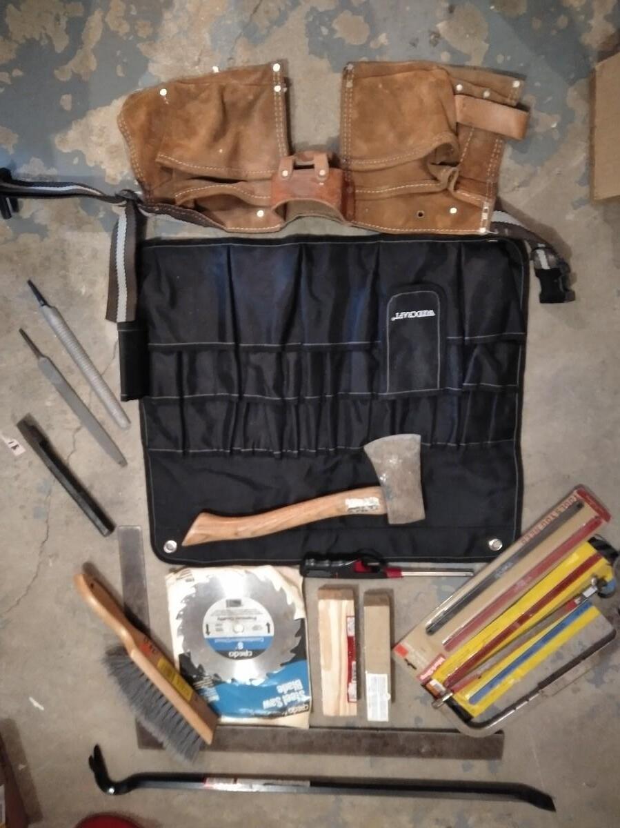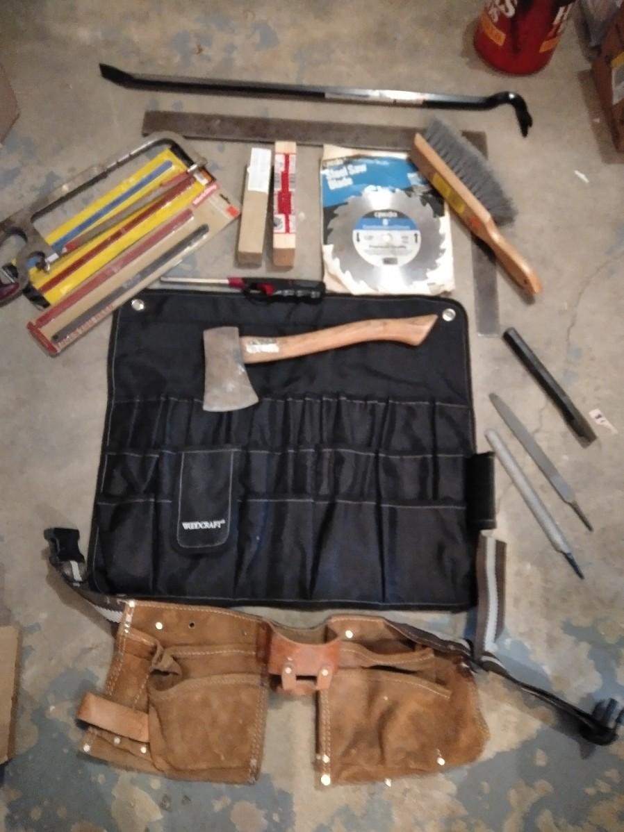 WOODCRAFT ORGANIZER, LEATHER TOOLBELT, BENCH BRUSH, BLADES, HATCHET, FILES AND OTHER WOOD WORKING TOOLS.
