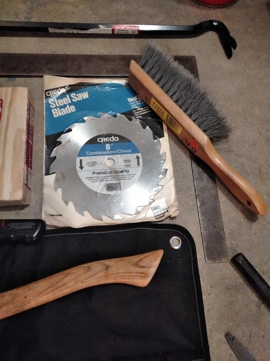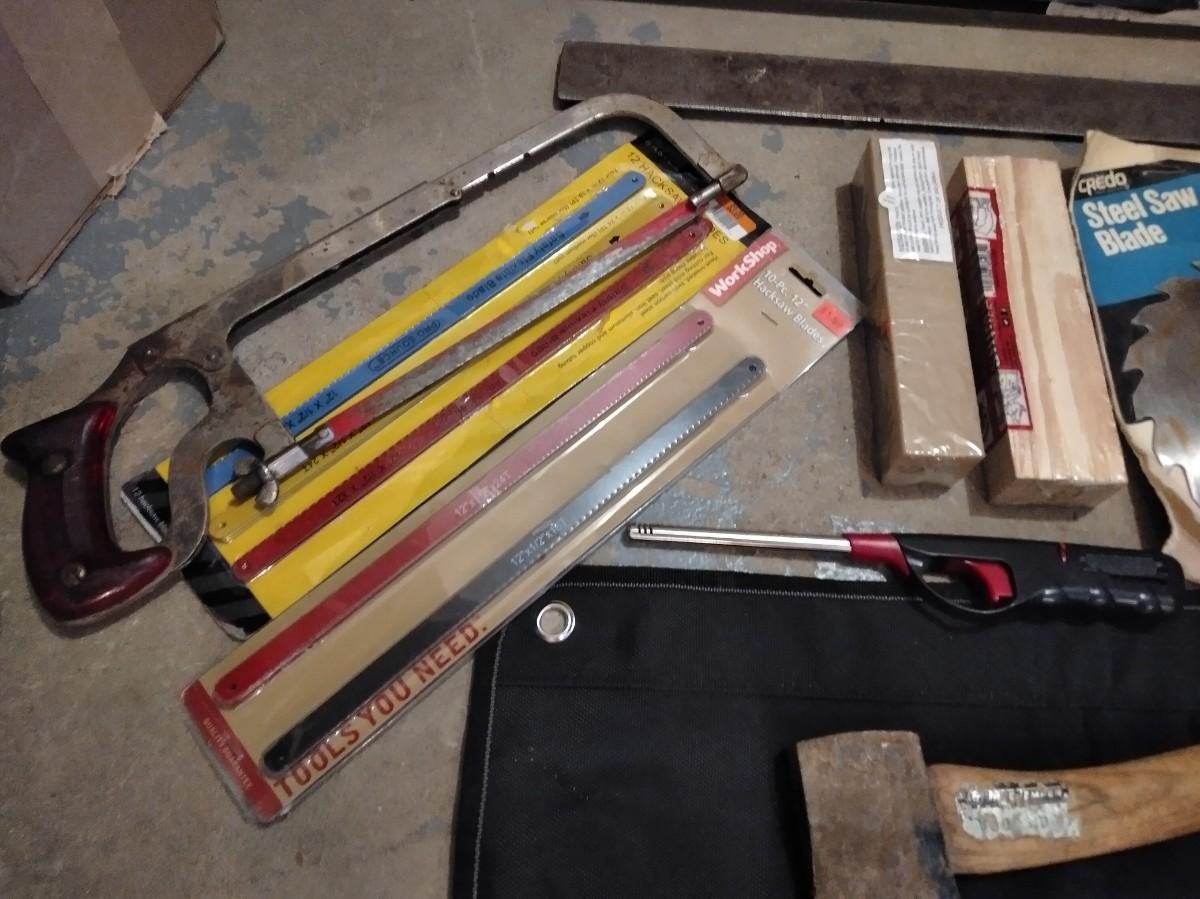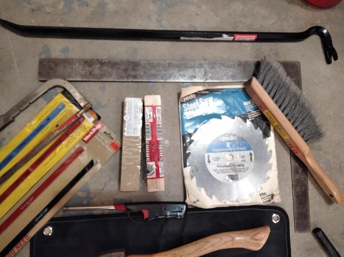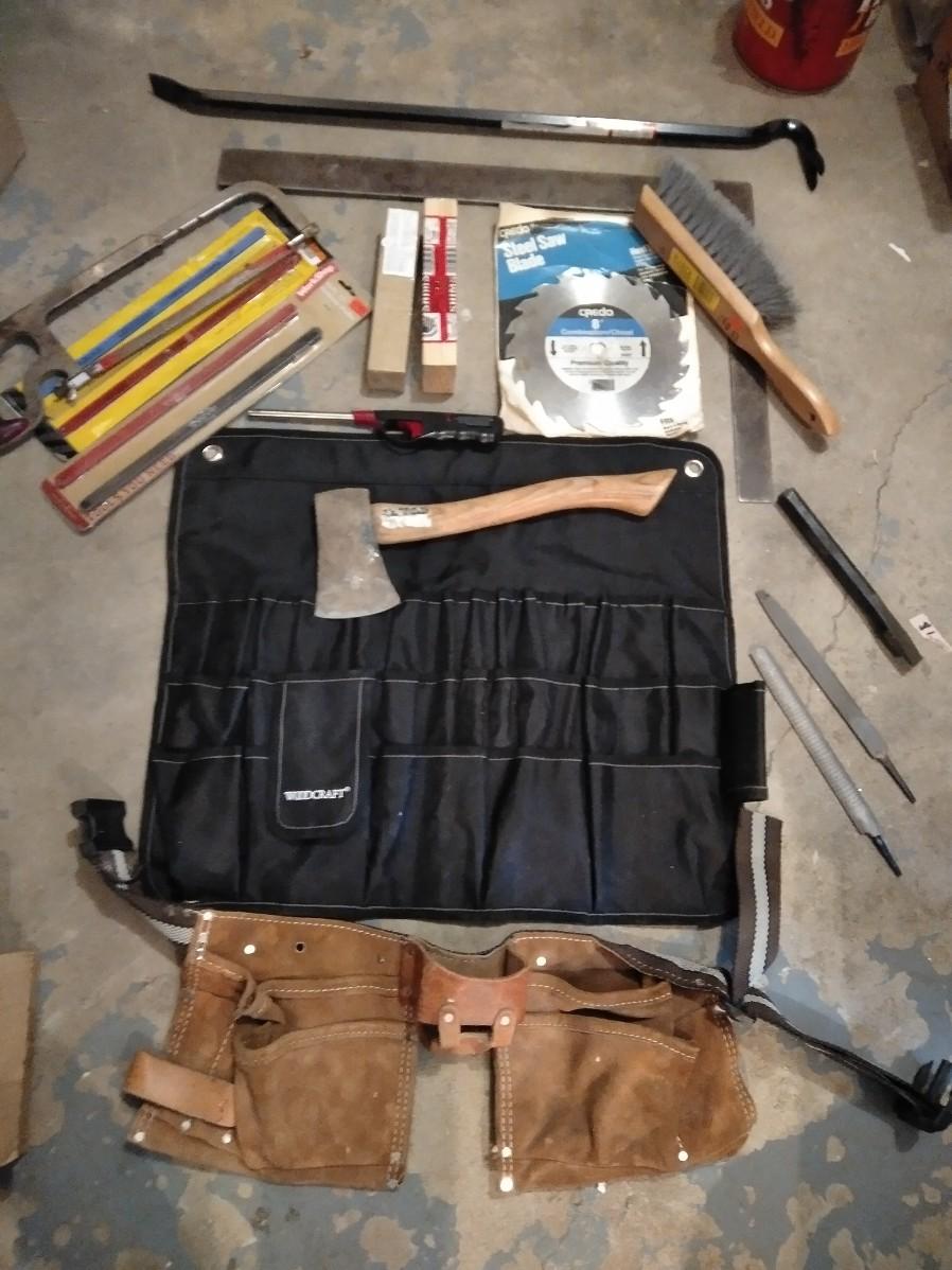 WOODCRAFT ORGANIZER, LEATHER TOOLBELT, BENCH BRUSH, BLADES, HATCHET, FILES AND OTHER WOOD WORKING TOOLS.
