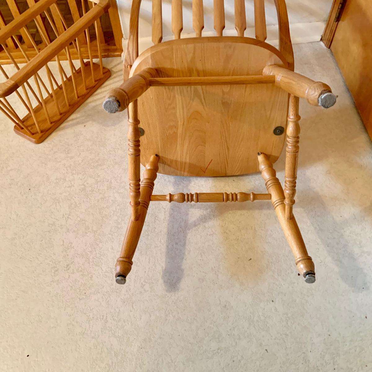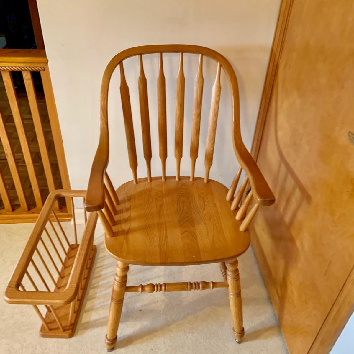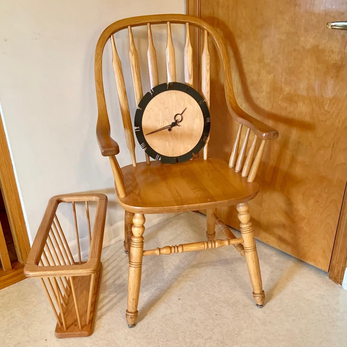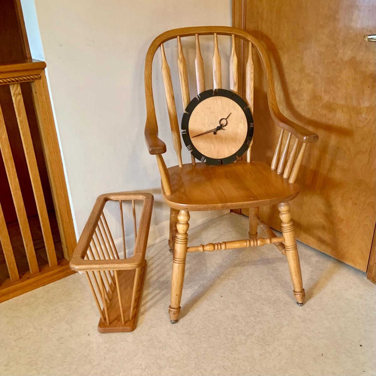 Lot: 229G: Amish Style Paddle Chair with Wood Magazine Rack and Clock