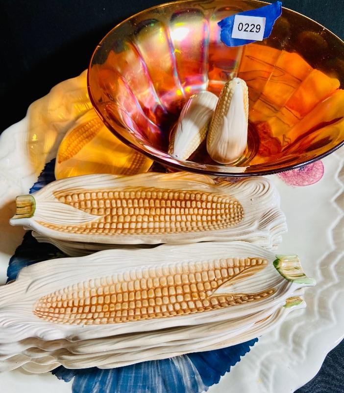 Large turkey serving platter, rust colored carnival glass serving bowl, ten ceramic corn on the cob dishes with matching S&P shakers, and small floral pitcher. Please see pictures for sizing/condition. MHW