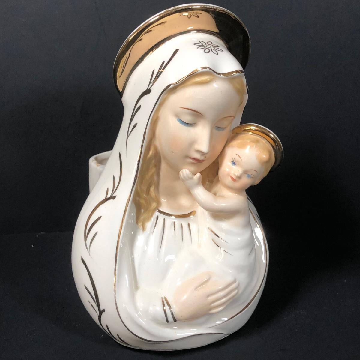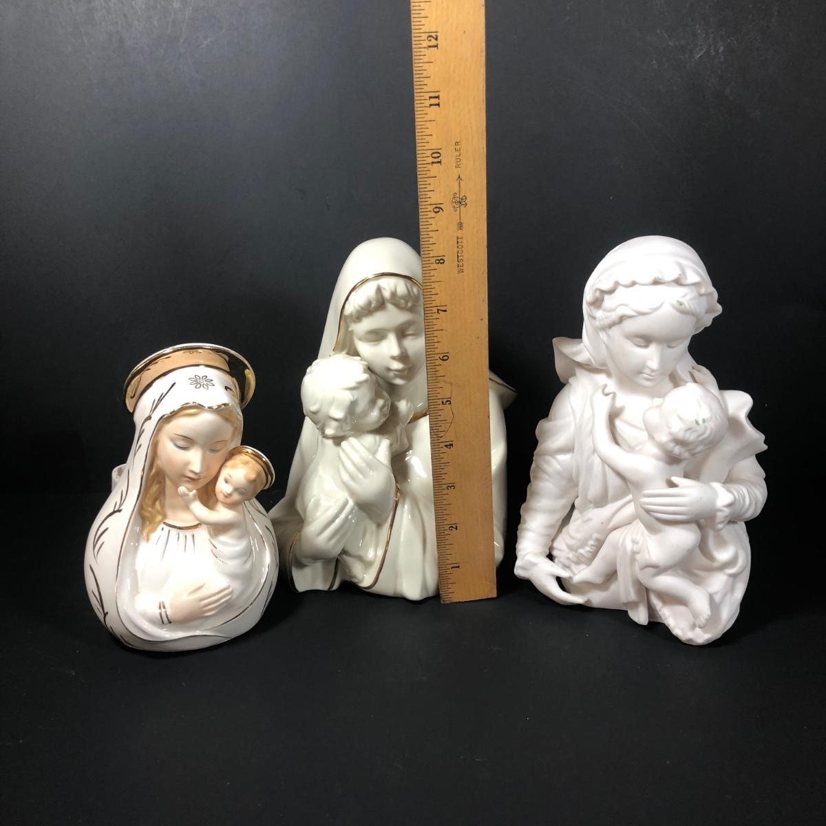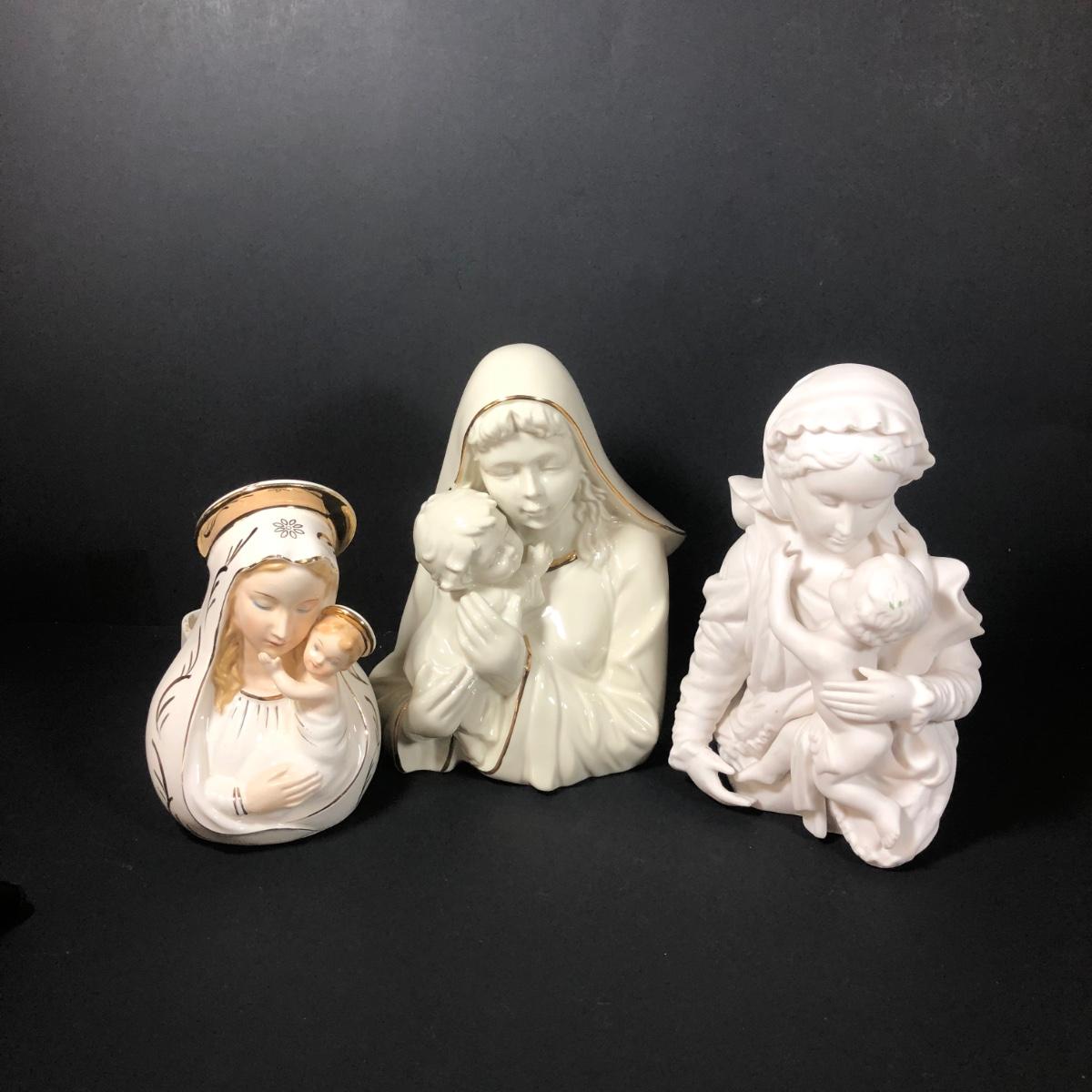 LOT 402G: Religious Porcelain - Vintage Oxidized Virgin Mary & Jesus Statue, Mikasa Accents Madonna & Child Figure & Madonna w/ Child Planter