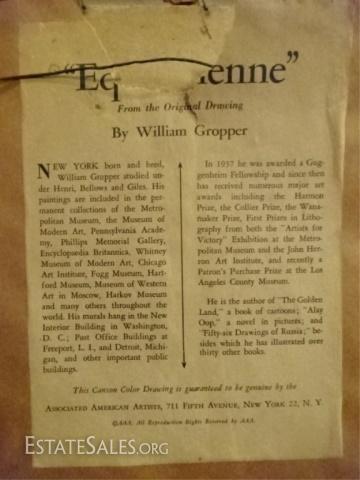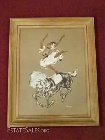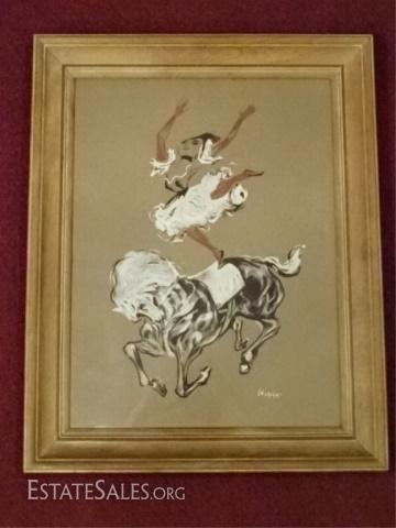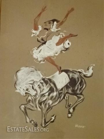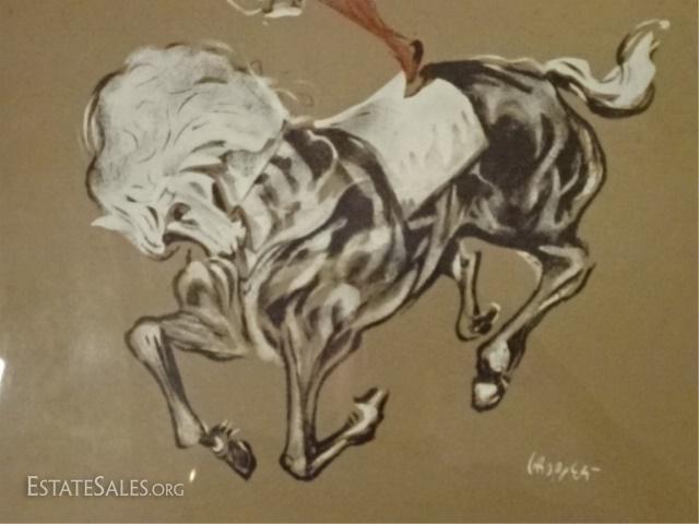 LOT 22D: WILLIAM GROPPER COLOR LITHOGRAPH CIRCA 1950's, "EQUESTRIENNE", FEMALE CIRCUS PERFORMER ON HORSEBACK, WITH COA ON BACK ISSUED BY ASSOCIATED AMERICAN ARTISTS, SIGNED IN THE PLATE, VERY GOOD CONDITION WITH SOME SPOTTING, FRAMED SIZE 29" X 23", SKU300.15