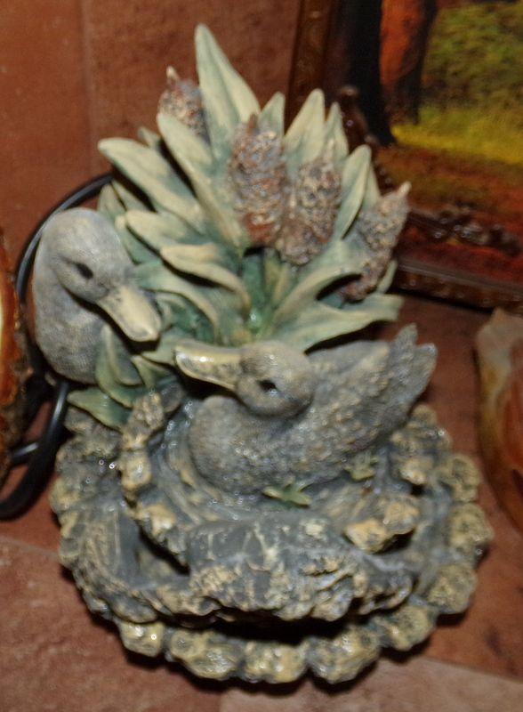 FOUNTAIN (NO PUMP), PLAQUE, SMALL CYLINDER CONTAINER WITH DUCK ON THE LID, 2 SMALL WOODEN DUCKS AND THE LARGEST DUCK IS LIKE A PAPER MACHE