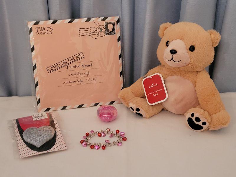 Lot 23: NEW Valentine's Bracelet, Shoe Clips, Gloss, Scarf and Plushie
