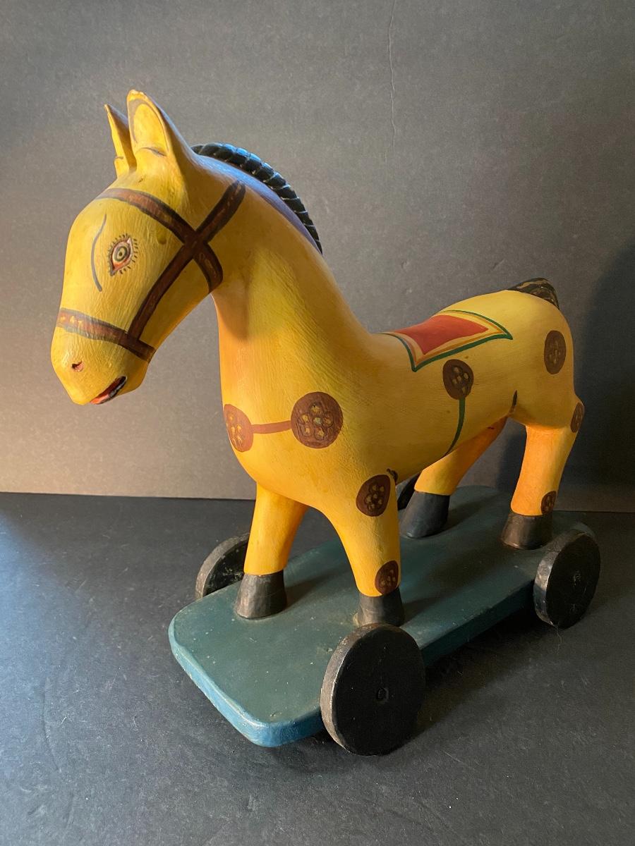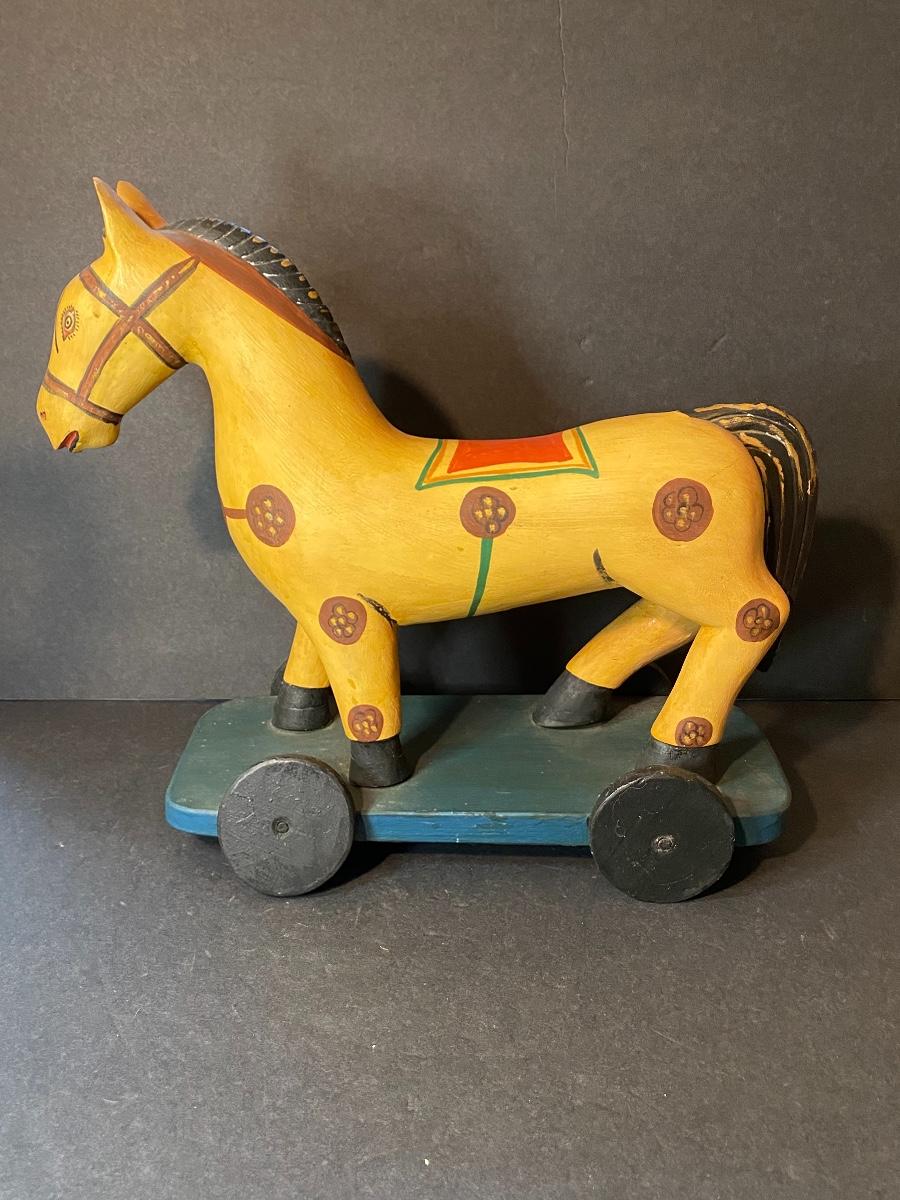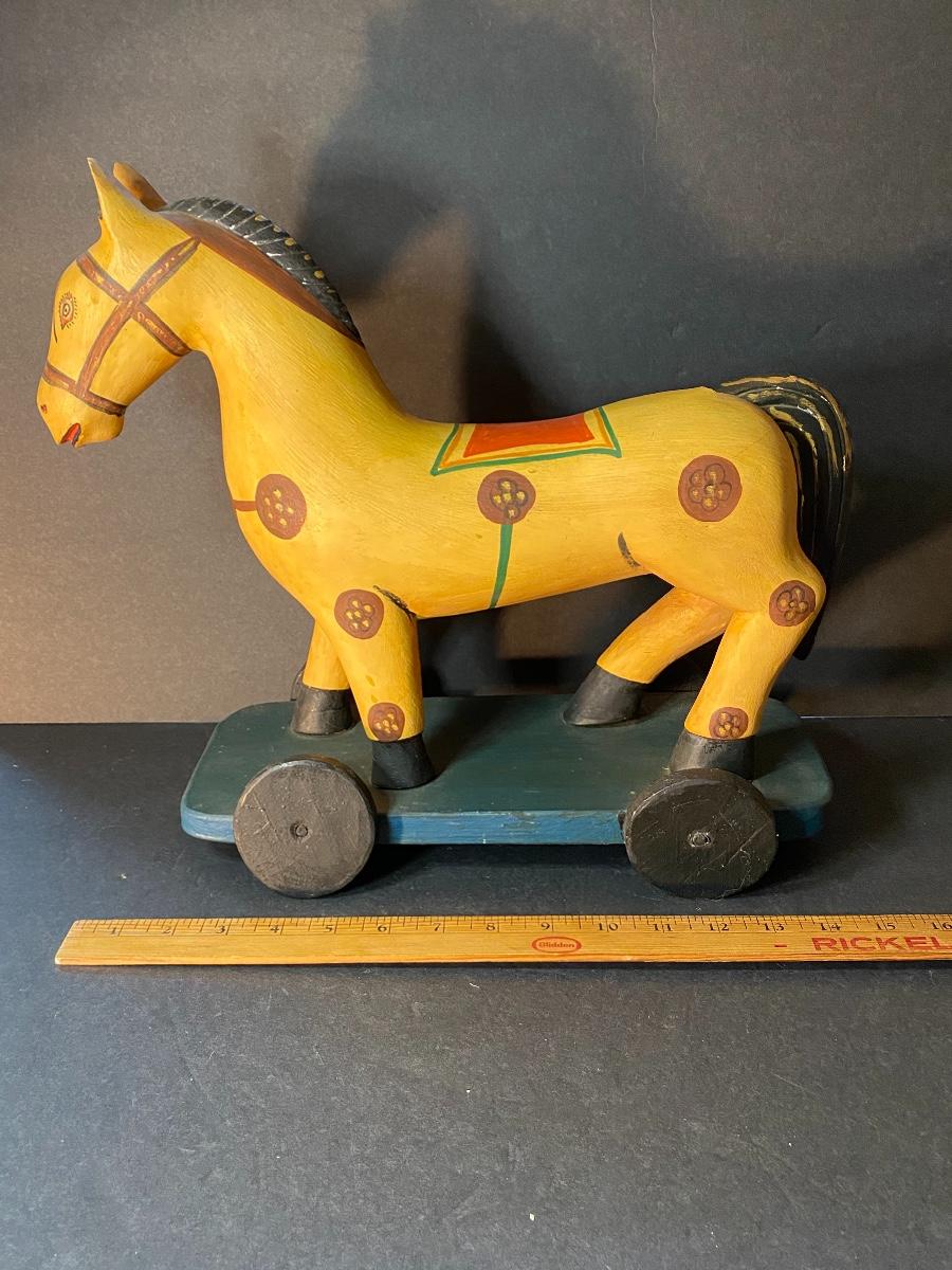 Incredible wood carved horse with primitive paint, not sure of maker or age. Mohair Bear by House of Nesbit, and Velveteen Rabbit Book. Please see pictures as they are the best representation of the item, the condition of the item, and the size of the item.