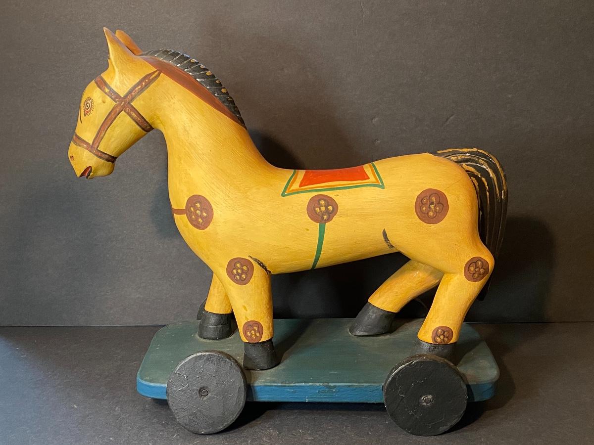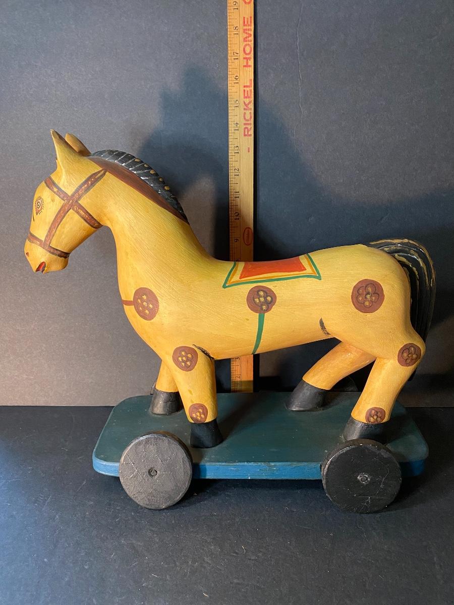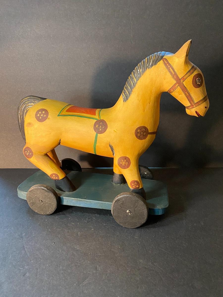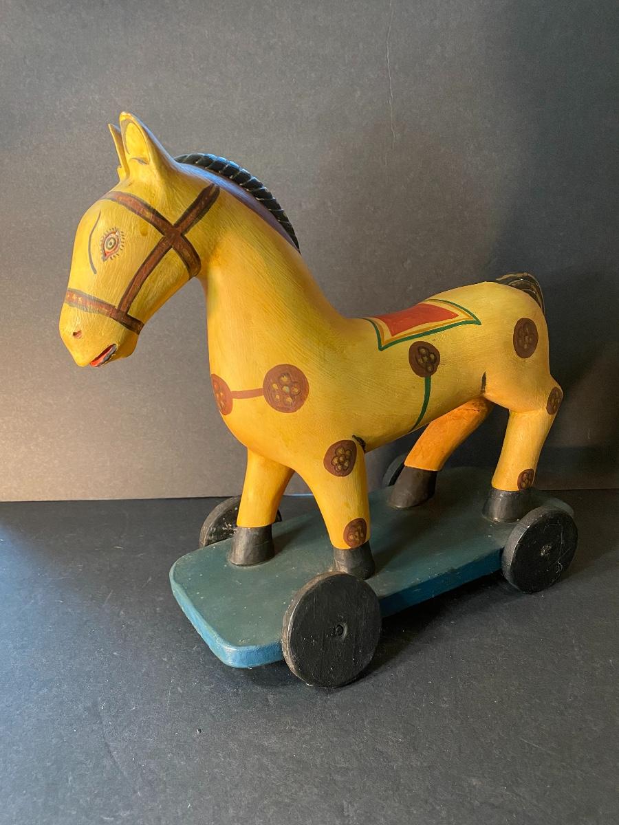 Incredible wood carved horse with primitive paint, not sure of maker or age. Mohair Bear by House of Nesbit, and Velveteen Rabbit Book. Please see pictures as they are the best representation of the item, the condition of the item, and the size of the item.