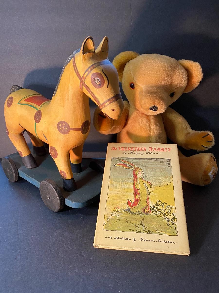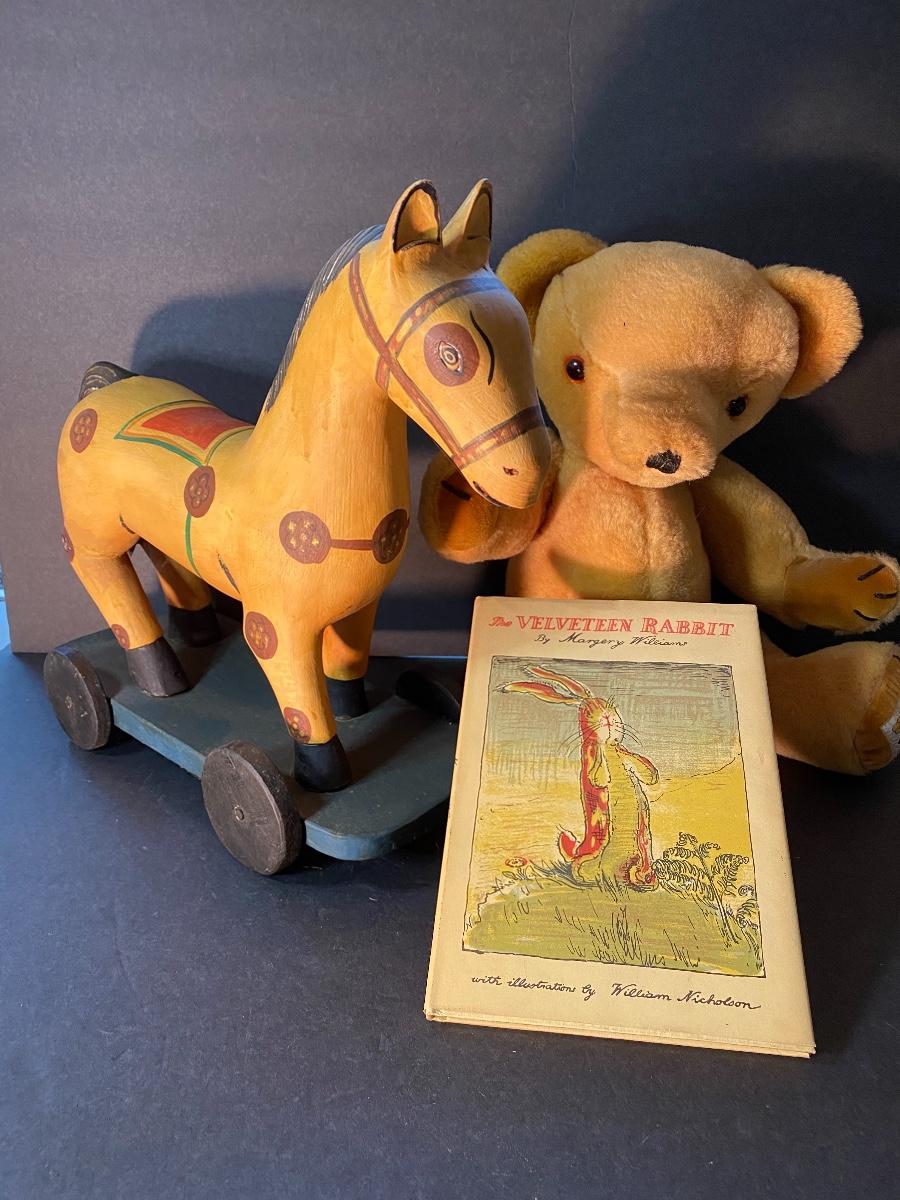 Lot 23: Primitive Wood Carved Horse, House of Nesbit Mohair Bear & Velveteen Rabbit Book