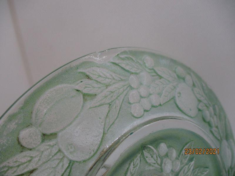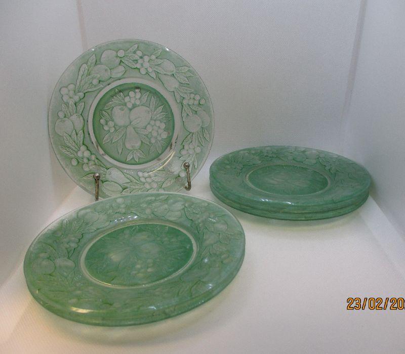 These plates have the look of being uranium, but they are not. They are embossed on the underside with a fruit design. Two plates have a very small fleabite on the rim (one fleabite each) and one of the plates has a chip that is a little bigger, but is flat, smooth, and hard to notice. They are about 6.5" in diameter.
