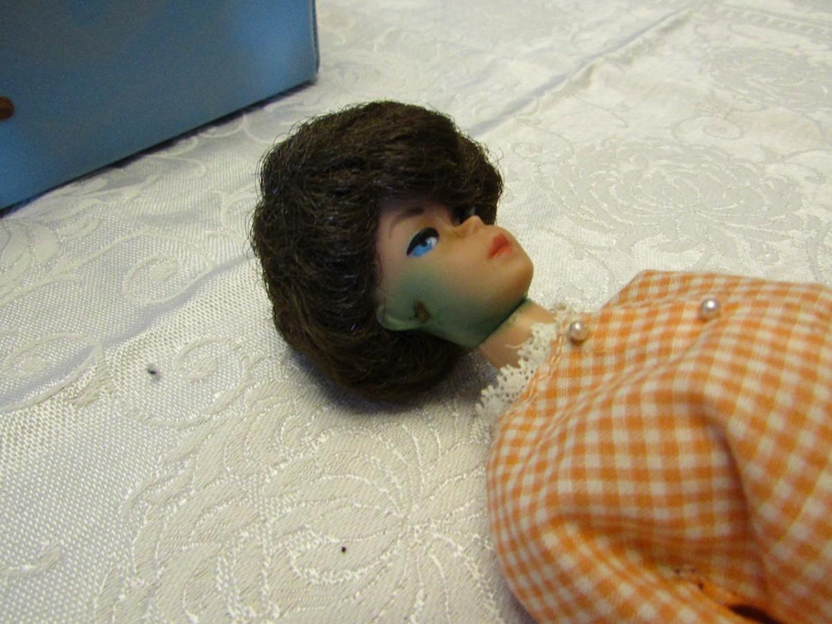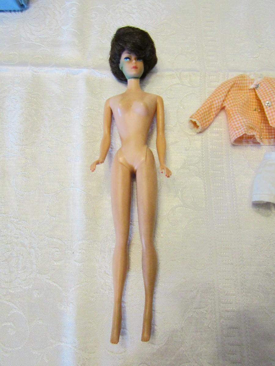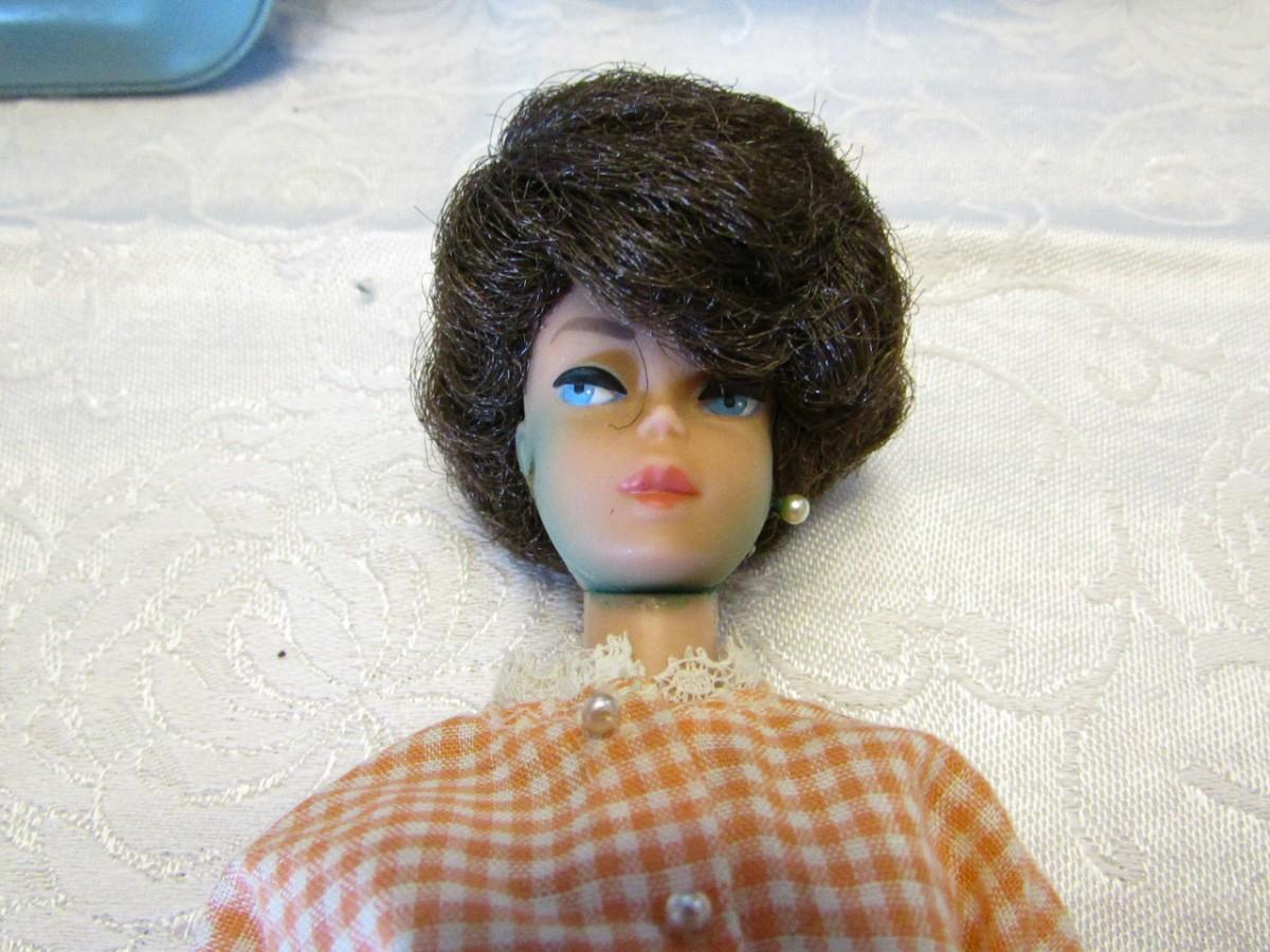 1962 BUBBLE CUT BARBIE (SHE'S THE REAL DEAL!) HER EARRINGS HAVE LEFT TURNED HER HEAD GREEN BUT I DID SOME RESEARCH AND THIS IS A COMMON PROBLEM THAT CAN BE FIXED. GO TO WWW.HOWTOCLEANANYTHING.COM AND SEARCH FOR REMOVING STAIN ON BARBIES FROM THEIR EARRINGS (SOMETHING LIKE THAT) THEY SAID IT CAN COMPLETELY REMOVE THE STAIN OR PRACTICALLY REMOVE