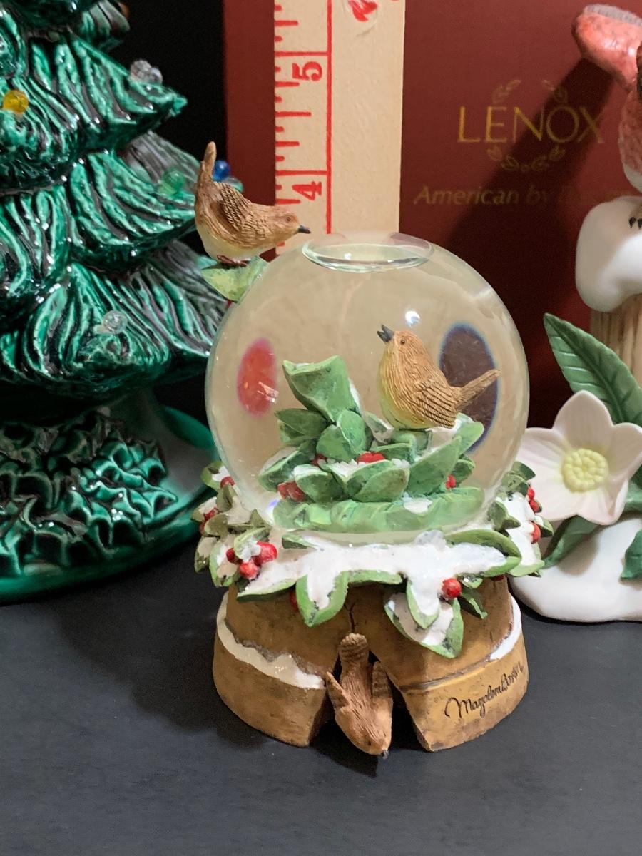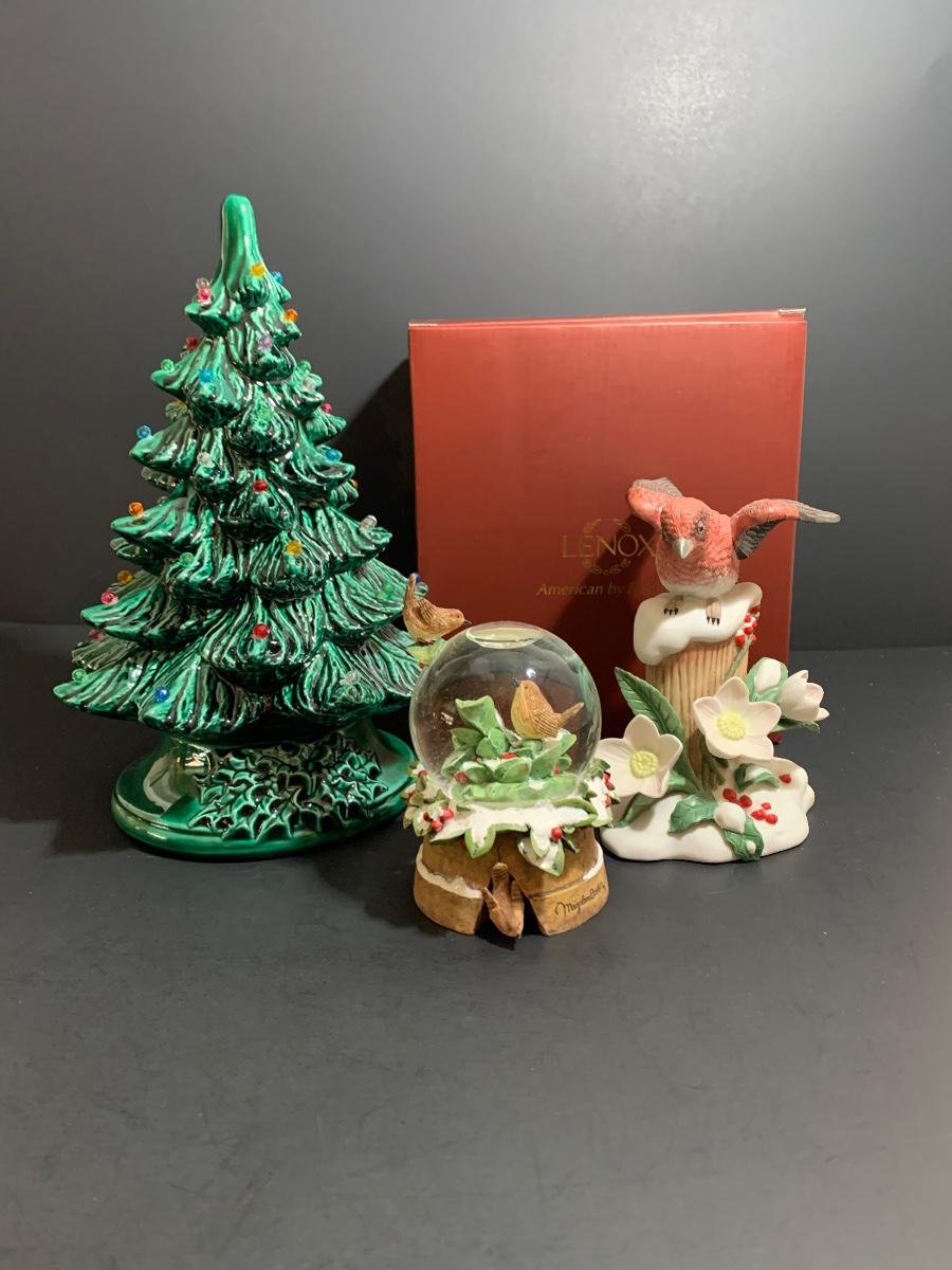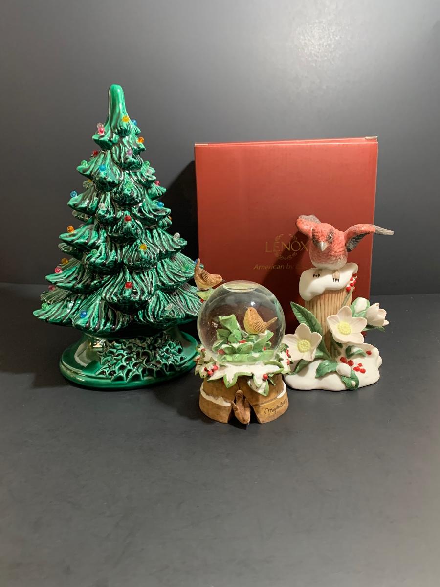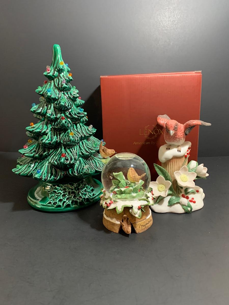 Vintage collection of Holiday Decor: Vintage working, handmade ceramic tree, Marjolein Bastin Hallmark Snowglobe, and a Lenox Christmas Purple Finch (with box)