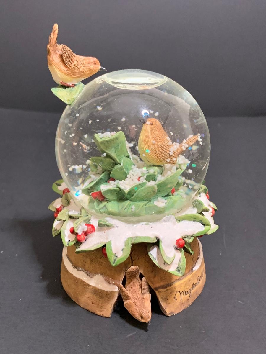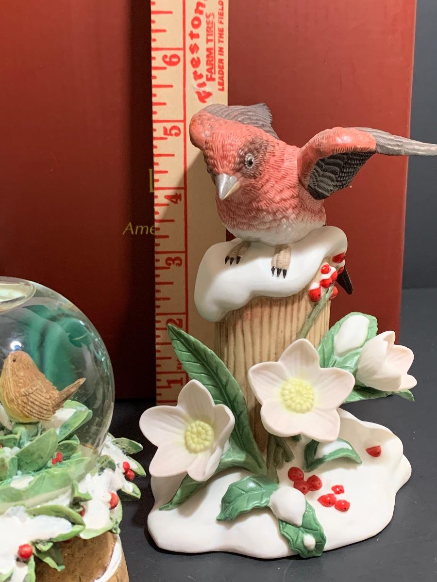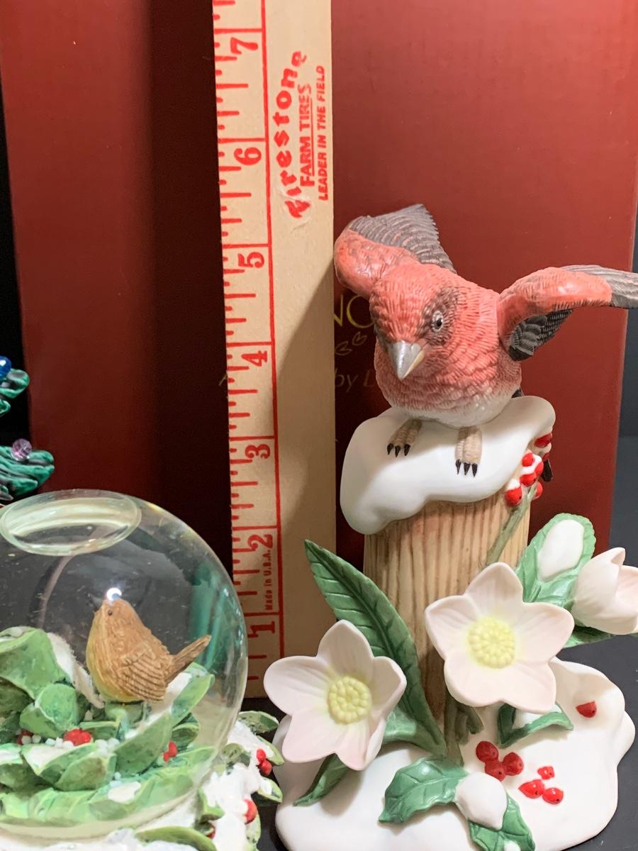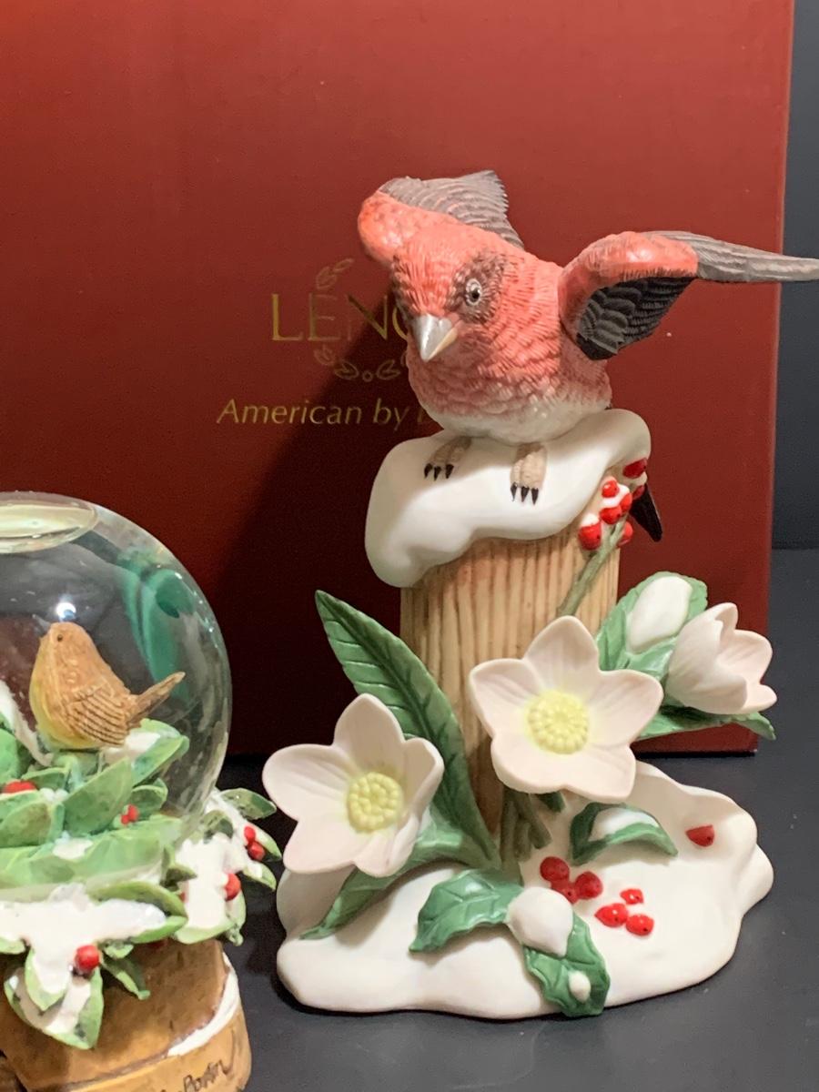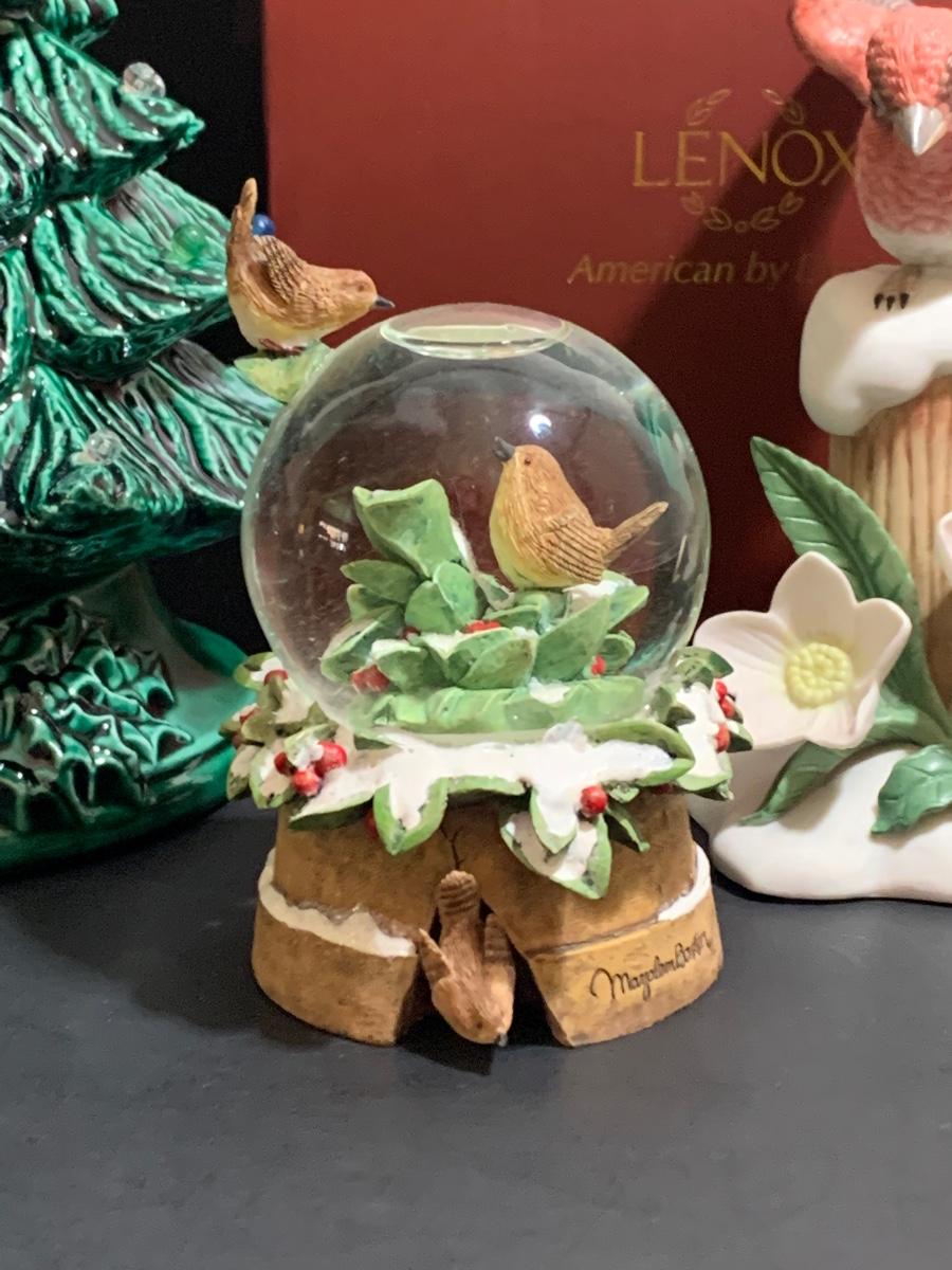 Vintage collection of Holiday Decor: Vintage working, handmade ceramic tree, Marjolein Bastin Hallmark Snowglobe, and a Lenox Christmas Purple Finch (with box)