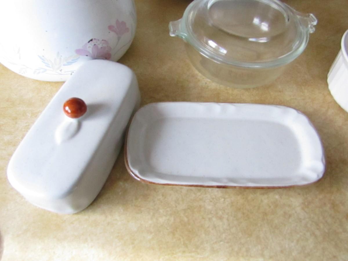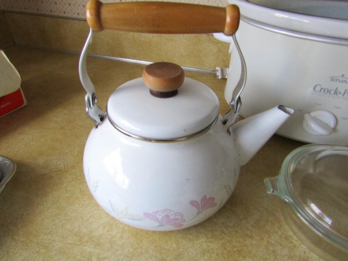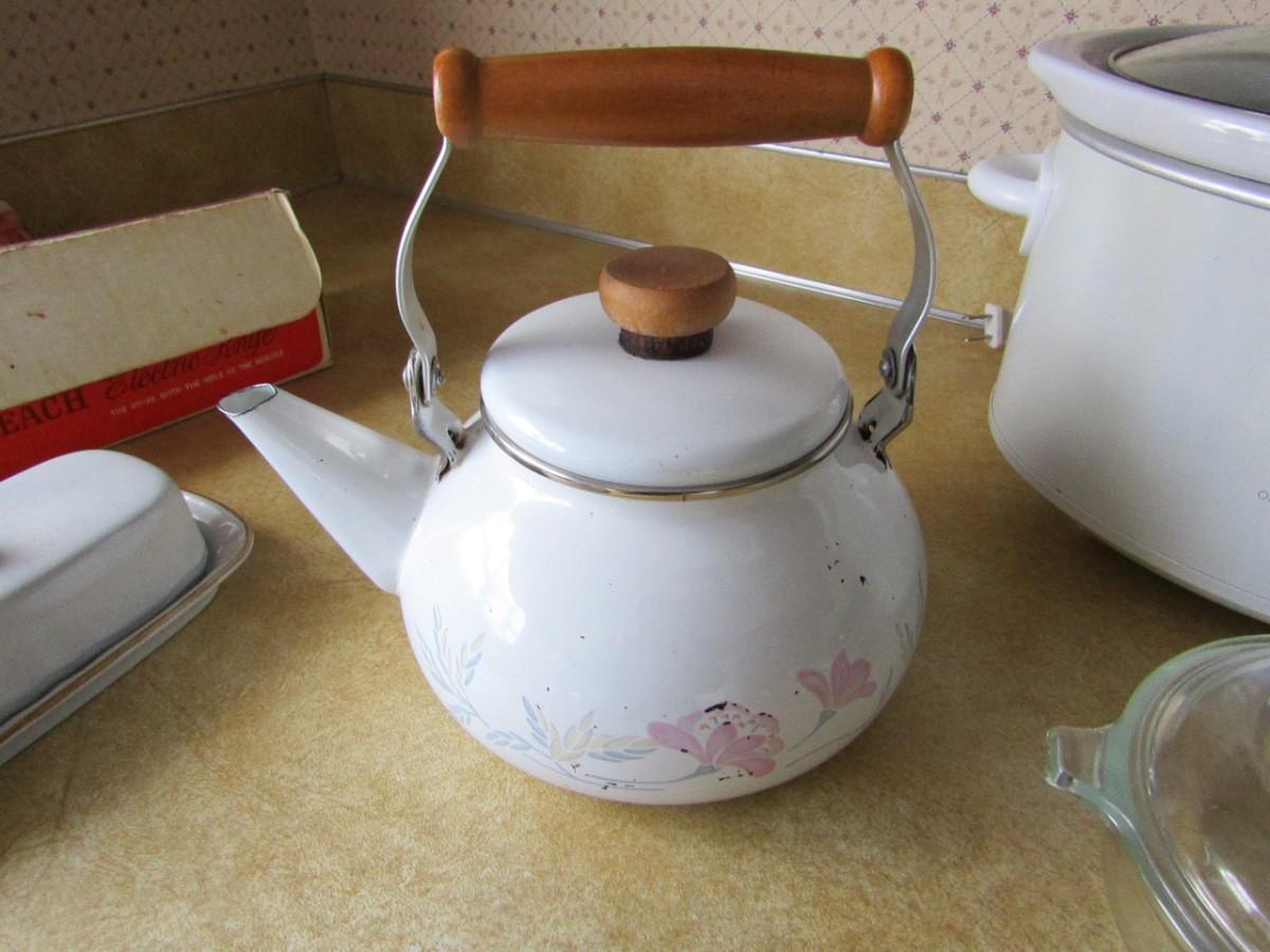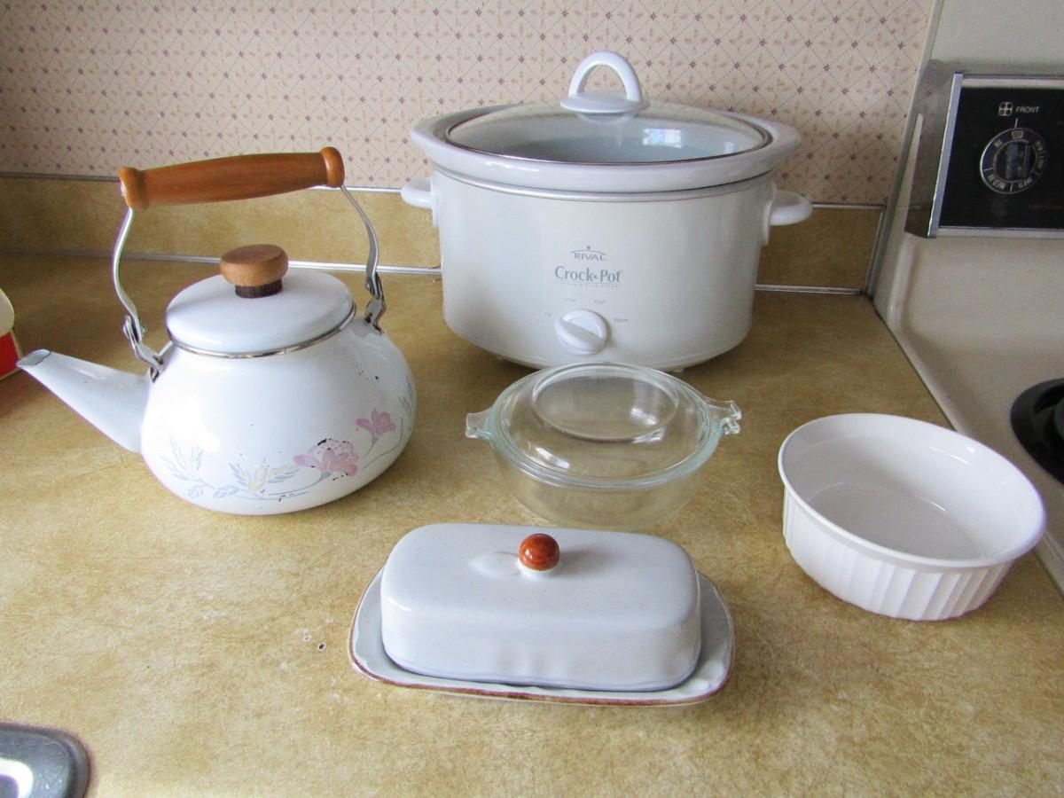 LOT 23 CROCK POT, TEA KETTLE, BUTTER DISH AND MORE