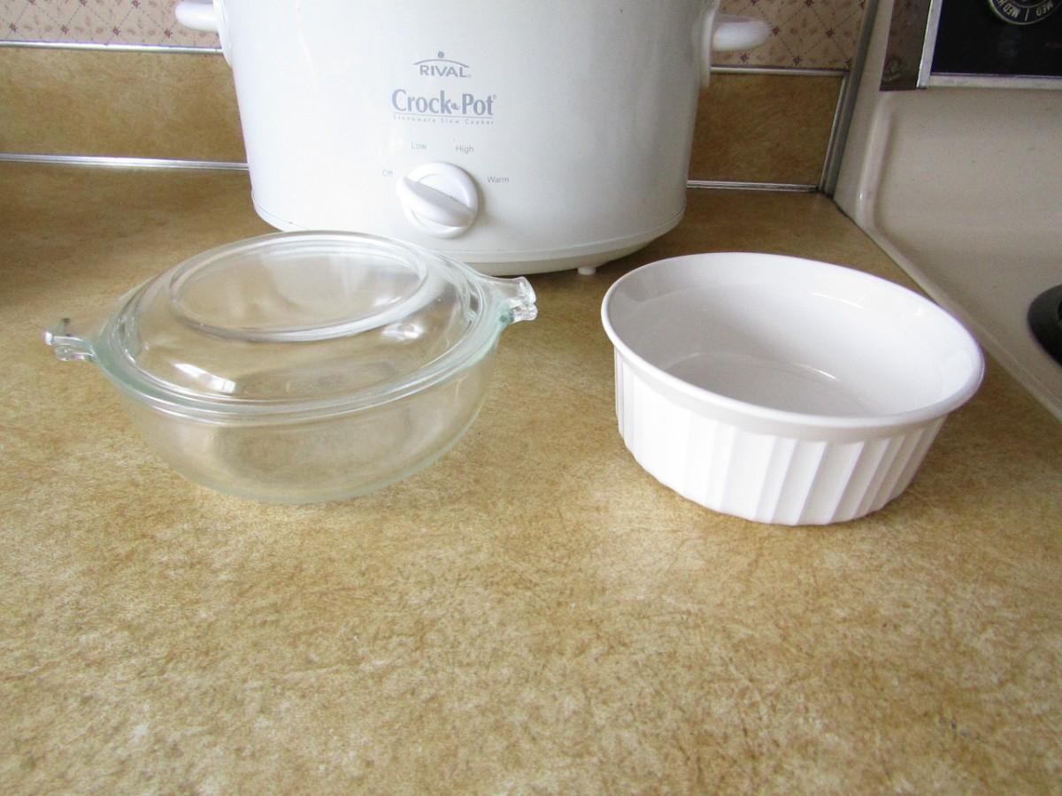 RIVAL CROCK POT, ENAMEL TEA KETTLE THAT HAS SOME SMALL NICKS IN THE ENAMEL, STONE WARE BUTTER DISH AND 2 SMALL CASSEROLE DISHES